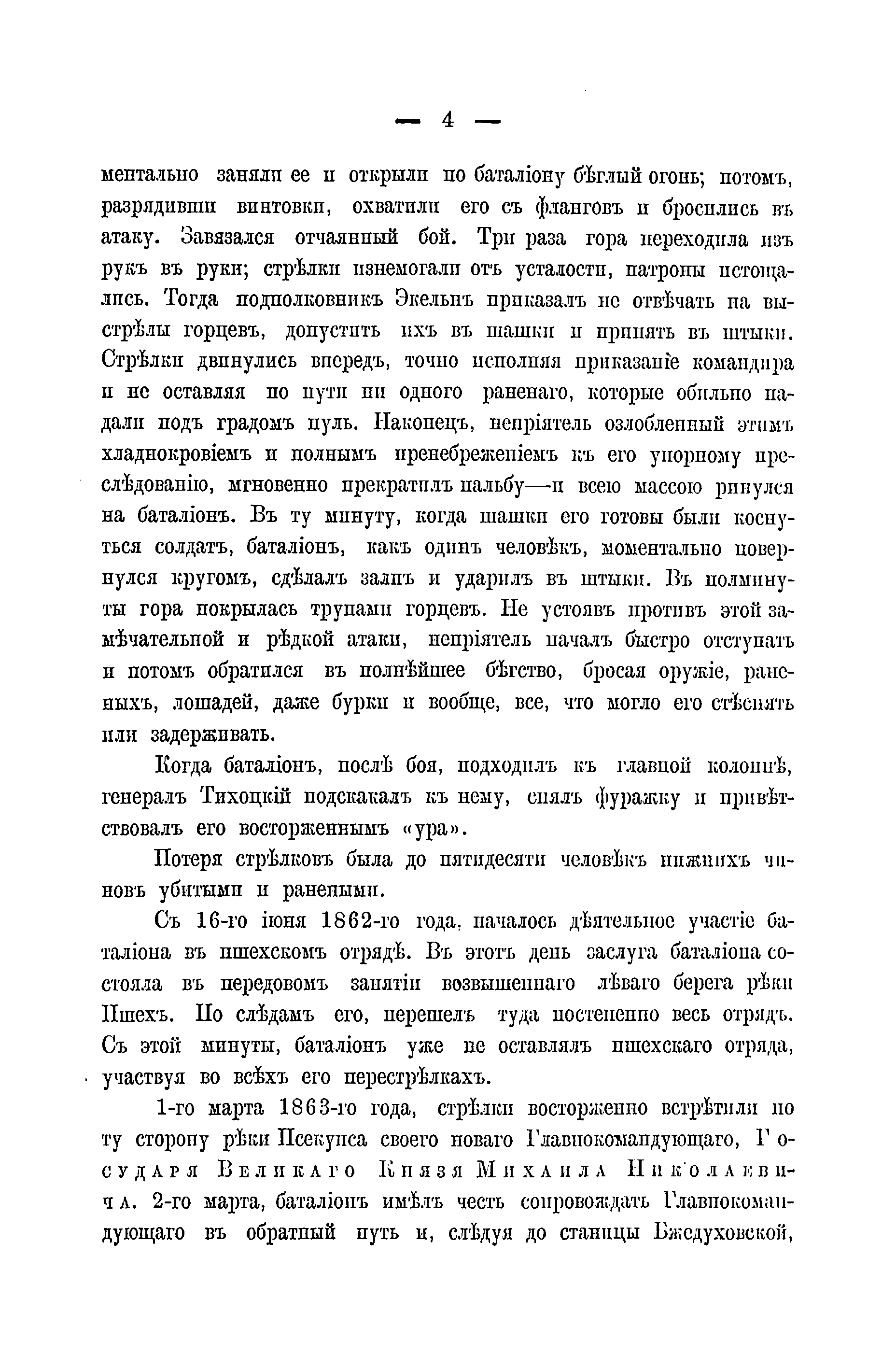 Документальное описание боевых действий батальона и знаменательных исторических событий, связанных с ним, в период Русско-турецкой войны 1877 – 1878 годов. Приведены поименные списки командиров, штаб- и обер-офицеров батальона, нижних чинов, награжденных знаками отличия Военного ордена, с указанием номеров знаков, убитых и раненых офицеров и нижних чинов.