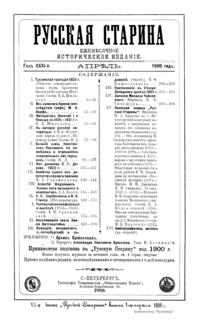 «Русская старина», ежемесячный исторический журнал, выходил в Петербурге в 1870-1918. Основан, издавался и редактировался (1870-1892) М. И. Семевским при участии В. И. Семевского. Последующими редакторами были Н. К. Шильдер (1892-1896), Н. Ф. Дубровин (1896-1904), военные историки С. П. Зыков, П. Н. Воронов.