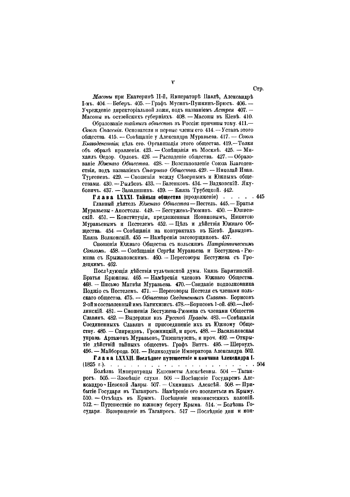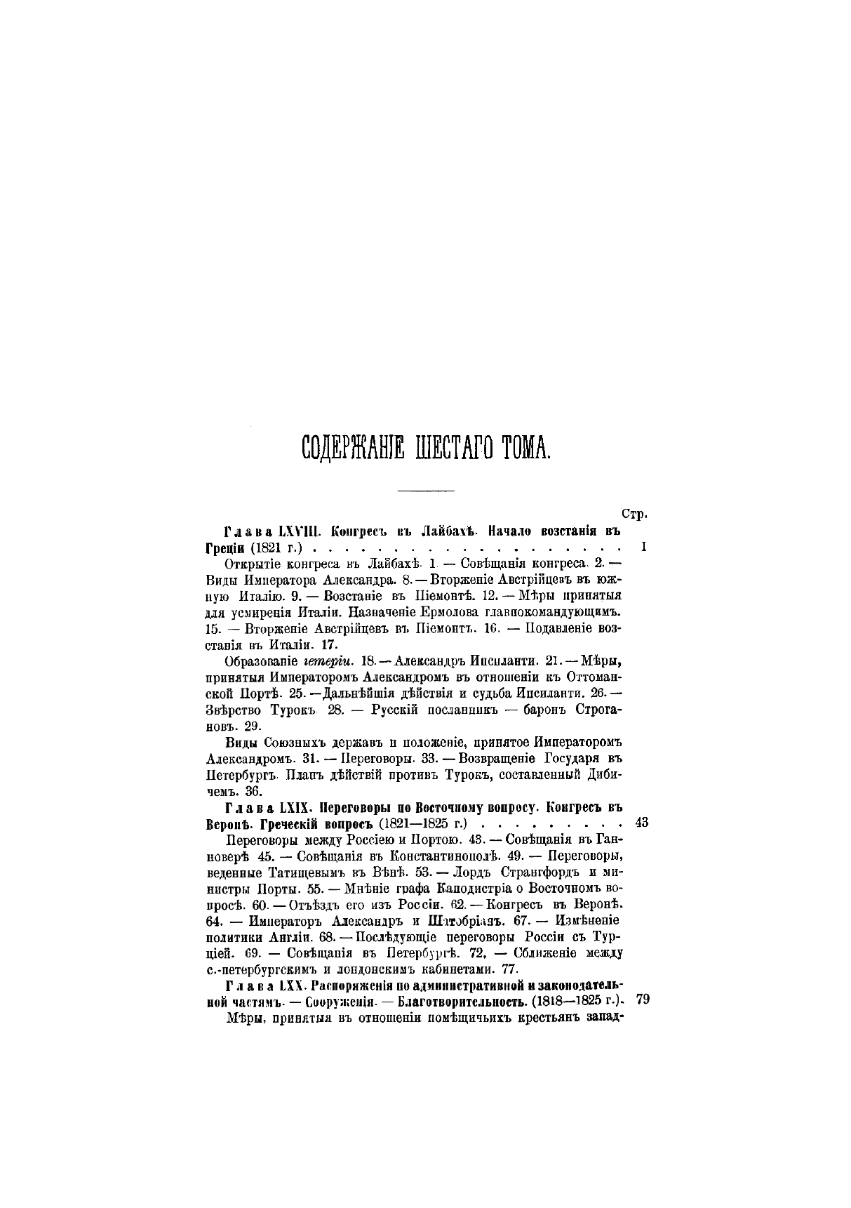 «История царствования императора Александра I и России в его время» вышла в свет в 1869–1871 гг. Ее автор, Богданович Модест Иванович (1805–1882), — генерал-лейтенант, военный писатель. В 1831 г. участвовал в сражениях под Вавром, Гроховым, Дембе-Вельке и Рагозиным. Пройдя курс в военной академии, занял в ней кафедру военной истории и стратегии, был членом Военного совета, официальным военным историографом. Оставил после себя множество военно-исторических и исторических трудов, в которых интересуется, главным образом, политической историей; его попытки критически отнестись к создавшимся легендам были встречены официальными историками весьма недоброжелательно. Повествование разделено на две части: первая, заключающаяся в I–IV томах, охватывает события 1801–1815 гг.; вторая — V, VI тома — содержит исторический период после 1815 г. до кончины Александра I в 1825 г. При создании книги Богданович использовал сведения из государственных архивов, а также до того не издававшиеся документы: бумаги императора Александра I, графа П. А. Строганова, записки адмирала А. С. Шишкова, журнал морских походов Д. Н. Сенявина и др. Полный список источников, печатных книг и рукописей, приведен в конце шестого тома. Богатый фактический материал иллюстрируют карты театров военных действий и планы главных сражений.