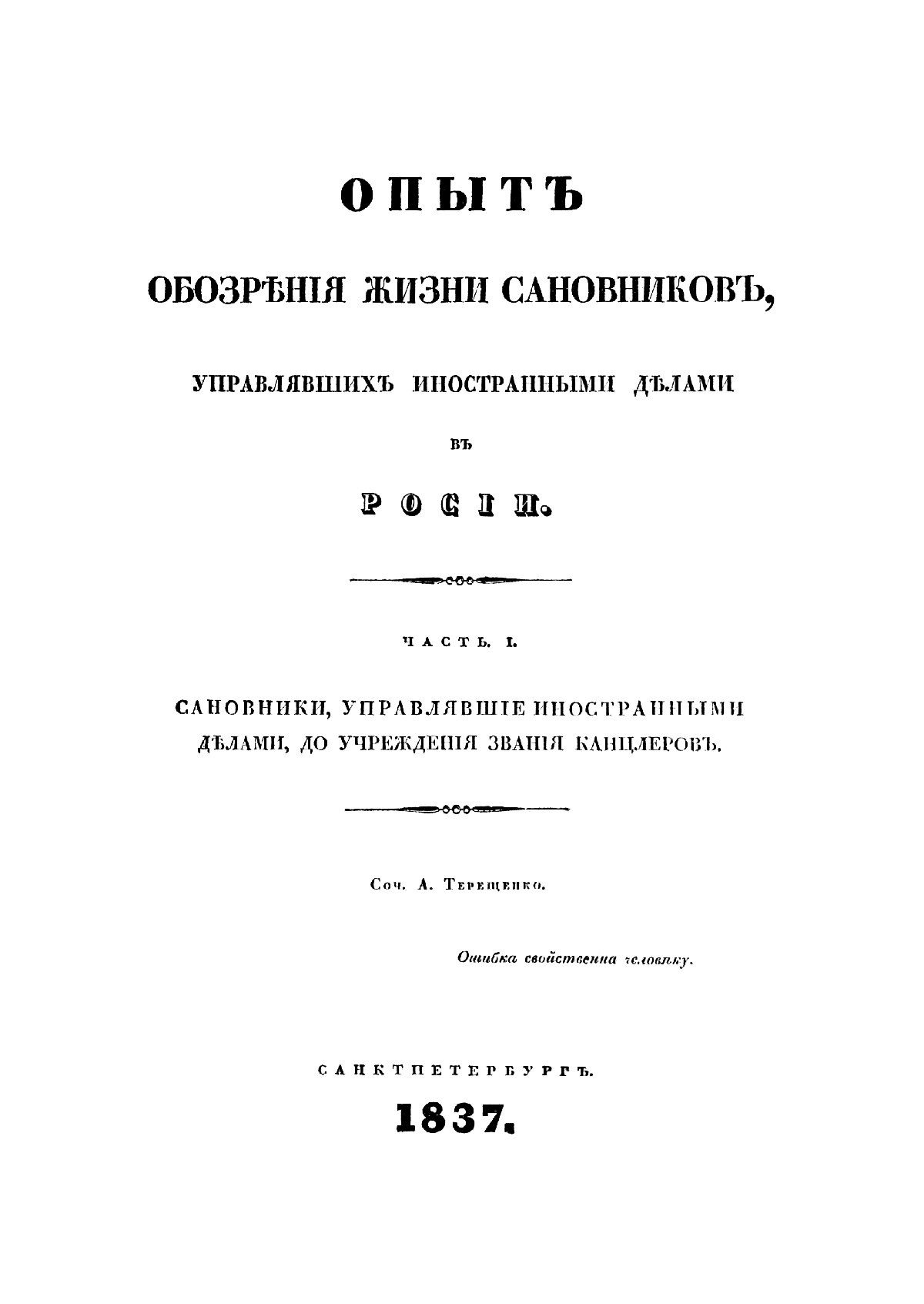 Терещенко Александр Власьевич (1806–1865) — этнограф и археолог, был сотрудником Археографической комиссии. Главные его труды: «Опыт обозрения жизни сановников, управлявших иностранными делами в России», «Быт русского народа», «Очерки Новороссийского края». «Опыт обозрения жизни сановников» состоит из трех частей. Первая часть посвящена сановникам, управлявшим иностранными делами до учреждения звания канцлеров, вторая — канцлерам, третья — вице-канцлерам. В издании полно представлены жизнеописания виднейших русских дипломатов — А. Л. Ордын-Нащокина, А. С. Матвеева, В. В. Голицына, А. П. Бестужева-Рюмина, Н. П. Румянцева, В. П. Кочубея, А. Б. Куракина и многих других. Автор уделяет внимание не только успехам именитых сановников на внешнеполитическом поприще, но и рассказывает об их происхождении, семье, характере, привычках.