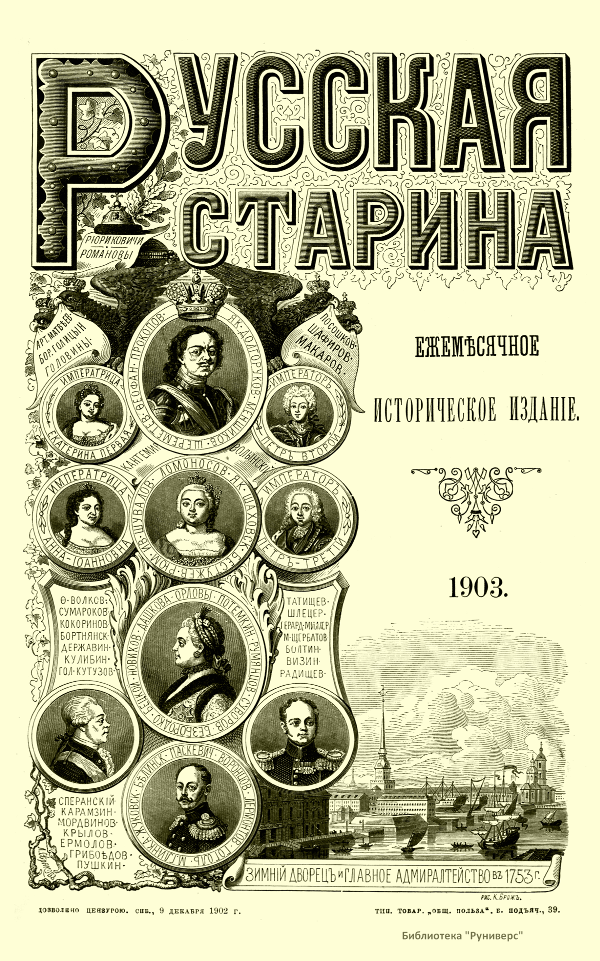 «Русская старина», ежемесячный исторический журнал, выходил в Петербурге в 1870-1918. Основан, издавался и редактировался (1870-1892) М. И. Семевским при участии В. И. Семевского. Последующими редакторами были Н. К. Шильдер (1892-1896), Н. Ф. Дубровин (1896-1904), военные историки С. П. Зыков, П. Н. Воронов.