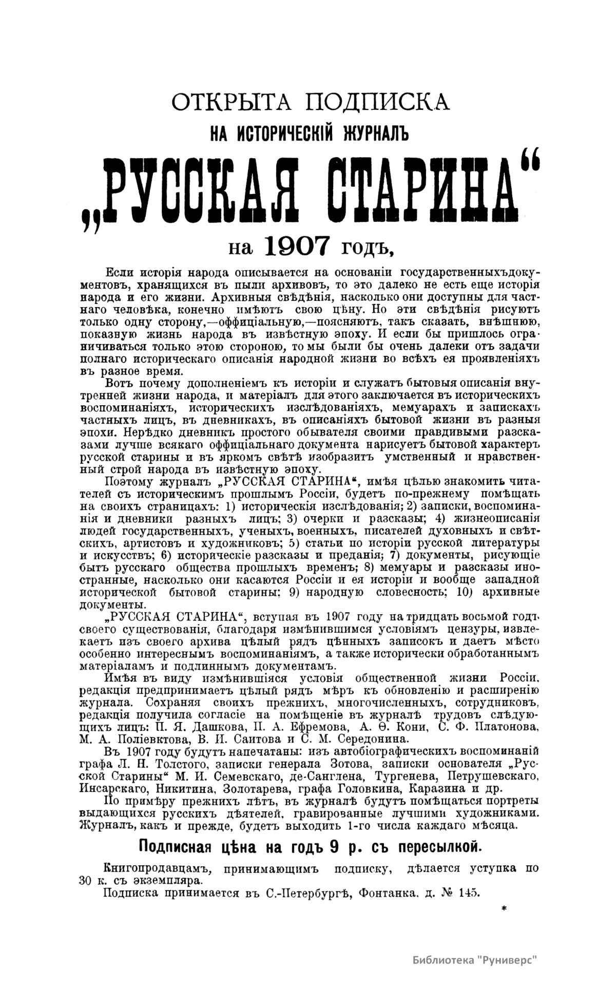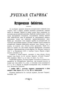 «Русская старина», ежемесячный исторический журнал, выходил в Петербурге в 1870-1918. Основан, издавался и редактировался (1870-1892) М. И. Семевским при участии В. И. Семевского. Последующими редакторами были Н. К. Шильдер (1892-1896), Н. Ф. Дубровин (1896-1904), военные историки С. П. Зыков, П. Н. Воронов.