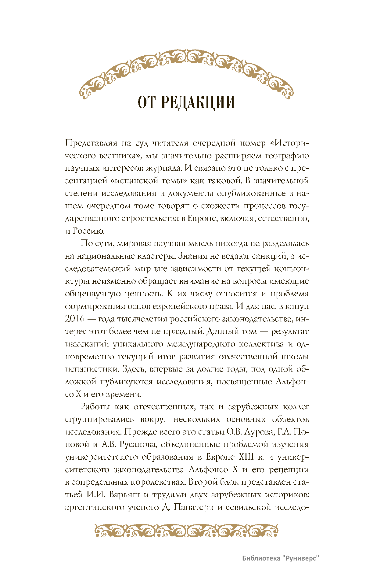 Дорогие коллеги, мы представляем вам первый номер «Исторического вестника», который одновременно обозначается 148-м томом, тем самым продолжая дореволюционное издание. Однако, перешагивая почти сто лет, мы понимаем, что реалии XXI века определяют и новое содержание журнала. История сегодня во многом актуализирована политикой. Именно геополитическая ситуация в мире, возвращающая нас к вопросам сохранения существующих границ, национальных и культурных ценностей, моральных и религиозных принципов, формирует еще одно измерение — проблему аутентичного исторического бытования народов и государств. С одной стороны, это вопрос географических ареалов государственных образований, с другой — тема, связанная с соприкосновением, взаимодействием процессов, культур и традиций. Во многом мы стоим и перед важнейшей этической проблемой. Мы должны не только вежливо и настойчиво указывать нашим уважаемым соседям на свои исторические права, но и сами уходить от искушения искусственного удревнения собственной истории или присвоения чужой. И здесь на сцену выходит его величество Исторический Научный Факт. Он и есть главный цензор и законодатель. На этом незыблемом основании будет строиться редакционная и научная работа «Исторического вестника».