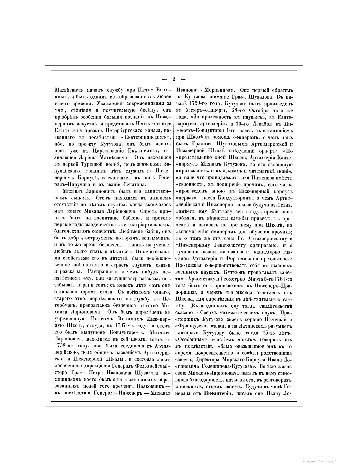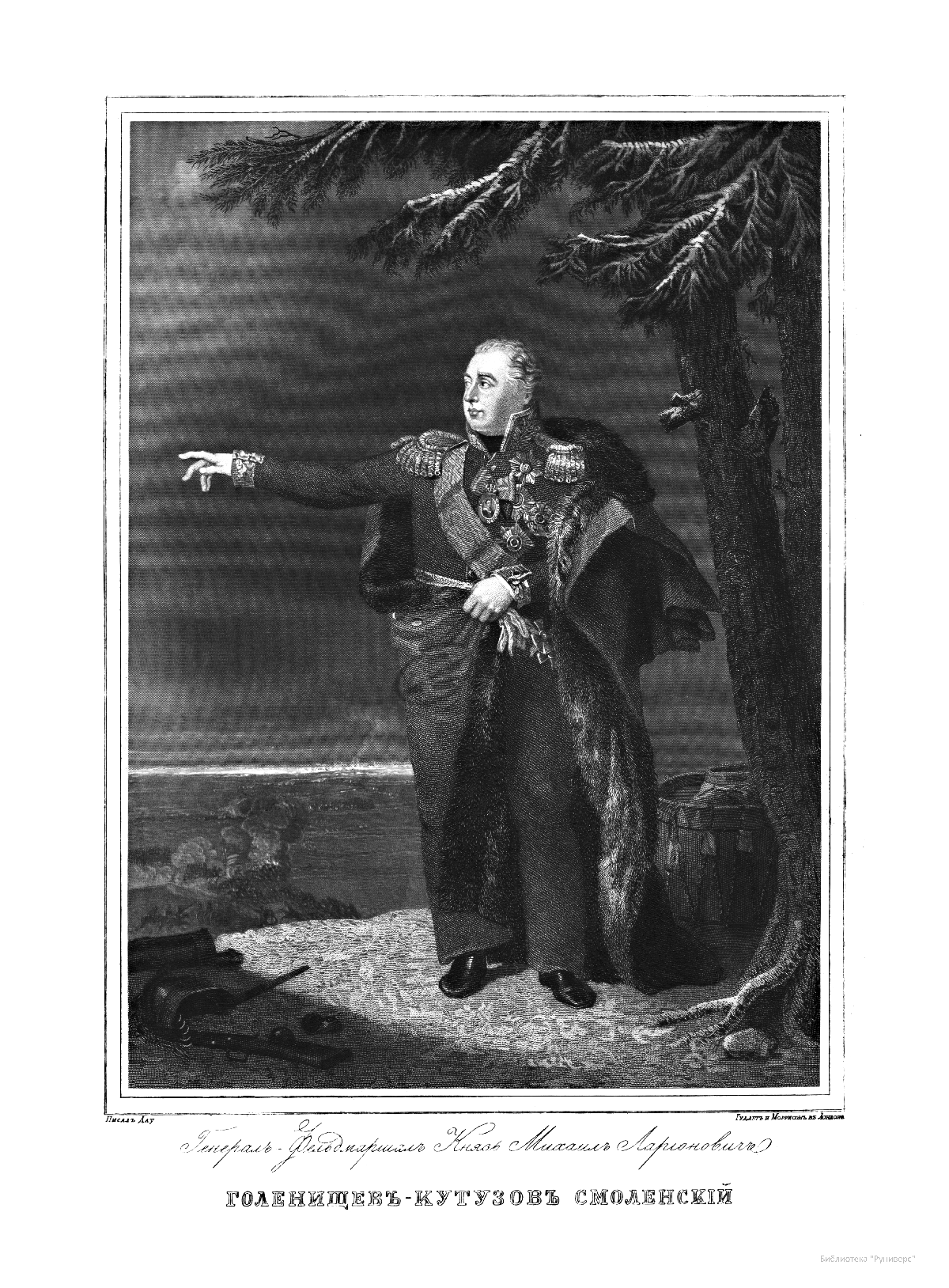 Александр Иванович Михайловский-Данилевский (1790–1848) — участник Отечественной войны 1812 г., генерал-лейтенант, военный историк и академик Санкт-Петербургской академии наук. Автор многих трудов по истории войн Российской империи. В последние годы своей жизни А. И. Михайловский-Данилевский был главным редактором «Военной галереи Зимнего дворца». Война 1812 г. получила название Отечественной и стала ярчайшей страницей российской истории и культуры. В Зимнем дворце столицы император Александр I повелел создать Военную галерею 1812 г. Ни в одном из дворцов Европы не существовало портретной галереи подобной той, что должна была украсить парадную резиденцию русских императоров. В Военной галерее Зимнего дворца должны были разместиться более 300 портретов, для исполнения которых в Петербург весной 1819 г. приехал известный английский живописец Джордж Доу (Даву). В создании портретной галереи принимали участие и русские художники — В. А. Голике, А. В. Поляков. Торжественное открытие галереи состоялось уже в царствование Николая I, в годовщину изгнания французов из России, 25 декабря 1826 г. Шеститомное издание «Император Александр I и его сподвижники в 1812, 1813, 1814 и 1815 гг.: Военная галерея Зимнего дворца, издаваемая с высочайшего соизволения» выходило на протяжении 1845–1849 гг. в петербургской типографии Карла Крайя. Издание объединило портреты и биографии российских генералов, участвовавших в Отечественной войне и заграничных походах. Главным редактором, а также составителем многих биографий стал А. И. Михайловский-Данилевский. Портреты с живописных оригиналов были гравированы на стали парижскими художниками Гюо и Долле. На страницах издания почетное место отведено императору Александру I, представлены биографии и портреты М. И. Кутузова, М. Б. Барклая-де-Толли, вел. кн. Константина Павловича, А. А. Аракчеева, П. П. Коновницына, Д. П. Немировского, Д. С. Дохтурова, П. И. Багратиона, Н. Н. Раевского, А. П. Ермолова, М. И. Платова и многих других героев. Труд А. И. Михайловского-Данилевского содержит обширный документальный и мемуарный материал, представляет подробное описание и анализ военных действий России и Франции на протяжении Отечественной войны 1812 г.