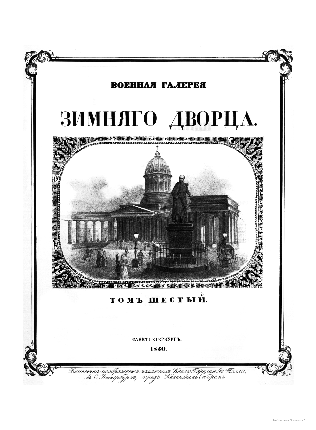 Александр Иванович Михайловский-Данилевский (1790–1848) — участник Отечественной войны 1812 г., генерал-лейтенант, военный историк и академик Санкт-Петербургской академии наук. Автор многих трудов по истории войн Российской империи. В последние годы своей жизни А. И. Михайловский-Данилевский был главным редактором «Военной галереи Зимнего дворца». Война 1812 г. получила название Отечественной и стала ярчайшей страницей российской истории и культуры. В Зимнем дворце столицы император Александр I повелел создать Военную галерею 1812 г. Ни в одном из дворцов Европы не существовало портретной галереи подобной той, что должна была украсить парадную резиденцию русских императоров. В Военной галерее Зимнего дворца должны были разместиться более 300 портретов, для исполнения которых в Петербург весной 1819 г. приехал известный английский живописец Джордж Доу (Даву). В создании портретной галереи принимали участие и русские художники — В. А. Голике, А. В. Поляков. Торжественное открытие галереи состоялось уже в царствование Николая I, в годовщину изгнания французов из России, 25 декабря 1826 г. Шеститомное издание «Император Александр I и его сподвижники в 1812, 1813, 1814 и 1815 гг.: Военная галерея Зимнего дворца, издаваемая с высочайшего соизволения» выходило на протяжении 1845–1849 гг. в петербургской типографии Карла Крайя. Издание объединило портреты и биографии российских генералов, участвовавших в Отечественной войне и заграничных походах. Главным редактором, а также составителем многих биографий стал А. И. Михайловский-Данилевский. Портреты с живописных оригиналов были гравированы на стали парижскими художниками Гюо и Долле. На страницах издания почетное место отведено императору Александру I, представлены биографии и портреты М. И. Кутузова, М. Б. Барклая-де-Толли, вел. кн. Константина Павловича, А. А. Аракчеева, П. П. Коновницына, Д. П. Немировского, Д. С. Дохтурова, П. И. Багратиона, Н. Н. Раевского, А. П. Ермолова, М. И. Платова и многих других героев. Труд А. И. Михайловского-Данилевского содержит обширный документальный и мемуарный материал, представляет подробное описание и анализ военных действий России и Франции на протяжении Отечественной войны 1812 г.