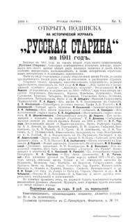 «Русская старина», ежемесячный исторический журнал, выходил в Петербурге в 1870-1918. Основан, издавался и редактировался (1870-1892) М. И. Семевским при участии В. И. Семевского. Последующими редакторами были Н. К. Шильдер (1892-1896), Н. Ф. Дубровин (1896-1904), военные историки С. П. Зыков, П. Н. Воронов.