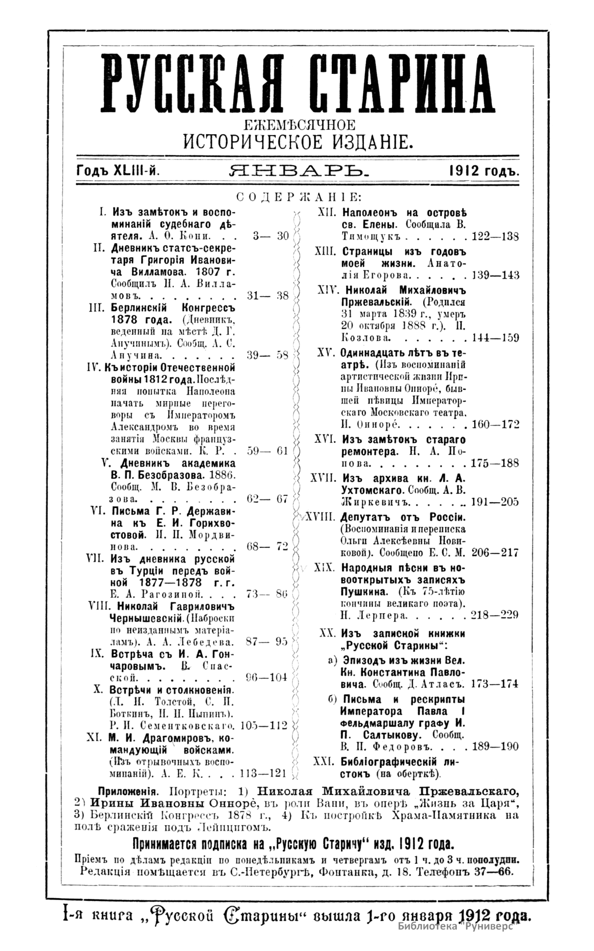 На страницах «Русской старины» напечатаны думы, послания, эпиграммы К. Ф. Рылеева, басни И. А. Крылова, И. И. Хемницера, Измайлова, стихотворения графа А. К. Толстого, К. Р., Я. Б. Княжнина, А. Н. Нахимова, К. П. Батюшкова, барона Дельвига, Розенгейма, В. А. Жуковского, М. Ю. Лермонтова, А. И. Одоевского, Кюхельбекера, Баратынского, вновь найденные строфы из «Евгения Онегина» и отрывки из «Мертвых душ», а также автобиографии и переписки писателей, под редакцией П. А. Ефремова. Статьи и исследования по вопросам новейшей русской истории принадлежат самому М. И. Семевскому, В. А. Бильбасову, А. П. Брикнеру, князю Н. С. Голицыну, Д. И. Иловайскому, П. И. Карцову, барону Н. А. Корфу, Н. И. Костомарову, И. И. Ореусу, А. Н. Петрову, В. И. Семевскому, Н. К. Шильдеру и др.К журналу выпущены отдельные издания: Указатель «Русская старина».СПб, 1883 г . (1 том), «Систематическая роспись содержания «Русской старины» за 1870-1884 гг.» (СПб., 1885), и четыре прибавления: за 1885-1887 гг. (СПб., 1888), за 1888-1890 гг. (СПб., 1891), за 1891-1896 гг. (СПб., 1897), за 1896-1902 гг. (СПб., 1903) (5 изданий в 3-х томах), сборник гравюр «Русские деятели в портретах изданных редакциею исторического журнала «Русская старина». СПб, 1886-1891 гг.(5 изданий, 2 тома).