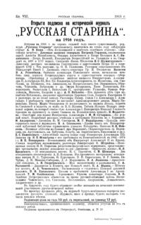 «Русская старина», ежемесячный исторический журнал, выходил в Петербурге в 1870-1918. Основан, издавался и редактировался (1870-1892) М. И. Семевским при участии В. И. Семевского. Последующими редакторами были Н. К. Шильдер (1892-1896), Н. Ф. Дубровин (1896-1904), военные историки С. П. Зыков, П. Н. Воронов.