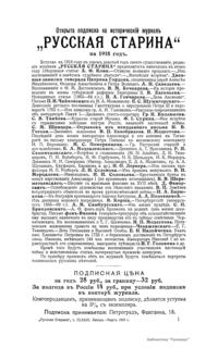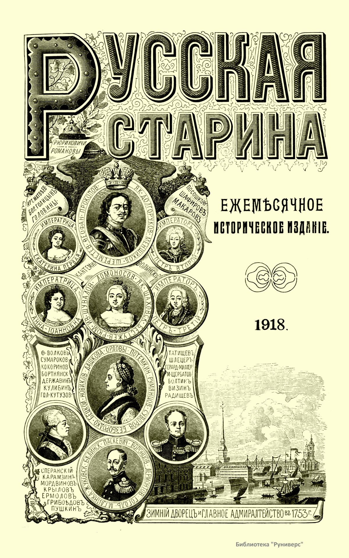 «Русская старина», ежемесячный исторический журнал, выходил в Петербурге в 1870-1918. Основан, издавался и редактировался (1870-1892) М. И. Семевским при участии В. И. Семевского. Последующими редакторами были Н. К. Шильдер (1892-1896), Н. Ф. Дубровин (1896-1904), военные историки С. П. Зыков, П. Н. Воронов.