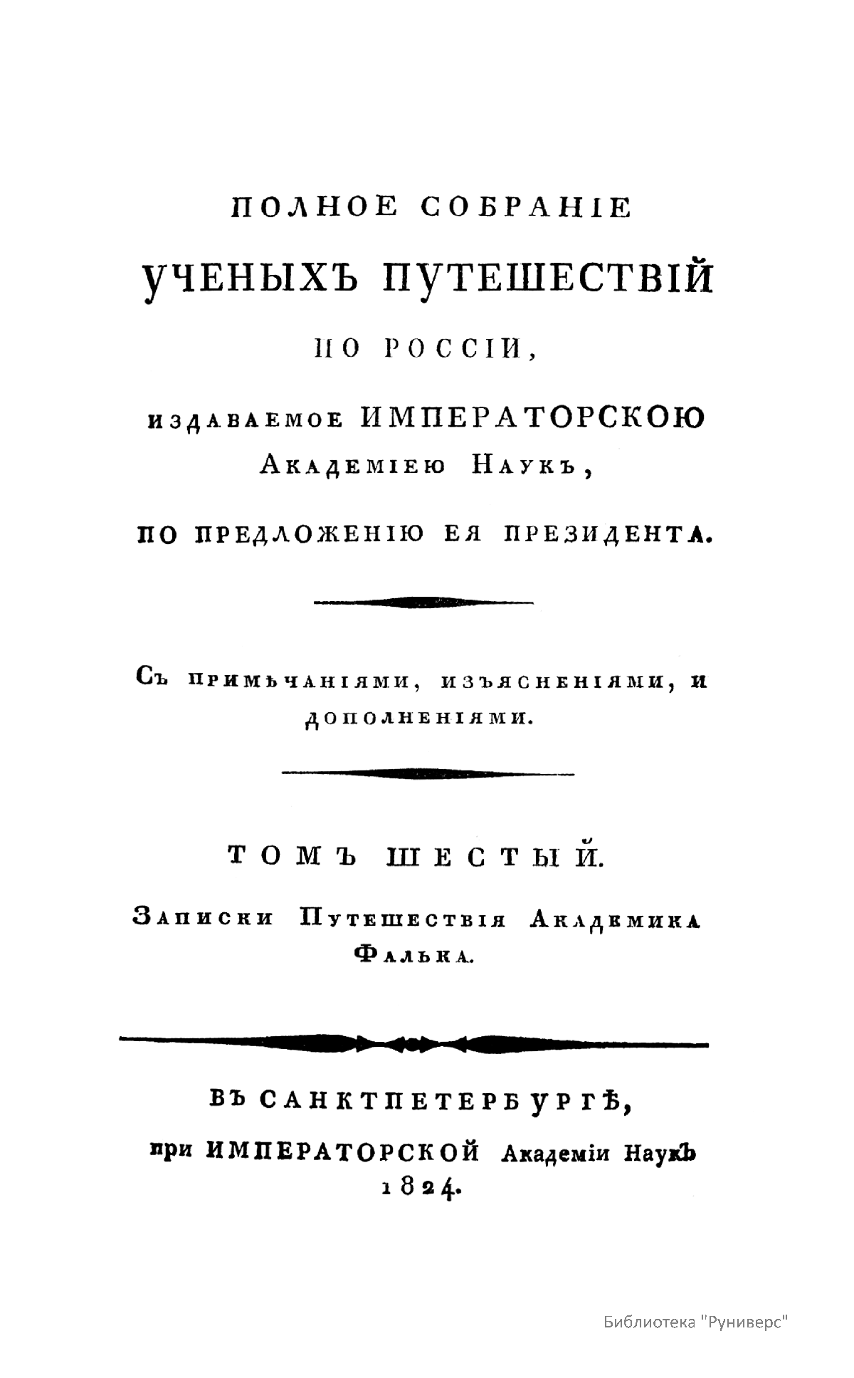 «Полное собрание ученых путешествий по России» вышло в свет по инициативе президента Санкт-Петербургской академии наук С. С. Уварова с целью обобщения и распространения основных сведений о России, полученных в результате экспедиций Академии наук, предпринятых в разные годы. В сочинение вошли следующие исследования: «Описание земли Камчатки» Степана Петровича Крашенинникова, ботаника и этнографа, участника Второй Камчатской экспедиции; «Записки путешествия академика Лепехина» (Иван Иванович Лепехин, естествоиспытатель и лексикограф, принимал участие во многих научных экспедициях по Уралу, Поволжью, Западной Сибири и Русскому Северу); «Записки путешествия академика Фалька» (Иоганн Петер Фальк, врач и естествоиспытатель, был начальником Оренбургской экспедиции, охватившей Сибирь и Алтай). Каждое исследование предваряет биография автора.