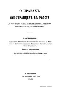 О правахъ иностранцевъ въ Россiи до вступленiя Iоанна III Васильевича на престолъ великаго княжества московскаго