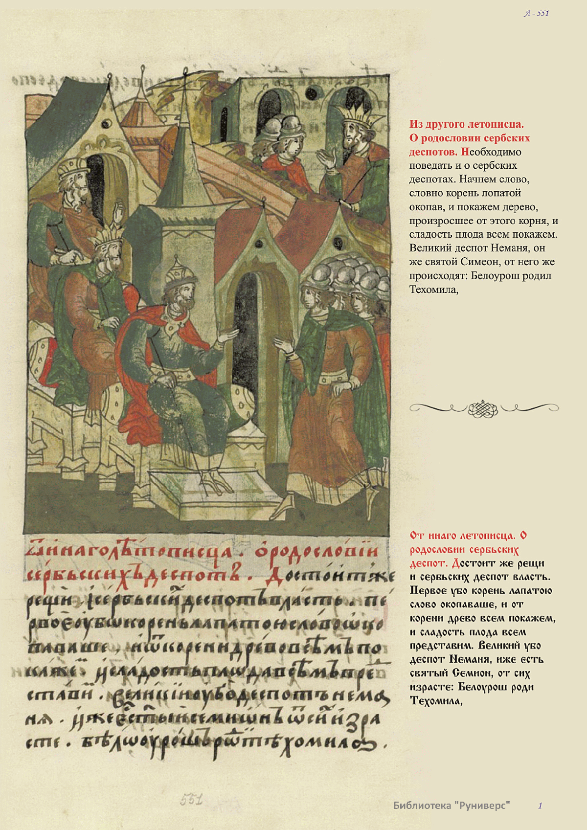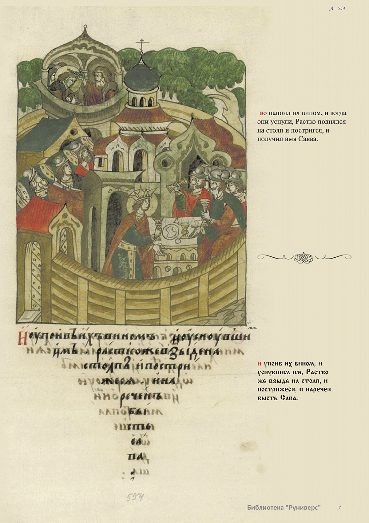 Лицевой летописный свод. XVI века — монументальный памятник древнерусского книжного искусства. На 10 тысячах листов с более чем 17 тысячами красочных миниатюр — «окон в историю» — представлена самая ранняя историческая и литературная энциклопедия. Лицевой свод дошел до наших дней в 10 томах, находящихся в разных древлехранилищах: БАН к РНБ в Санкт-Петербурге и ГИМ в Москве. Фирма «АКТЕОН» совместно с хранителями впервые осуществила научное факсимильное издание «Лицевой летописный свод XVI века». Предлагаемое издание с переводом — как дополнение в рамках научного аппарата вышеназванного факсимиле - представлено тремя разделами: библейская история, всемирная история, русская летописная история. В настоящем издании листы расположены в хронологическом порядке повествования На внешнем поле размещены транслитерация и перевод на современный русский язык. Русская летописная история 1114—1567 гг. — отражена на 6010 Лицевого летописного свода XVI века в следующих его томах: Г — Голицынский том (Отдел рукописей Российский национальной библиотеки, F.IV.225), Л — Лаптевский TOM (Отдел рукописей Российской национальной библиотеки, F.IV.233), O-I — Остермановский первый том (Отдел рукописей Библиотеки Академии наук, 31. 7. 30-1), O-II — Остермановский второй той (Отдел рукописей Библиотеки Академии наук, 31, 7. 30-2), Ш — Шумиловский том (Отдел рукописей Российской национальной библиотеки, F, IY. 232), С — Синодальный том (Отдел рукописей Государственного Исторического музея. Син. № 962), Ц— Царственная книга (Отдел рукописей Государственного Историческою музея. Син. № 149). В сносках отряжены разночтения с перепей ПСРЛ — Полным собранием русских летописей - фундаментальной для изучения истории древней и средневековой Руси книжной серией (её тексты, в основном, издавались наборно, в орфографии XIX века).