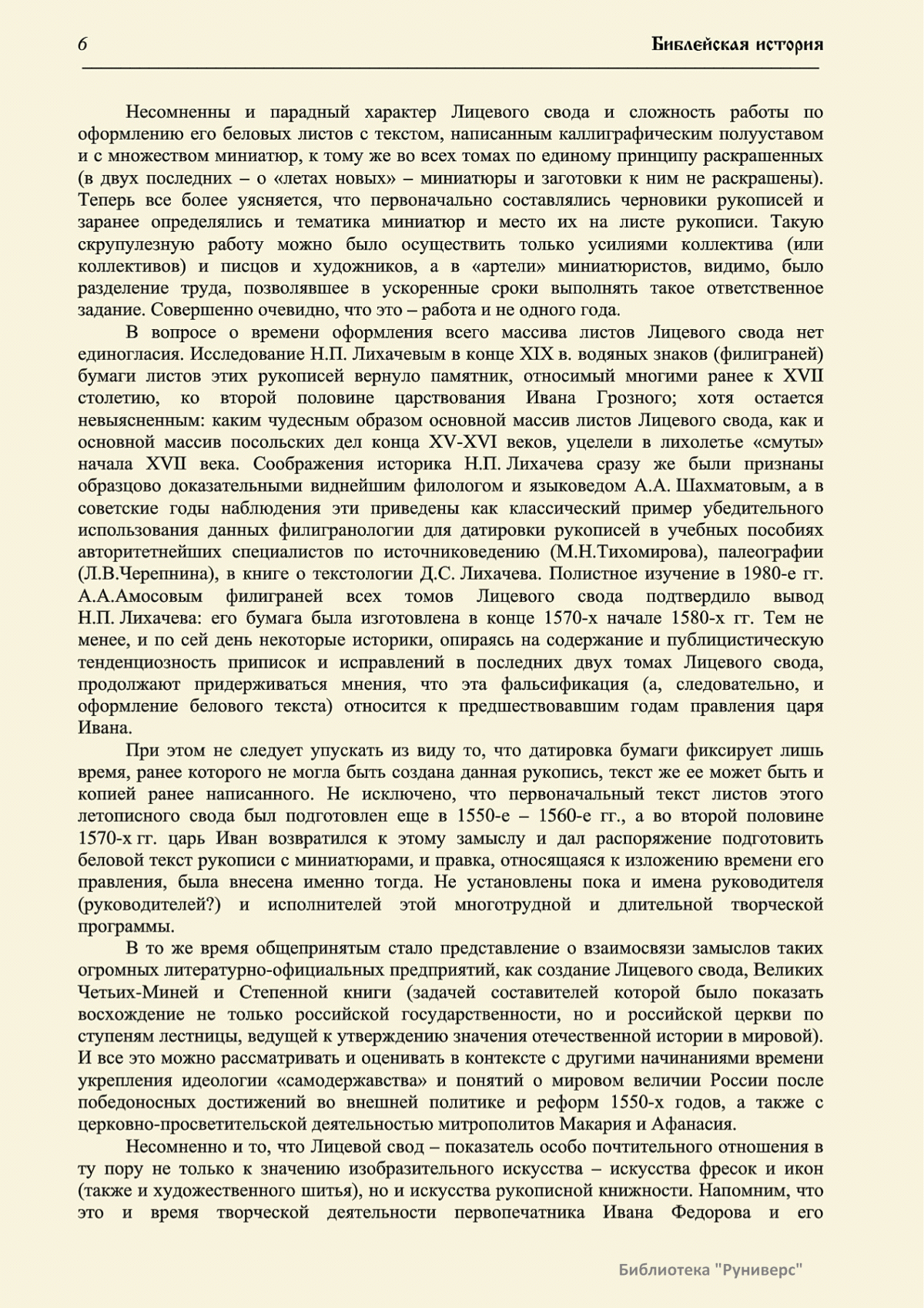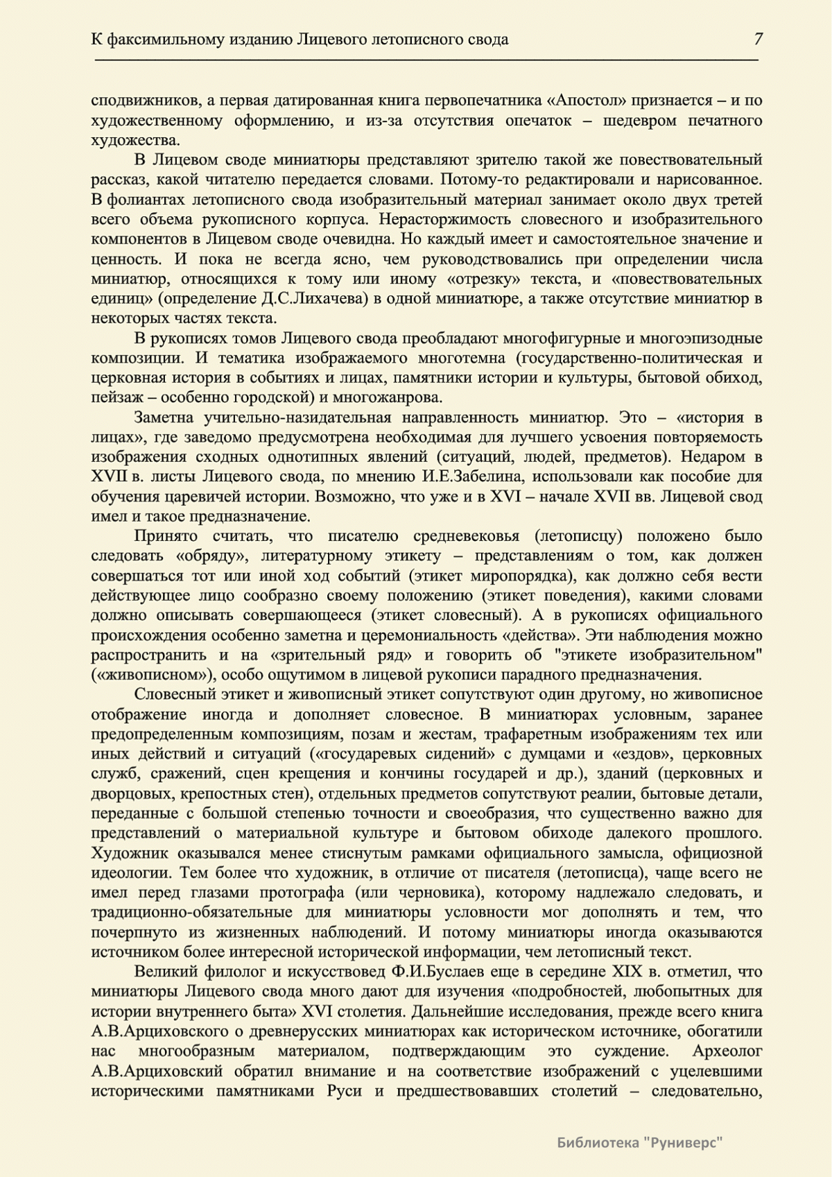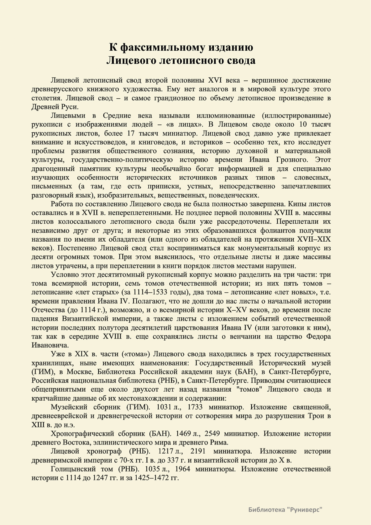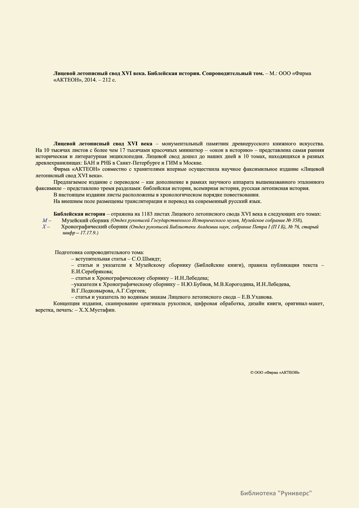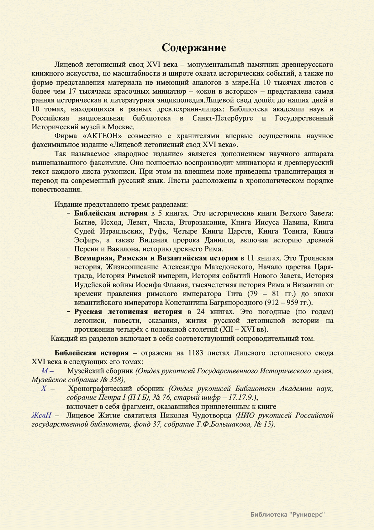 Лицевой летописный свод. XVI века — монументальный памятник древнерусского книжного искусства. На 10 тысячах листов с более чем 17 тысячами красочных миниатюр — «окон в историю» — представлена самая ранняя историческая и литературная энциклопедия. Лицевой свод дошел до наших дней в 10 томах, находящихся в разных древлехранилищах: БАН к РНБ в Санкт-Петербурге и ГИМ в Москве. Фирма «АКТЕОН» совместно с хранителями впервые осуществила научное факсимильное издание «Лицевой летописный свод XVI века». Предлагаемое издание с переводом — как дополнение в рамках научного аппарата вышеназванного факсимиле - представлено тремя разделами: библейская история, всемирная история, русская летописная история. В настоящем издании листы расположены в хронологическом порядке повествования На внешнем поле размещены транслитерация и перевод на современный русский язык. Русская летописная история 1114—1567 гг. — отражена на 6010 Лицевого летописного свода XVI века в следующих его томах: Г — Голицынский том (Отдел рукописей Российский национальной библиотеки, F.IV.225), Л — Лаптевский TOM (Отдел рукописей Российской национальной библиотеки, F.IV.233), O-I — Остермановский первый том (Отдел рукописей Библиотеки Академии наук, 31. 7. 30-1), O-II — Остермановский второй той (Отдел рукописей Библиотеки Академии наук, 31, 7. 30-2), Ш — Шумиловский том (Отдел рукописей Российской национальной библиотеки, F, IY. 232), С — Синодальный том (Отдел рукописей Государственного Исторического музея. Син. № 962), Ц— Царственная книга (Отдел рукописей Государственного Историческою музея. Син. № 149). В сносках отряжены разночтения с перепей ПСРЛ — Полным собранием русских летописей - фундаментальной для изучения истории древней и средневековой Руси книжной серией (её тексты, в основном, издавались наборно, в орфографии XIX века).