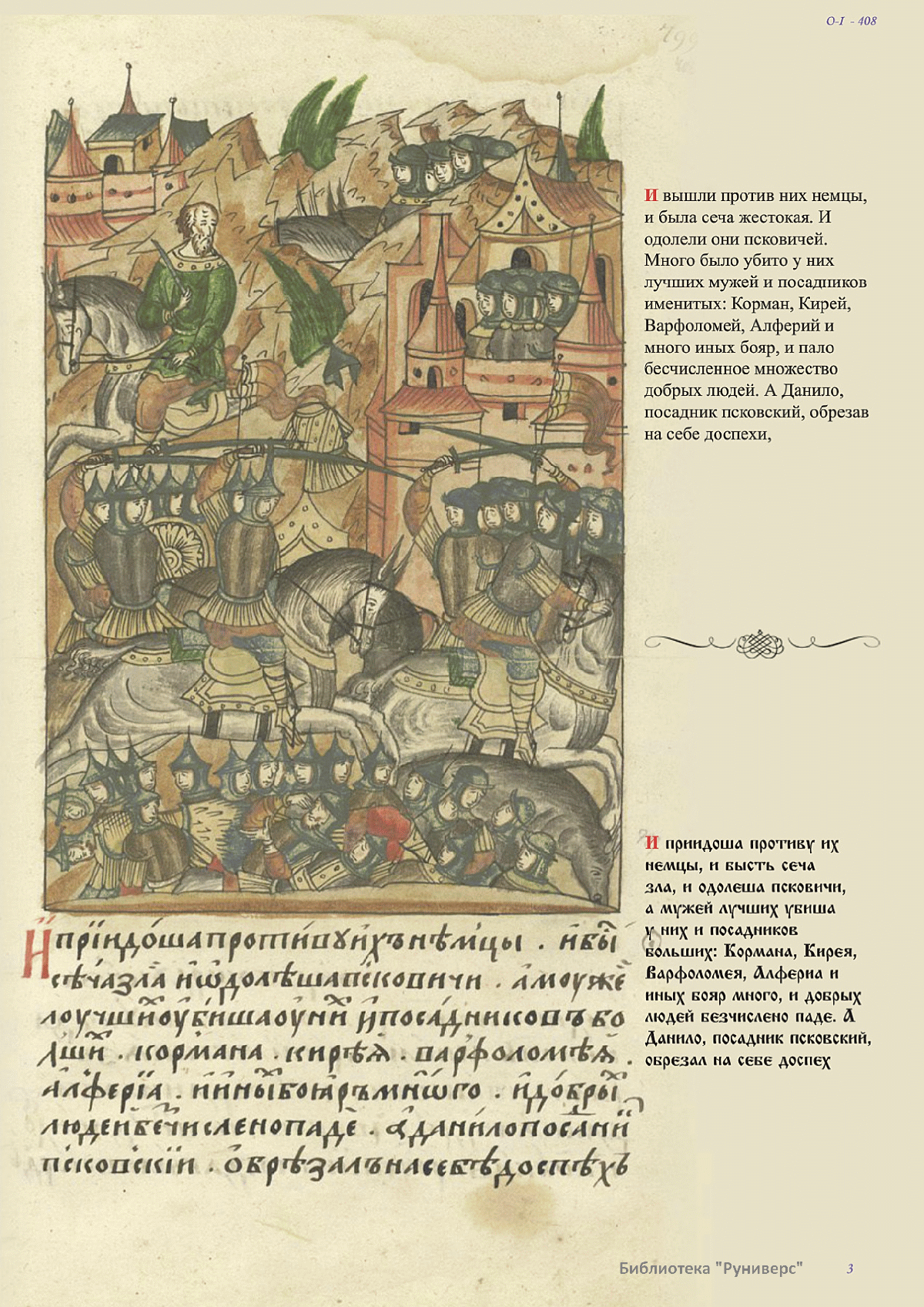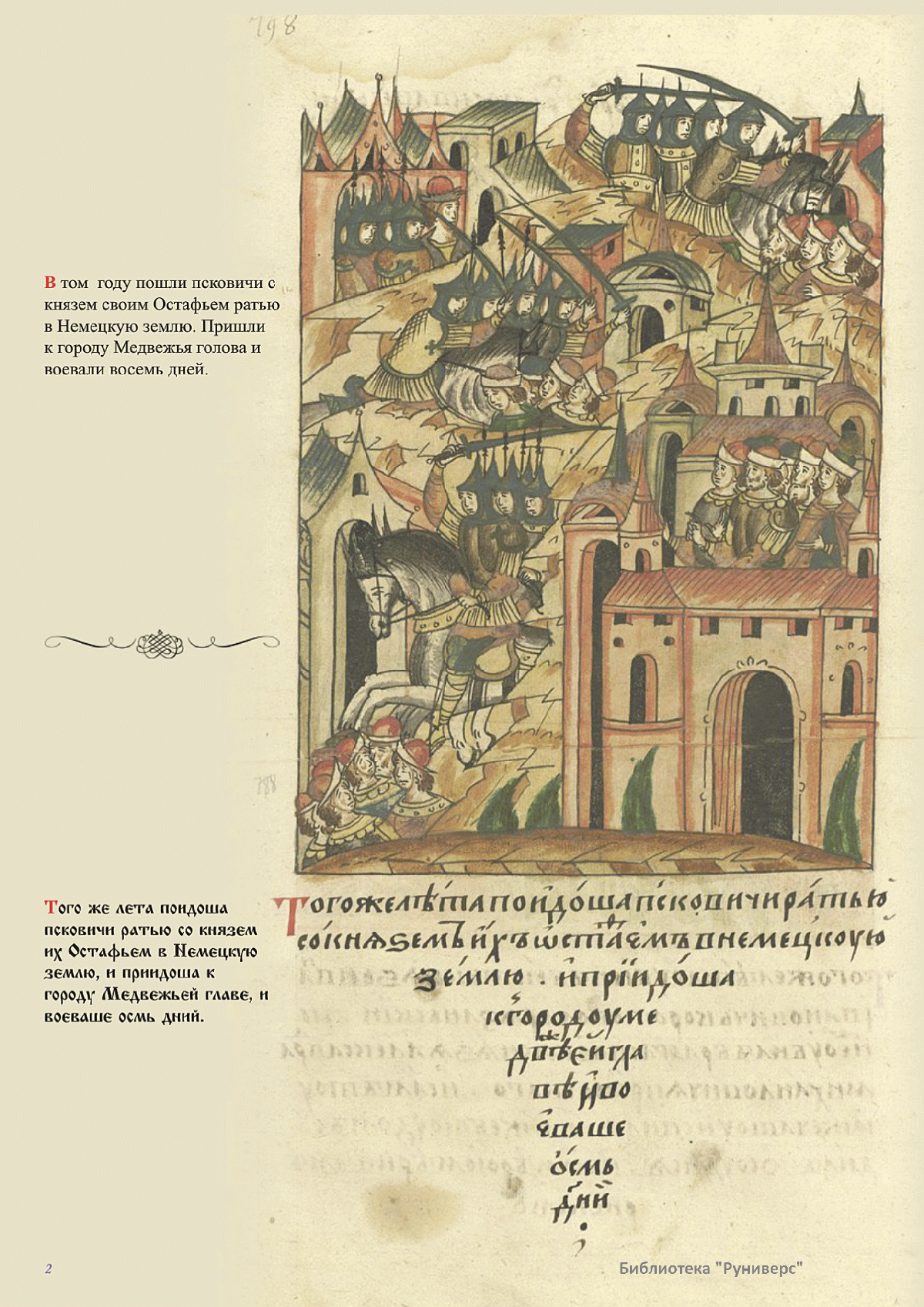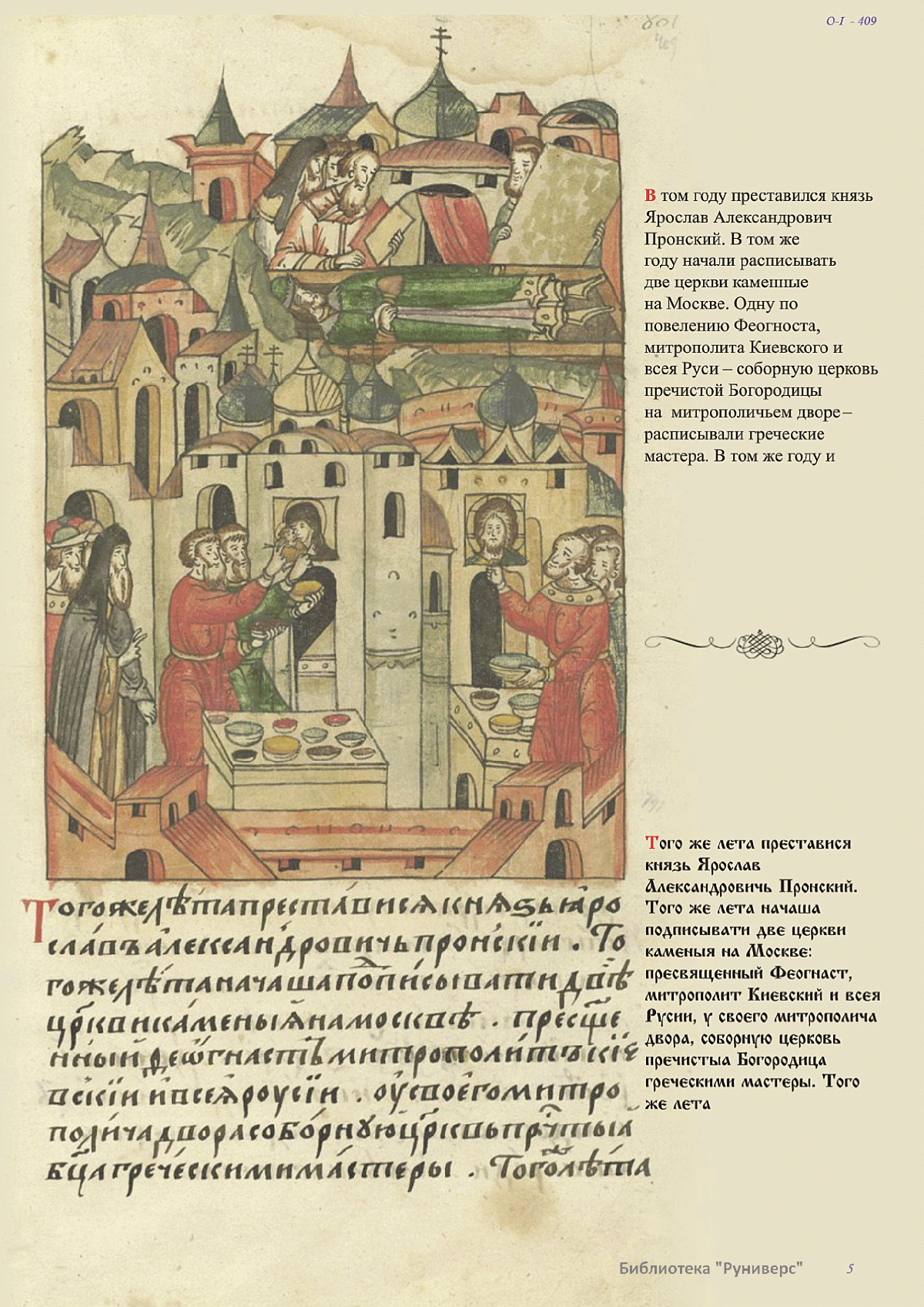 Лицевой летописный свод. XVI века — монументальный памятник древнерусского книжного искусства. На 10 тысячах листов с более чем 17 тысячами красочных миниатюр — «окон в историю» — представлена самая ранняя историческая и литературная энциклопедия. Лицевой свод дошел до наших дней в 10 томах, находящихся в разных древлехранилищах: БАН к РНБ в Санкт-Петербурге и ГИМ в Москве. Фирма «АКТЕОН» совместно с хранителями впервые осуществила научное факсимильное издание «Лицевой летописный свод XVI века». Предлагаемое издание с переводом — как дополнение в рамках научного аппарата вышеназванного факсимиле - представлено тремя разделами: библейская история, всемирная история, русская летописная история. В настоящем издании листы расположены в хронологическом порядке повествования На внешнем поле размещены транслитерация и перевод на современный русский язык. Русская летописная история 1114—1567 гг. — отражена на 6010 Лицевого летописного свода XVI века в следующих его томах: Г — Голицынский том (Отдел рукописей Российский национальной библиотеки, F.IV.225), Л — Лаптевский TOM (Отдел рукописей Российской национальной библиотеки, F.IV.233), O-I — Остермановский первый том (Отдел рукописей Библиотеки Академии наук, 31. 7. 30-1), O-II — Остермановский второй той (Отдел рукописей Библиотеки Академии наук, 31, 7. 30-2), Ш — Шумиловский том (Отдел рукописей Российской национальной библиотеки, F, IY. 232), С — Синодальный том (Отдел рукописей Государственного Исторического музея. Син. № 962), Ц— Царственная книга (Отдел рукописей Государственного Историческою музея. Син. № 149). В сносках отряжены разночтения с перепей ПСРЛ — Полным собранием русских летописей - фундаментальной для изучения истории древней и средневековой Руси книжной серией (её тексты, в основном, издавались наборно, в орфографии XIX века).