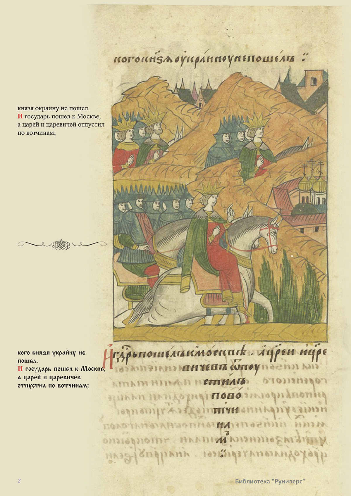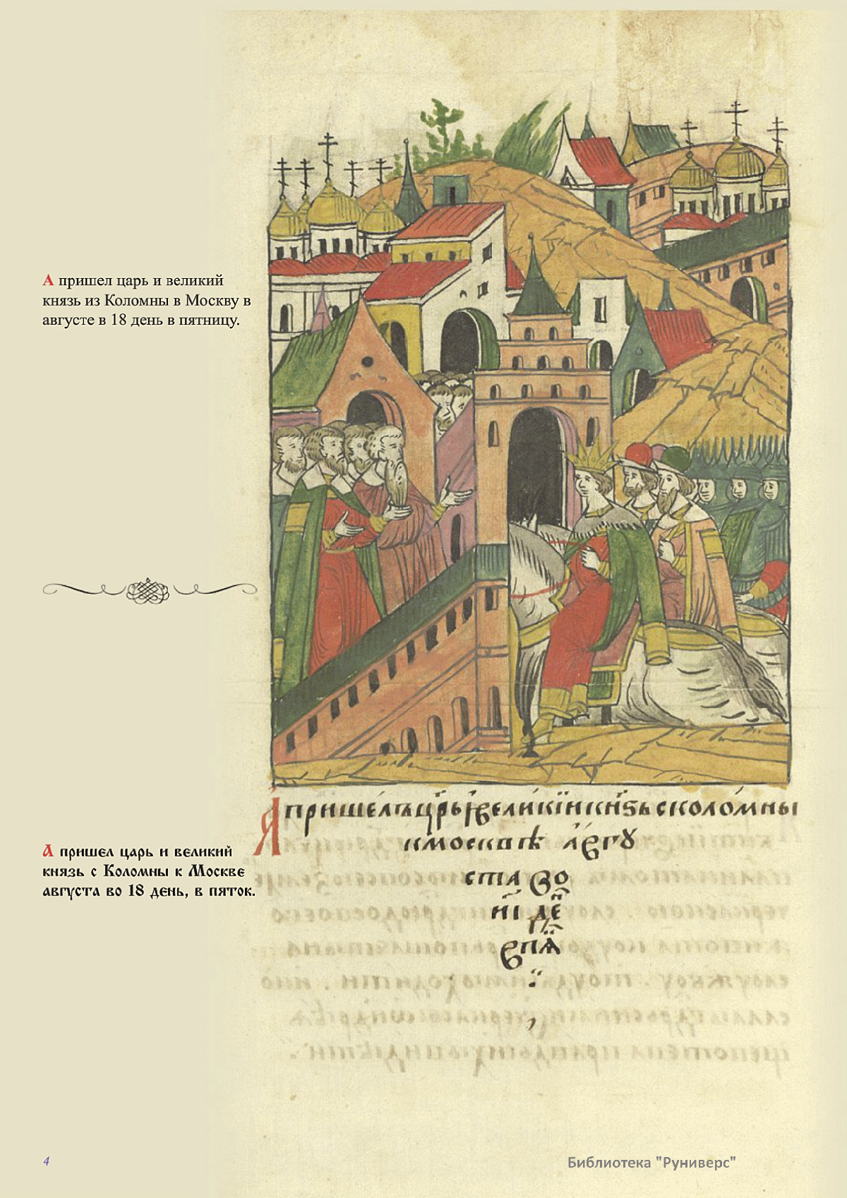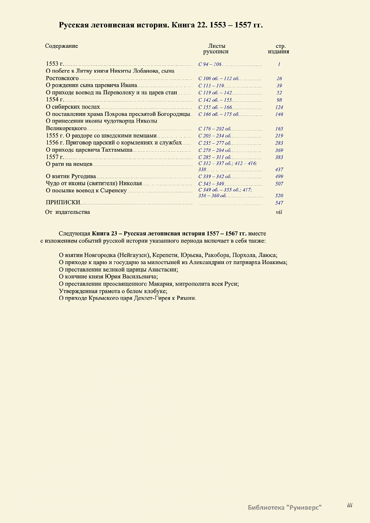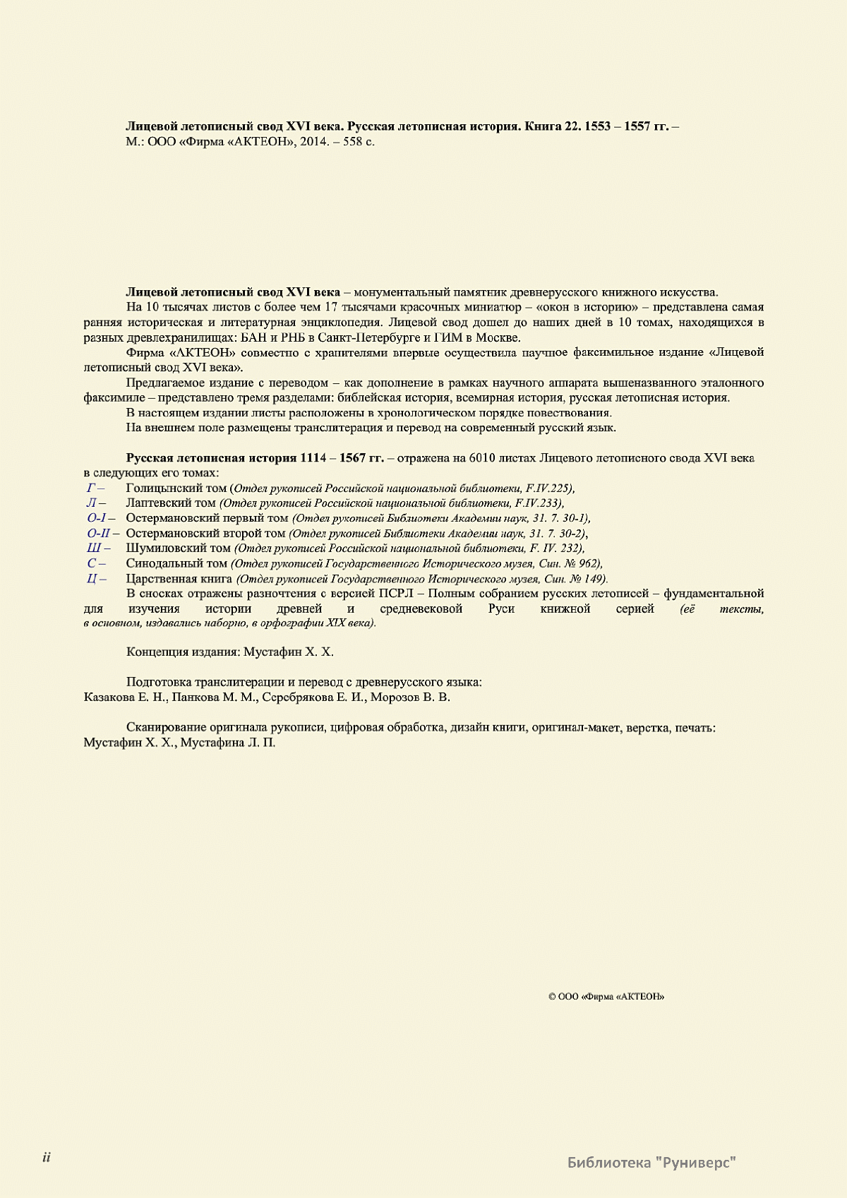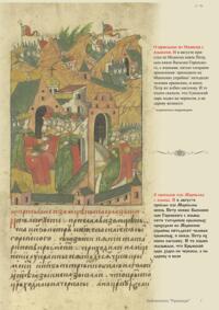 Лицевой летописный свод. XVI века — монументальный памятник древнерусского книжного искусства. На 10 тысячах листов с более чем 17 тысячами красочных миниатюр — «окон в историю» — представлена самая ранняя историческая и литературная энциклопедия. Лицевой свод дошел до наших дней в 10 томах, находящихся в разных древлехранилищах: БАН к РНБ в Санкт-Петербурге и ГИМ в Москве. Фирма «АКТЕОН» совместно с хранителями впервые осуществила научное факсимильное издание «Лицевой летописный свод XVI века». Предлагаемое издание с переводом — как дополнение в рамках научного аппарата вышеназванного факсимиле - представлено тремя разделами: библейская история, всемирная история, русская летописная история. В настоящем издании листы расположены в хронологическом порядке повествования На внешнем поле размещены транслитерация и перевод на современный русский язык. Русская летописная история 1114—1567 гг. — отражена на 6010 Лицевого летописного свода XVI века в следующих его томах: Г — Голицынский том (Отдел рукописей Российский национальной библиотеки, F.IV.225), Л — Лаптевский TOM (Отдел рукописей Российской национальной библиотеки, F.IV.233), O-I — Остермановский первый том (Отдел рукописей Библиотеки Академии наук, 31. 7. 30-1), O-II — Остермановский второй той (Отдел рукописей Библиотеки Академии наук, 31, 7. 30-2), Ш — Шумиловский том (Отдел рукописей Российской национальной библиотеки, F, IY. 232), С — Синодальный том (Отдел рукописей Государственного Исторического музея. Син. № 962), Ц— Царственная книга (Отдел рукописей Государственного Историческою музея. Син. № 149). В сносках отряжены разночтения с перепей ПСРЛ — Полным собранием русских летописей - фундаментальной для изучения истории древней и средневековой Руси книжной серией (её тексты, в основном, издавались наборно, в орфографии XIX века).