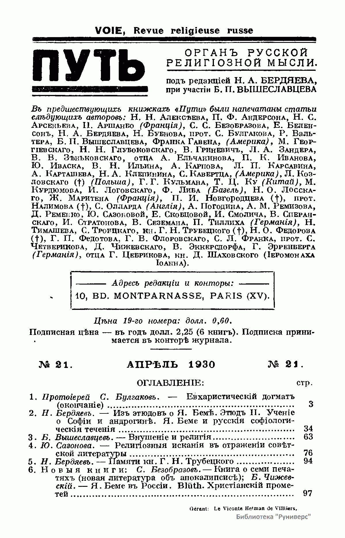 Путь: Орган русской религиозной мысли. №21. Апрель 1930