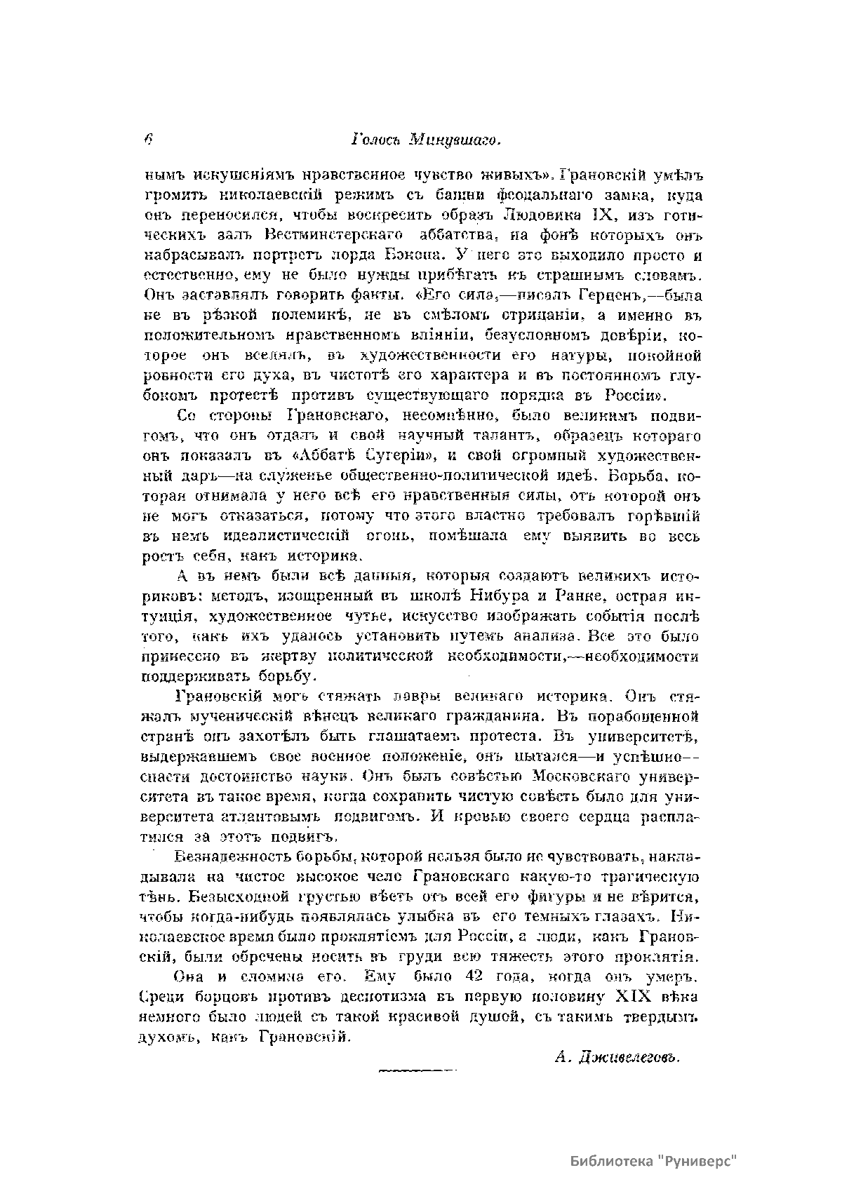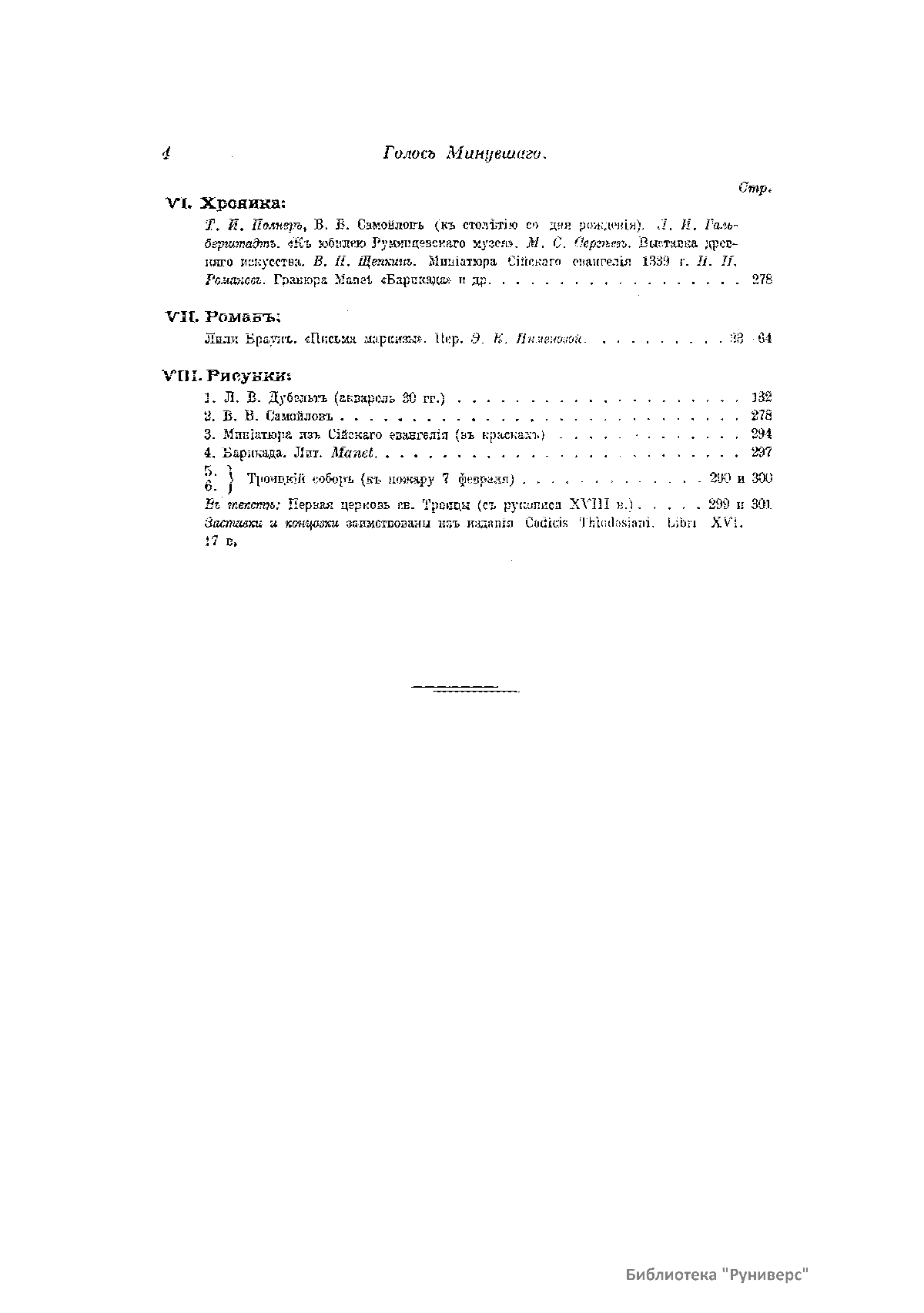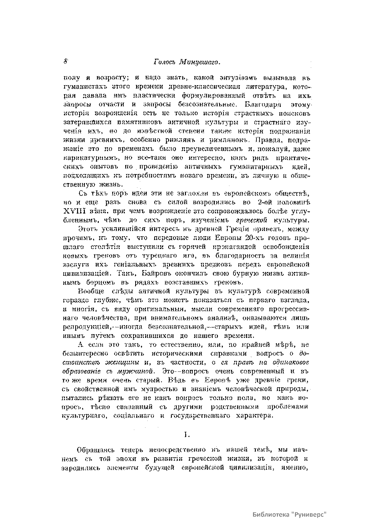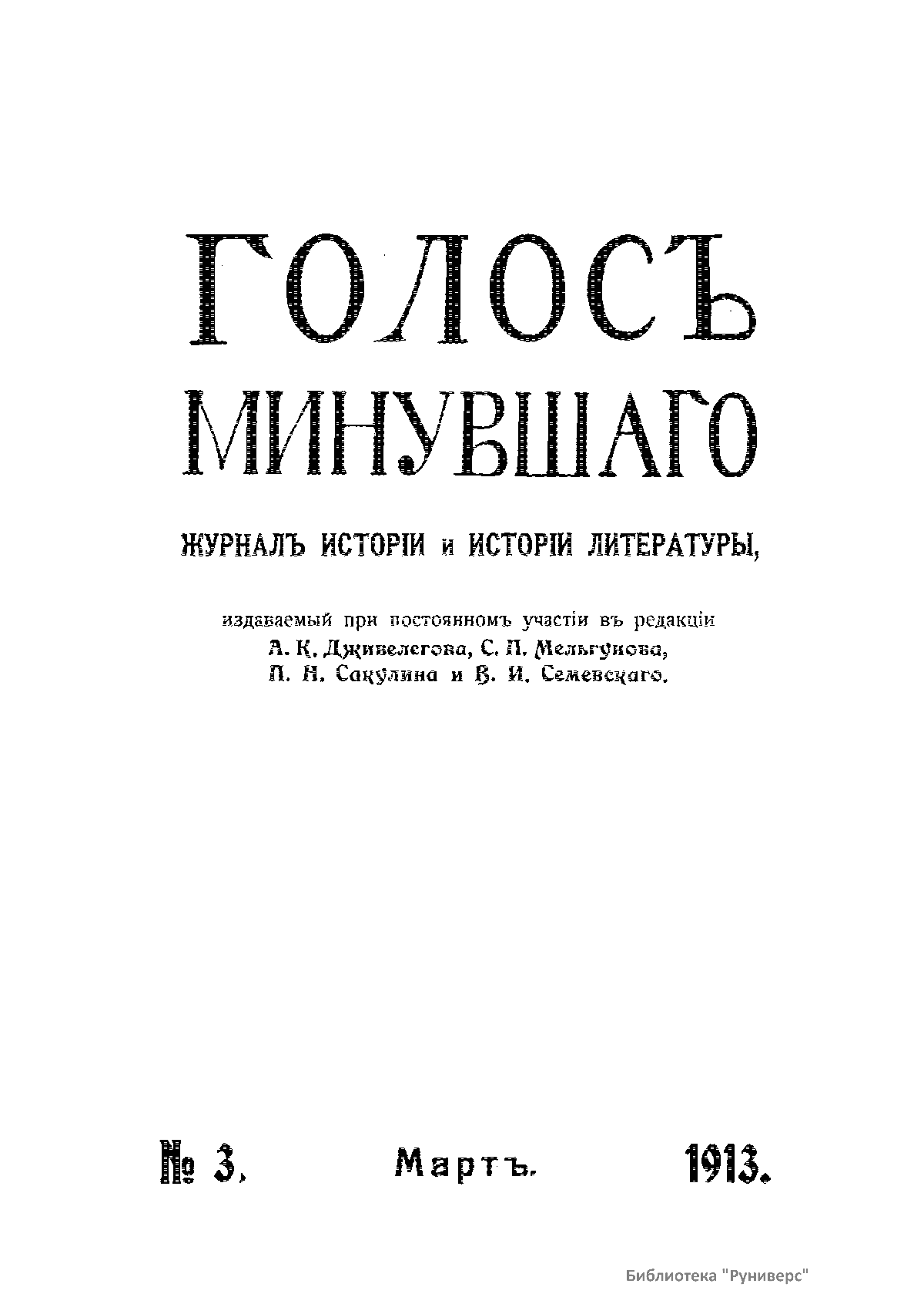 «Голос Минувшего» — журнал истории и истории литературы либерально-народнического направления, издававшийся в Москве с 1913 по 1923 год. Издателем журнала в 1913–1922 годах были известные русские историки, публицисты и общественные деятели С. П. Мельгунов (1880–1956) и В. И. Семевский (1848–1916). В редакционную коллегию также входили А. К. Дживелегов и П. Н. Сакулин. До 1919 «Голос минувшего» выходил ежемесячно, затем нерегулярно, всего было выпущено 65 номеров. В журнале публиковались интереснейшие материалы, посвященные истории литературы и общественных движений в России второй половины XVIII – начала XX веков. Здесь можно найти: статьи по вопросам русской и всеобщей истории, истории литературы, философии, искусства и археологии. В издании представлены: историческая беллетристика, биографии русских и иностранных деятелей, критика и библиография, новости русской и иностранной науки, обзор журналов русских и иностранных, хроника, мемуары, записки, дневники и письма декабристов, видных народовольцев и эсеров, крупных общественных деятелей и царских администраторов, писателей, военачальников и др. Среди авторов: Е. В. Тарле, А. Ф. Кони, А. К. Дживелегов, А. А. Кизеветтер, В. Г. Короленко и др. Стремление сделать журнал интересным для более широкого круга читателей способствовало тому, что в «Голосе Минувшего», хоть и в ограниченном количестве, печатались статьи по истории искусства и помещались иллюстрации: портреты, картины и рисунки, не знакомые или мало знакомые публике. В журнале опубликован целый ряд интересных писем, документов и воспоминаний. Абсолютное большинство текстов никогда не переиздавалось. Журнал снабжен указателями имен за 1913–1922 годы и систематическим указателем содержания.