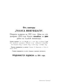 «Голос Минувшего» — журнал истории и истории литературы либерально-народнического направления, издававшийся в Москве с 1913 по 1923 год. Издателем журнала в 1913–1922 годах были известные русские историки, публицисты и общественные деятели С. П. Мельгунов (1880–1956) и В. И. Семевский (1848–1916). В редакционную коллегию также входили А. К. Дживелегов и П. Н. Сакулин. До 1919 «Голос минувшего» выходил ежемесячно, затем нерегулярно, всего было выпущено 65 номеров. В журнале публиковались интереснейшие материалы, посвященные истории литературы и общественных движений в России второй половины XVIII – начала XX веков. Здесь можно найти: статьи по вопросам русской и всеобщей истории, истории литературы, философии, искусства и археологии. В издании представлены: историческая беллетристика, биографии русских и иностранных деятелей, критика и библиография, новости русской и иностранной науки, обзор журналов русских и иностранных, хроника, мемуары, записки, дневники и письма декабристов, видных народовольцев и эсеров, крупных общественных деятелей и царских администраторов, писателей, военачальников и др. Среди авторов: Е. В. Тарле, А. Ф. Кони, А. К. Дживелегов, А. А. Кизеветтер, В. Г. Короленко и др. Стремление сделать журнал интересным для более широкого круга читателей способствовало тому, что в «Голосе Минувшего», хоть и в ограниченном количестве, печатались статьи по истории искусства и помещались иллюстрации: портреты, картины и рисунки, не знакомые или мало знакомые публике. В журнале опубликован целый ряд интересных писем, документов и воспоминаний. Абсолютное большинство текстов никогда не переиздавалось. Журнал снабжен указателями имен за 1913–1922 годы и систематическим указателем содержания.