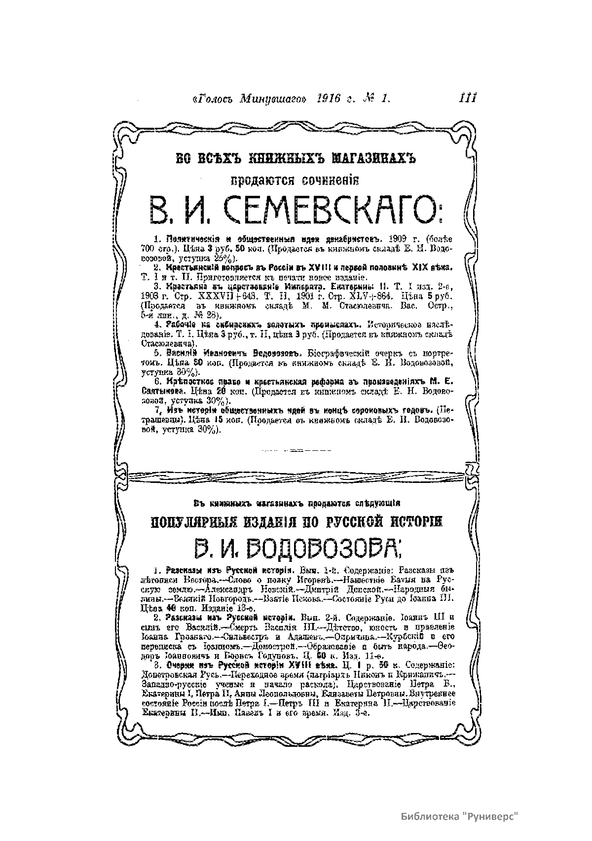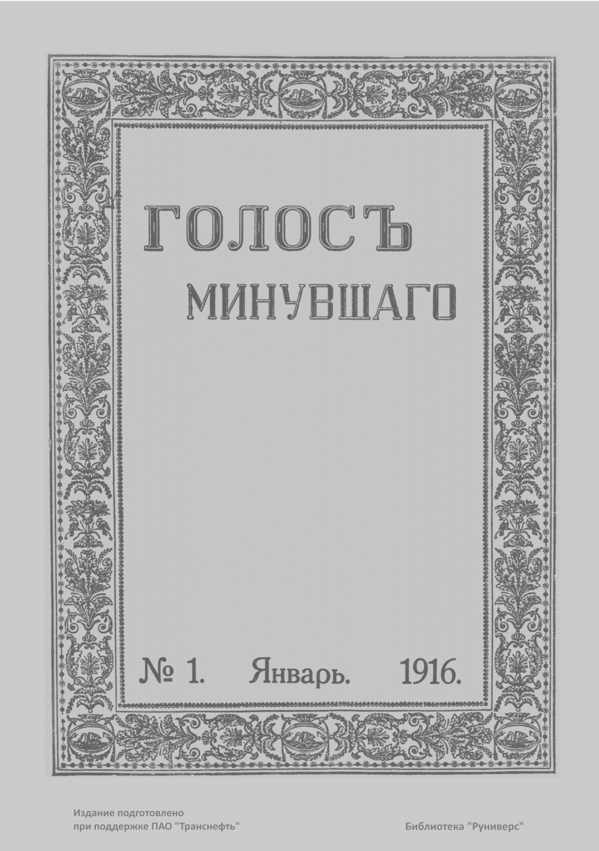 «Голос Минувшего» — журнал истории и истории литературы либерально-народнического направления, издававшийся в Москве с 1913 по 1923 год. Издателем журнала в 1913–1922 годах были известные русские историки, публицисты и общественные деятели С. П. Мельгунов (1880–1956) и В. И. Семевский (1848–1916). В редакционную коллегию также входили А. К. Дживелегов и П. Н. Сакулин. До 1919 «Голос минувшего» выходил ежемесячно, затем нерегулярно, всего было выпущено 65 номеров. В журнале публиковались интереснейшие материалы, посвященные истории литературы и общественных движений в России второй половины XVIII – начала XX веков. Здесь можно найти: статьи по вопросам русской и всеобщей истории, истории литературы, философии, искусства и археологии. В издании представлены: историческая беллетристика, биографии русских и иностранных деятелей, критика и библиография, новости русской и иностранной науки, обзор журналов русских и иностранных, хроника, мемуары, записки, дневники и письма декабристов, видных народовольцев и эсеров, крупных общественных деятелей и царских администраторов, писателей, военачальников и др. Среди авторов: Е. В. Тарле, А. Ф. Кони, А. К. Дживелегов, А. А. Кизеветтер, В. Г. Короленко и др. Стремление сделать журнал интересным для более широкого круга читателей способствовало тому, что в «Голосе Минувшего», хоть и в ограниченном количестве, печатались статьи по истории искусства и помещались иллюстрации: портреты, картины и рисунки, не знакомые или мало знакомые публике. В журнале опубликован целый ряд интересных писем, документов и воспоминаний. Абсолютное большинство текстов никогда не переиздавалось. Журнал снабжен указателями имен за 1913–1922 годы и систематическим указателем содержания.