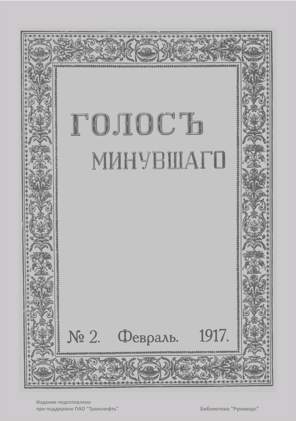 «Голос Минувшего» — журнал истории и истории литературы либерально-народнического направления, издававшийся в Москве с 1913 по 1923 год. Издателем журнала в 1913–1922 годах были известные русские историки, публицисты и общественные деятели С. П. Мельгунов (1880–1956) и В. И. Семевский (1848–1916). В редакционную коллегию также входили А. К. Дживелегов и П. Н. Сакулин. До 1919 «Голос минувшего» выходил ежемесячно, затем нерегулярно, всего было выпущено 65 номеров. В журнале публиковались интереснейшие материалы, посвященные истории литературы и общественных движений в России второй половины XVIII – начала XX веков. Здесь можно найти: статьи по вопросам русской и всеобщей истории, истории литературы, философии, искусства и археологии. В издании представлены: историческая беллетристика, биографии русских и иностранных деятелей, критика и библиография, новости русской и иностранной науки, обзор журналов русских и иностранных, хроника, мемуары, записки, дневники и письма декабристов, видных народовольцев и эсеров, крупных общественных деятелей и царских администраторов, писателей, военачальников и др. Среди авторов: Е. В. Тарле, А. Ф. Кони, А. К. Дживелегов, А. А. Кизеветтер, В. Г. Короленко и др. Стремление сделать журнал интересным для более широкого круга читателей способствовало тому, что в «Голосе Минувшего», хоть и в ограниченном количестве, печатались статьи по истории искусства и помещались иллюстрации: портреты, картины и рисунки, не знакомые или мало знакомые публике. В журнале опубликован целый ряд интересных писем, документов и воспоминаний. Абсолютное большинство текстов никогда не переиздавалось. Журнал снабжен указателями имен за 1913–1922 годы и систематическим указателем содержания.