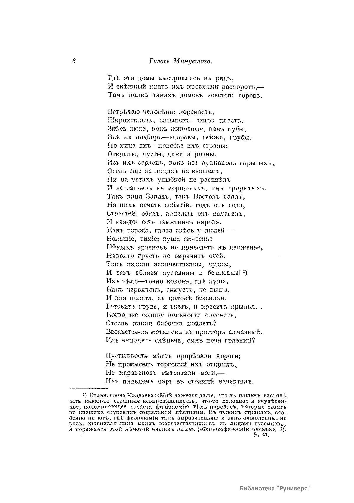 «Голос Минувшего» — журнал истории и истории литературы либерально-народнического направления, издававшийся в Москве с 1913 по 1923 год. Издателем журнала в 1913–1922 годах были известные русские историки, публицисты и общественные деятели С. П. Мельгунов (1880–1956) и В. И. Семевский (1848–1916). В редакционную коллегию также входили А. К. Дживелегов и П. Н. Сакулин. До 1919 «Голос минувшего» выходил ежемесячно, затем нерегулярно, всего было выпущено 65 номеров. В журнале публиковались интереснейшие материалы, посвященные истории литературы и общественных движений в России второй половины XVIII – начала XX веков. Здесь можно найти: статьи по вопросам русской и всеобщей истории, истории литературы, философии, искусства и археологии. В издании представлены: историческая беллетристика, биографии русских и иностранных деятелей, критика и библиография, новости русской и иностранной науки, обзор журналов русских и иностранных, хроника, мемуары, записки, дневники и письма декабристов, видных народовольцев и эсеров, крупных общественных деятелей и царских администраторов, писателей, военачальников и др. Среди авторов: Е. В. Тарле, А. Ф. Кони, А. К. Дживелегов, А. А. Кизеветтер, В. Г. Короленко и др. Стремление сделать журнал интересным для более широкого круга читателей способствовало тому, что в «Голосе Минувшего», хоть и в ограниченном количестве, печатались статьи по истории искусства и помещались иллюстрации: портреты, картины и рисунки, не знакомые или мало знакомые публике. В журнале опубликован целый ряд интересных писем, документов и воспоминаний. Абсолютное большинство текстов никогда не переиздавалось. Журнал снабжен указателями имен за 1913–1922 годы и систематическим указателем содержания.