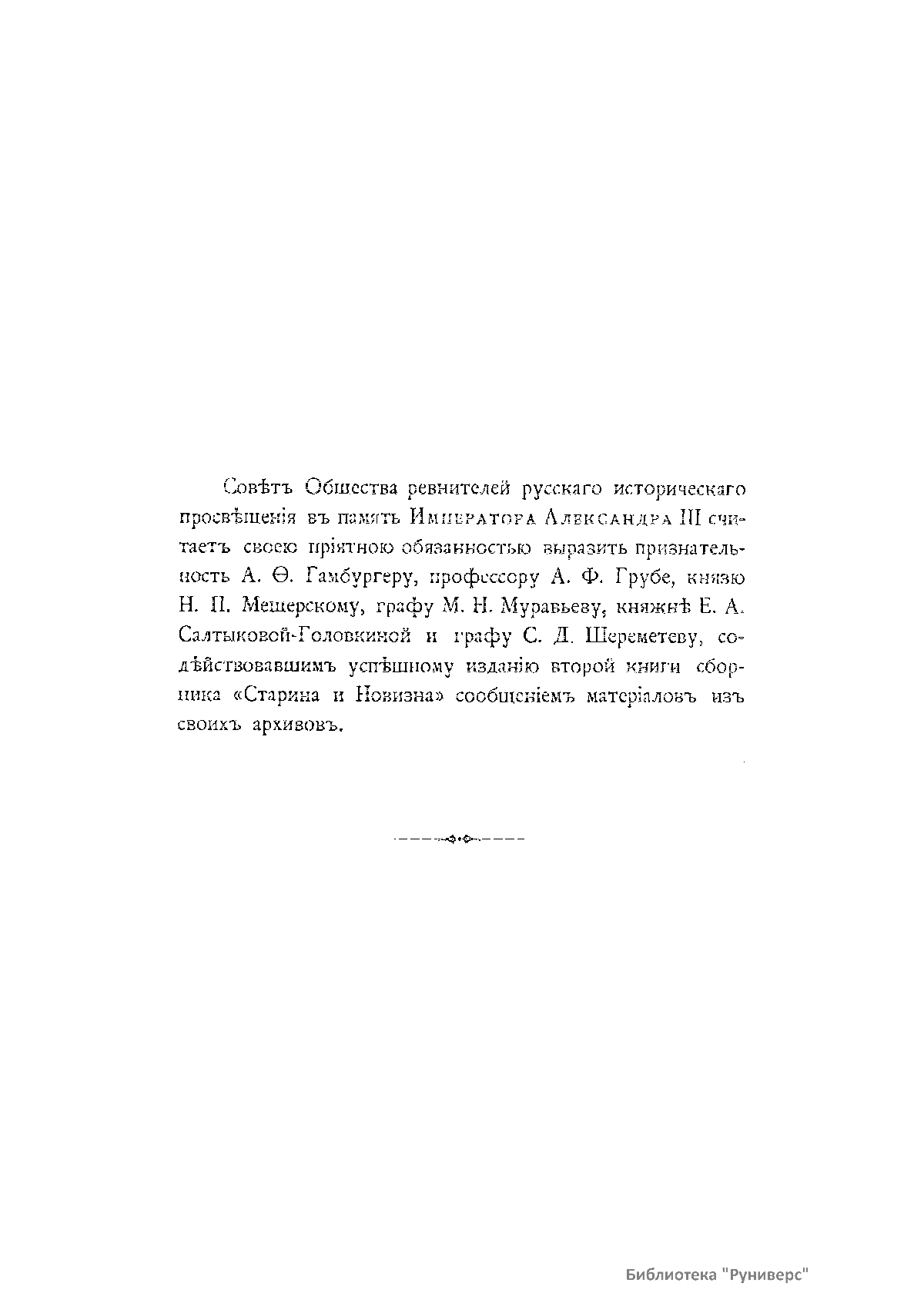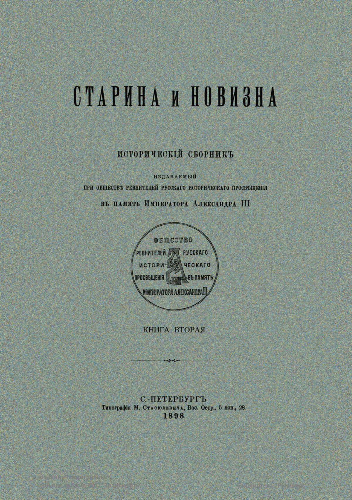 «Старина и новизна» — русский исторический сборник, издававшийся «Обществом ревнителей русского исторического просвещения в память императора Александра III». Сборник выходил в Петербурге в 1897–1904 и в Москве в 1904–1917 годах по мере накопления материала. Руководил изданием сборника граф С. Д. Шереметев (1844–1918) — историк, археолог, председатель «Общества», одного из первых объединений историков монархического направления. Члены общества способствовали изданию документов прошлого, содействуя развитию исторической науки и популяризации интереса к историческим материалам. «Старина и новизна» представляет собой собрание документальных материалов по русской истории и литературе XVII–XIX века. Вместе с Шереметевым в создании сборника участвовали блестящие историки А. П. и Н. П. Барсуковы, С. Ф. Платонов, Л. П. Майков и др.