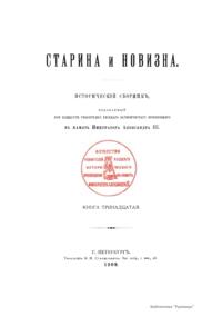 «Старина и новизна» — русский исторический сборник, издававшийся «Обществом ревнителей русского исторического просвещения в память императора Александра III». Сборник выходил в Петербурге в 1897–1904 и в Москве в 1904–1917 годах по мере накопления материала. Руководил изданием сборника граф С. Д. Шереметев (1844–1918) — историк, археолог, председатель «Общества», одного из первых объединений историков монархического направления. Члены общества способствовали изданию документов прошлого, содействуя развитию исторической науки и популяризации интереса к историческим материалам. «Старина и новизна» представляет собой собрание документальных материалов по русской истории и литературе XVII–XIX века. Вместе с Шереметевым в создании сборника участвовали блестящие историки А. П. и Н. П. Барсуковы, С. Ф. Платонов, Л. П. Майков и др.