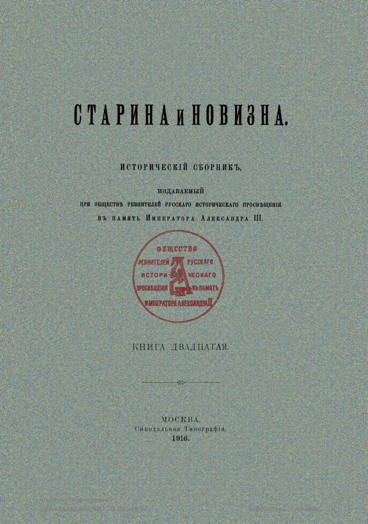 «Старина и новизна» — русский исторический сборник, издававшийся «Обществом ревнителей русского исторического просвещения в память императора Александра III». Сборник выходил в Петербурге в 1897–1904 и в Москве в 1904–1917 годах по мере накопления материала. Руководил изданием сборника граф С. Д. Шереметев (1844–1918) — историк, археолог, председатель «Общества», одного из первых объединений историков монархического направления. Члены общества способствовали изданию документов прошлого, содействуя развитию исторической науки и популяризации интереса к историческим материалам. «Старина и новизна» представляет собой собрание документальных материалов по русской истории и литературе XVII–XIX века. Вместе с Шереметевым в создании сборника участвовали блестящие историки А. П. и Н. П. Барсуковы, С. Ф. Платонов, Л. П. Майков и др.
