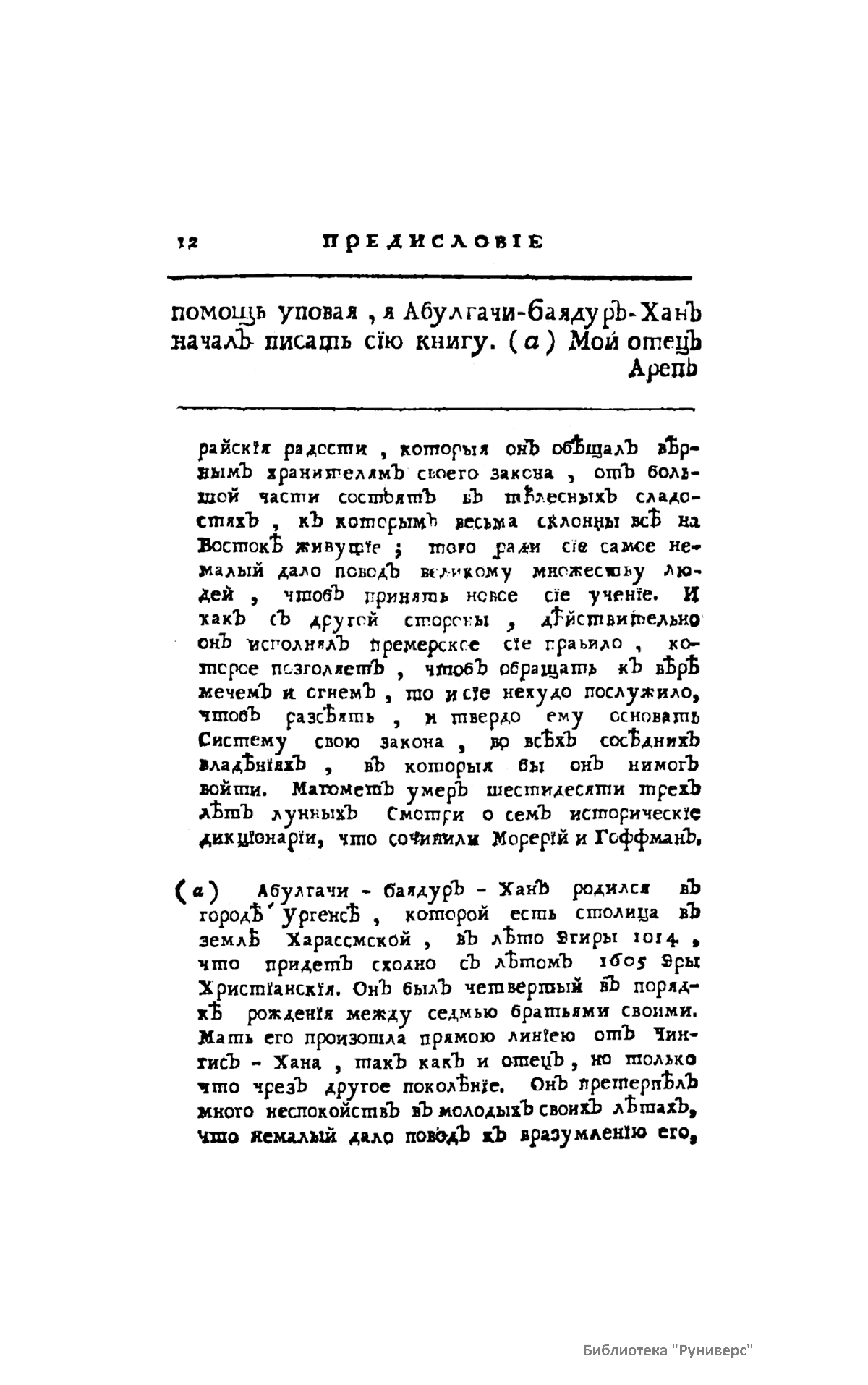 Данное издание является раритетным историческим источником по генеалогии, истории и географии тюркского этноса и Северной Азии. Это перевод на русский язык исторического труда Абулгази-Баядур-Хана «Родословное древо тюрок», написанного им в 1660–1663 годах. Закончил сочинение его сын Мухаммед Ануш, который довел повествование до 1663 года. Рукопись была открыта подполковником шведской армии Ф. И. Т. Страленбергом в Тобольске, где он находился в ссылке после Полтавского сражения (1709). Она была записана русским писцом со слов татарского переводчика. Швед Шенстрем, по поручению русского царя положивший начало научному изучению истории, географии и топографии Сибири, сделал перевод на немецкий язык. Сочинение было издано в Брюсселе Варенном (Varenne de Mondasse) в 1726 году уже на французском языке. Оно вышло под названием «Histoire généalogique des Tartares, traduite du manuscript tartare d Abulgasi-Bayadur-Chan» с подробными примечаниями Бетинка. В 1734 году Академия наук поручила В. К. Тредиаковскому перевести книгу с французского на русский язык. В 1745 году перевод был передан Г. Ф. Миллеру для «исправления» и «изъяснения» некоторых «известий», а также для составления примечаний на основании материалов, собранных им в Сибири. В 1768 году сочинение было выпущено в свет в двух томах тиражом 1512 экземпляров. В книге представлены две карты.