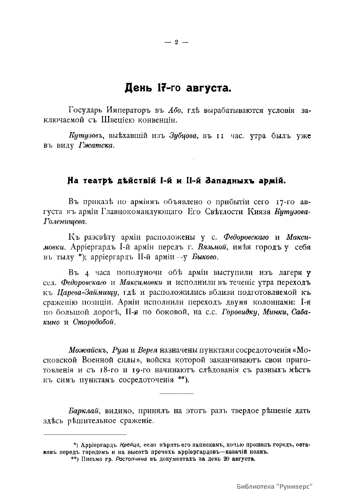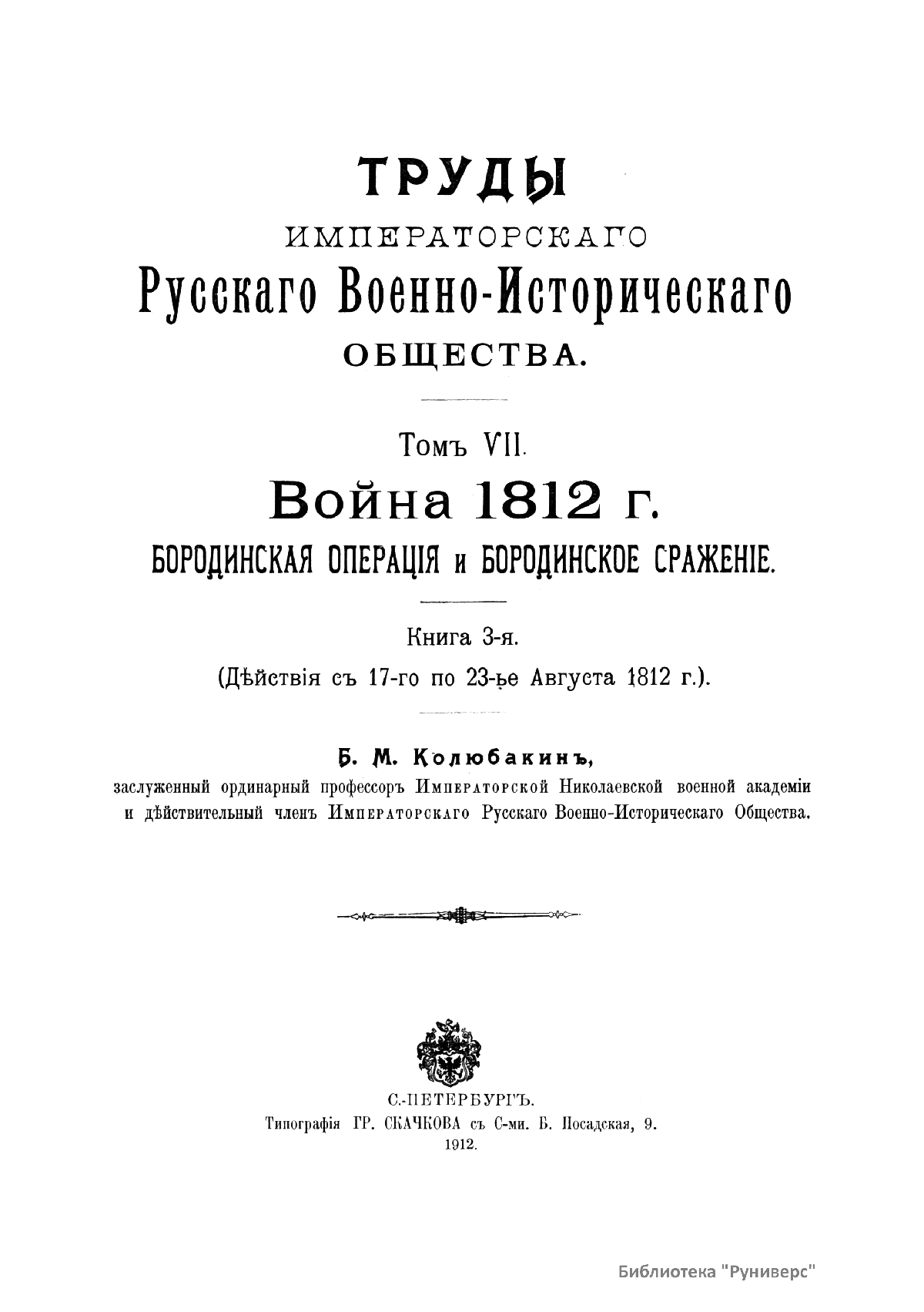 Война 1812 г. Бородинская операцiя и Бородинское сраженiе. Книга 3-я. (Дѣйствия съ 17-го по 23-ье Августа 1812 г.)