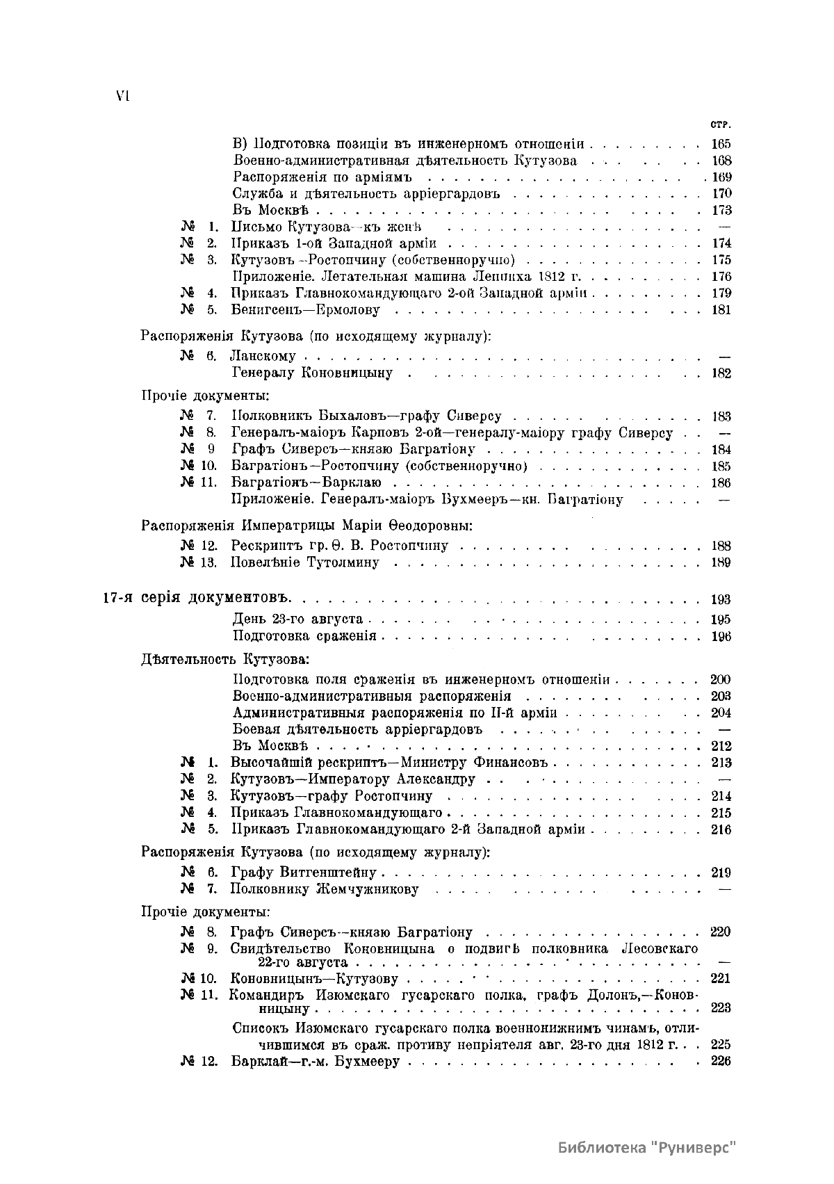 К столетнему юбилею Бородинского сражения по поручению Императорского Русское военно-исторического общества была подготовлена подневная хроника Бородинской операции с 8 по 26 августа 1812 года, составившая три тома (с V по VII тома Трудов ИРВИО). Окончание хроники за 24–26 августа осталось неопубликованным. В книге собраны и документы-первоисточники по Бородинскому сражению, как наиболее яркому событию всей военной кампании, сражению, в подготовке и проведении которого наиболее явно отразились все положительные и отрицательные стороны военной системы. Документы расположены по дням, объединены в серии, каждой серии предшествует объяснительный текст.