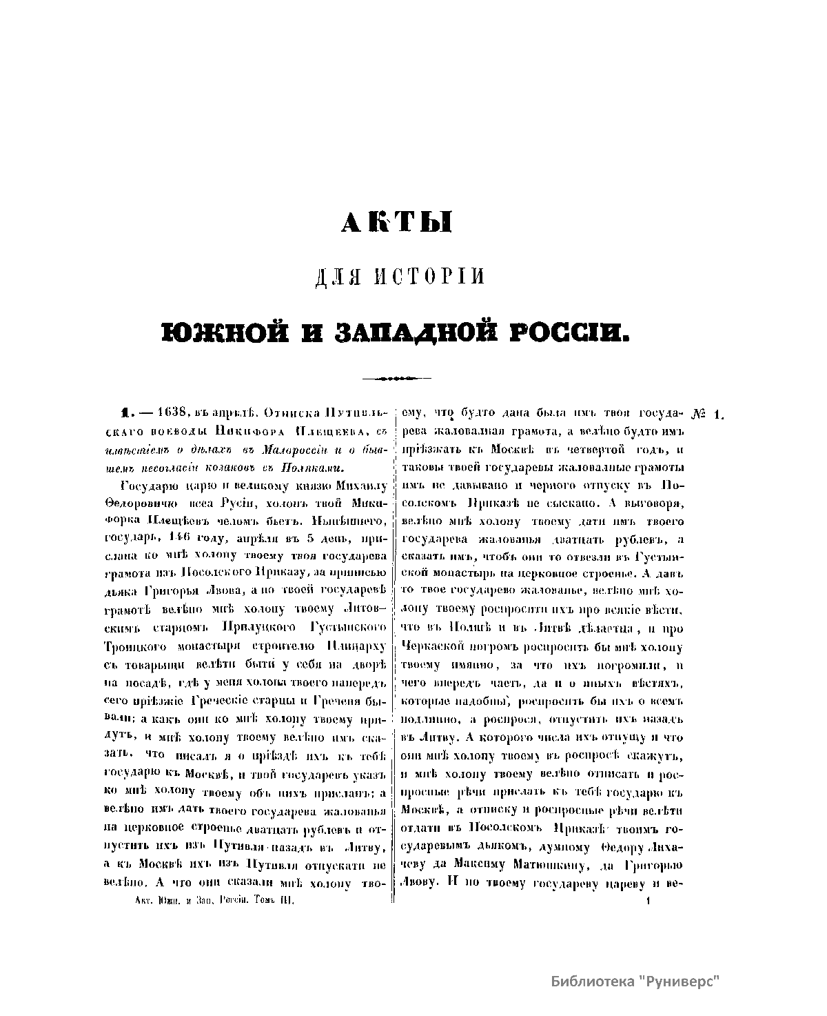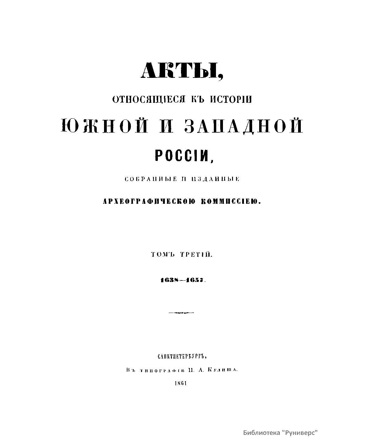 Акты, относящiеся къ исторiи южной и западной Россiи. Томъ третiй. 1638-1652