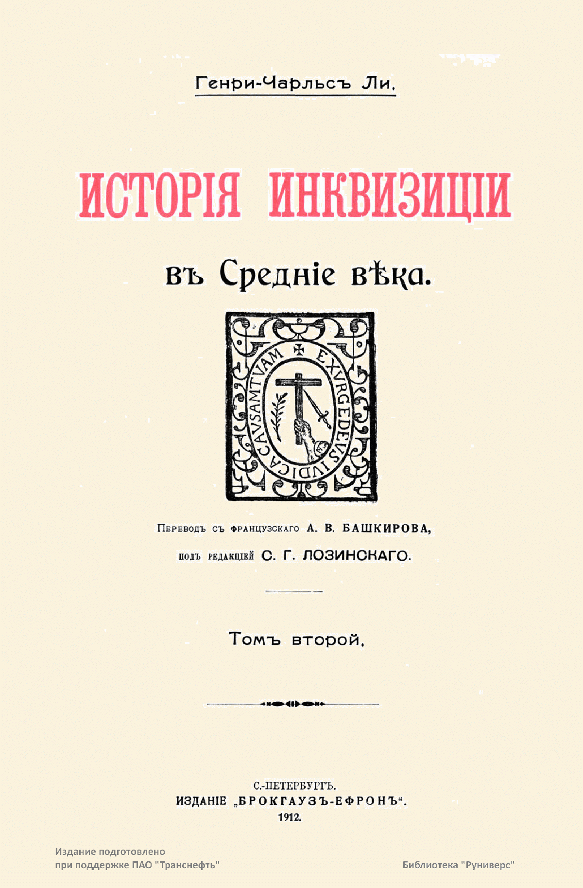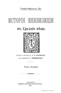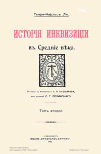 Книга американского исследователя Генри-Чарльза Ли (1825–1909), основанная на обширном документальном материале, рассказывает о возникновении и деятельности инквизиции в Средние века. В издании описаны знаменитые процессы над Яном Гусом, Савонаролой, Жанной д’Арк, гроссмейстером тамплиеров Жаком де Молэ, «Синей Бородой» — Жилем де Рэ и др.