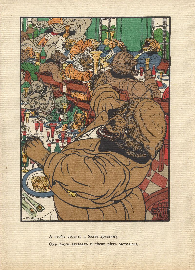Возможно, Кнебель хотел привлечь к иллюстрированию басен различных художников. Так, например, издание 1912 года иллюстрирует Егор Нарбут. Серия оформлена в стилистике классицизма – своеобразная дань Крылову и его эпохе. Иллюстрации Тиморева на первый взгляд могут показаться не особо изящными. Они выполнены яркими красками против черно-белых точеных силуэтов Нарбута и написаны слишком натуралистично. Такие иллюстрации не соответствуют художественной эстетике начала ХХ века, но, возможно, именно такова и была задумка Кнебеля и Тиморева – изобразить героев басен в классицистическом стиле.