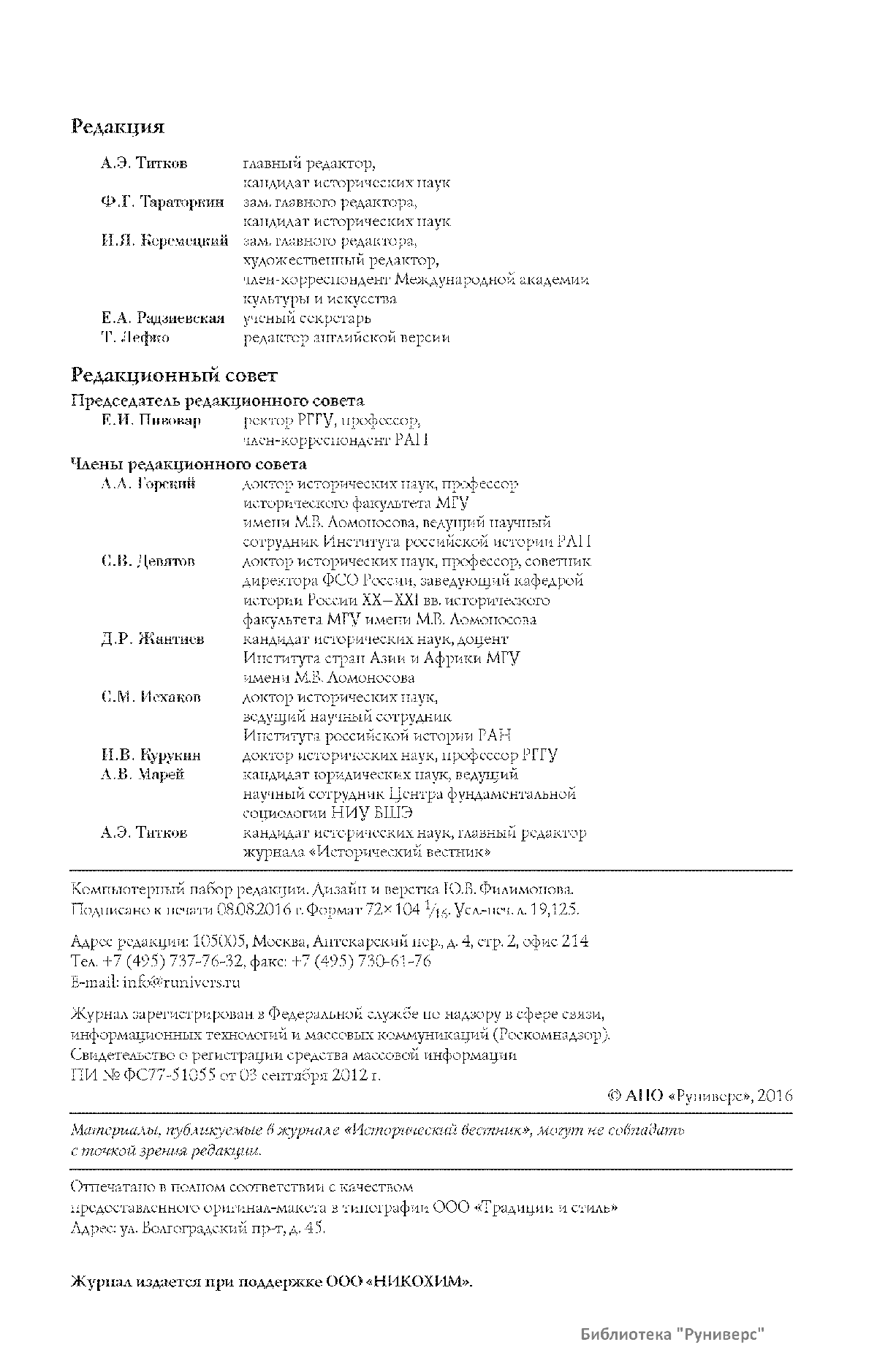 Дорогие коллеги, мы представляем вам первый номер «Исторического вестника», который одновременно обозначается 148-м томом, тем самым продолжая дореволюционное издание. Однако, перешагивая почти сто лет, мы понимаем, что реалии XXI века определяют и новое содержание журнала. История сегодня во многом актуализирована политикой. Именно геополитическая ситуация в мире, возвращающая нас к вопросам сохранения существующих границ, национальных и культурных ценностей, моральных и религиозных принципов, формирует еще одно измерение — проблему аутентичного исторического бытования народов и государств. С одной стороны, это вопрос географических ареалов государственных образований, с другой — тема, связанная с соприкосновением, взаимодействием процессов, культур и традиций. Во многом мы стоим и перед важнейшей этической проблемой. Мы должны не только вежливо и настойчиво указывать нашим уважаемым соседям на свои исторические права, но и сами уходить от искушения искусственного удревнения собственной истории или присвоения чужой. И здесь на сцену выходит его величество Исторический Научный Факт. Он и есть главный цензор и законодатель. На этом незыблемом основании будет строиться редакционная и научная работа «Исторического вестника».
