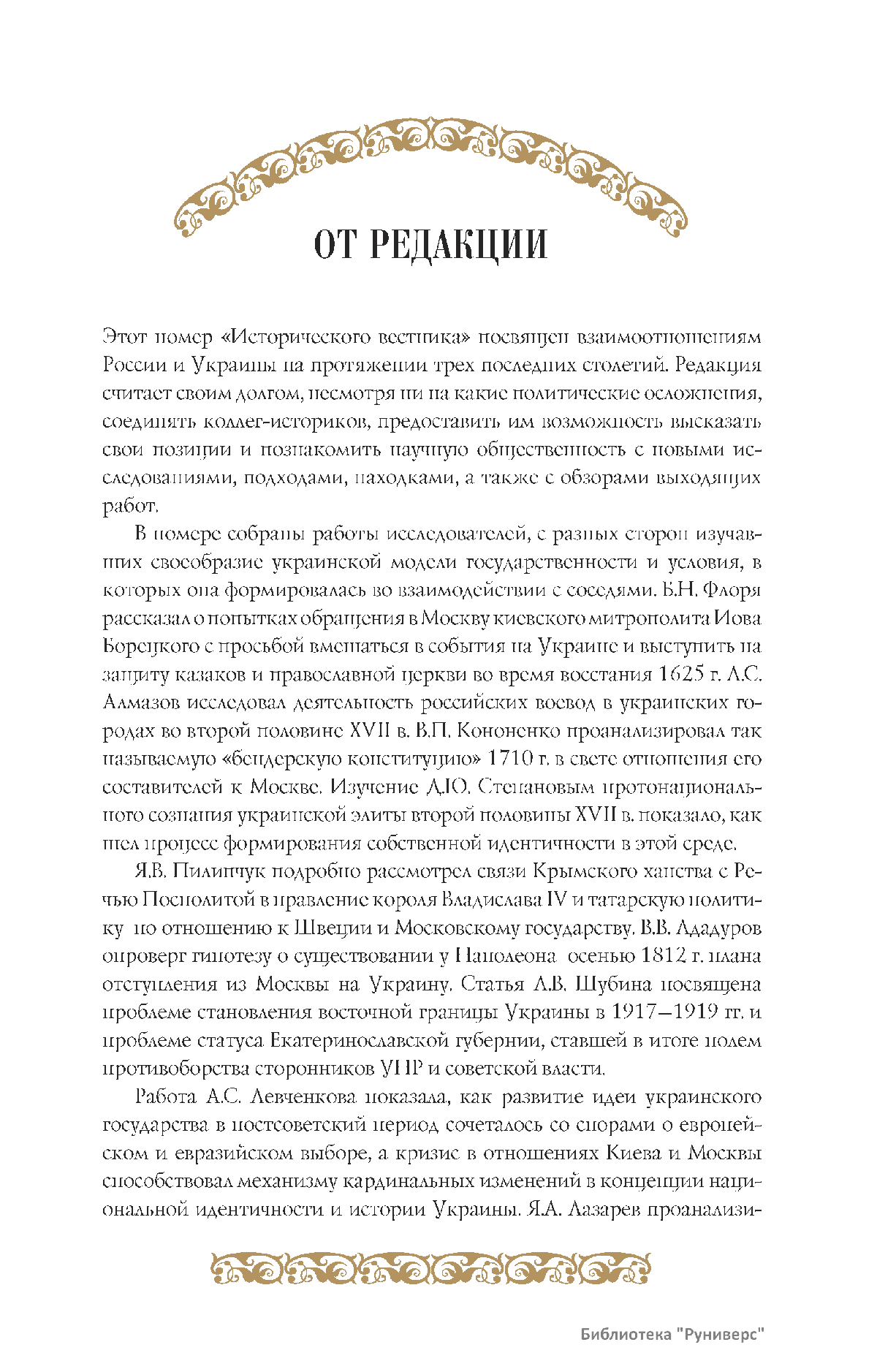 Дорогие коллеги, мы представляем вам первый номер «Исторического вестника», который одновременно обозначается 148-м томом, тем самым продолжая дореволюционное издание. Однако, перешагивая почти сто лет, мы понимаем, что реалии XXI века определяют и новое содержание журнала. История сегодня во многом актуализирована политикой. Именно геополитическая ситуация в мире, возвращающая нас к вопросам сохранения существующих границ, национальных и культурных ценностей, моральных и религиозных принципов, формирует еще одно измерение — проблему аутентичного исторического бытования народов и государств. С одной стороны, это вопрос географических ареалов государственных образований, с другой — тема, связанная с соприкосновением, взаимодействием процессов, культур и традиций. Во многом мы стоим и перед важнейшей этической проблемой. Мы должны не только вежливо и настойчиво указывать нашим уважаемым соседям на свои исторические права, но и сами уходить от искушения искусственного удревнения собственной истории или присвоения чужой. И здесь на сцену выходит его величество Исторический Научный Факт. Он и есть главный цензор и законодатель. На этом незыблемом основании будет строиться редакционная и научная работа «Исторического вестника».