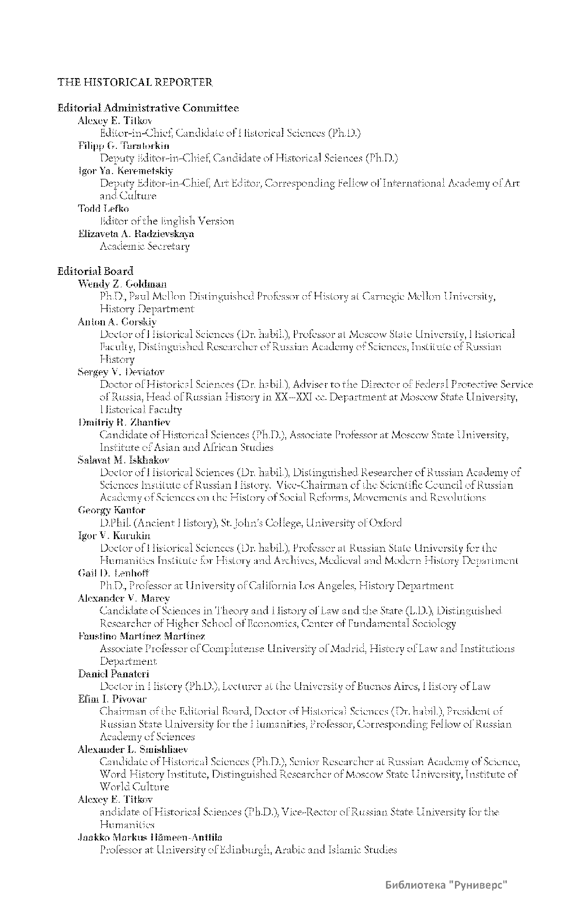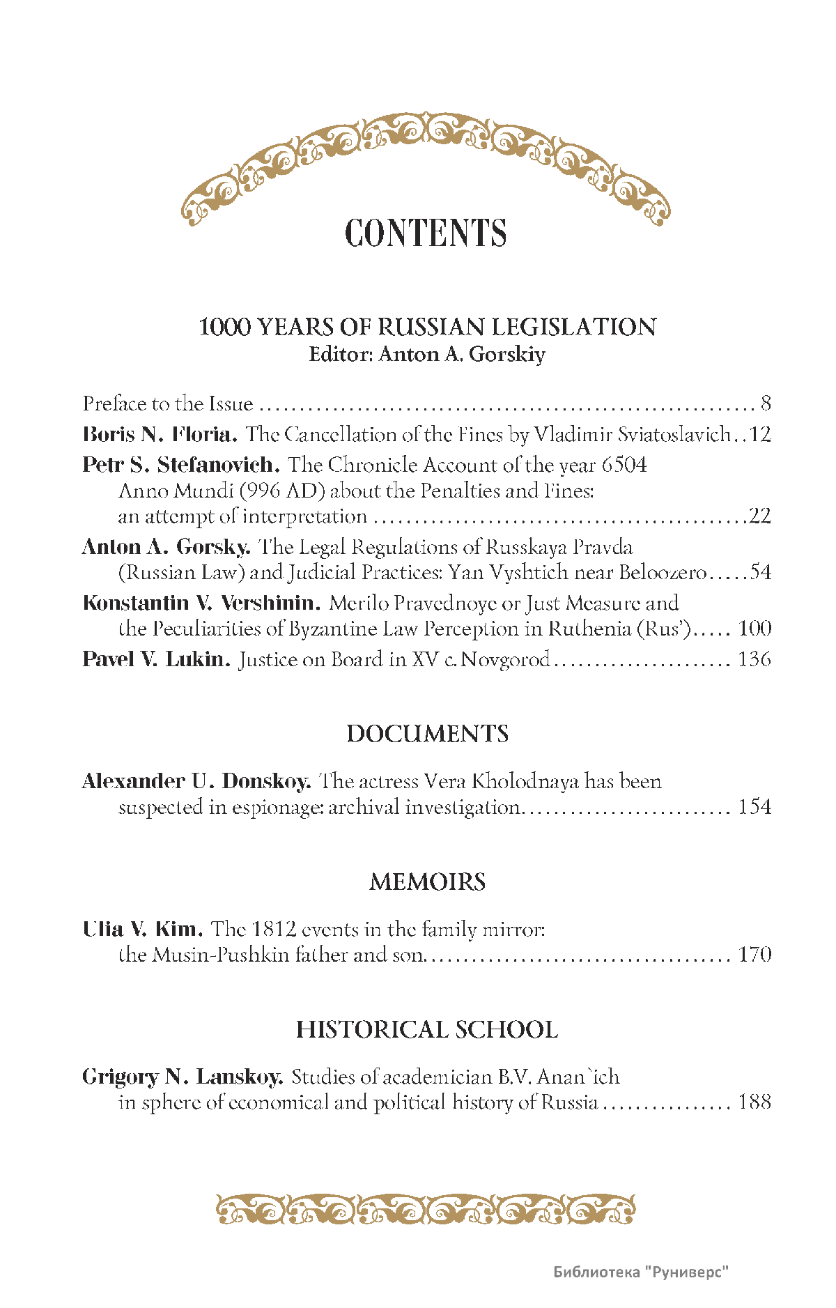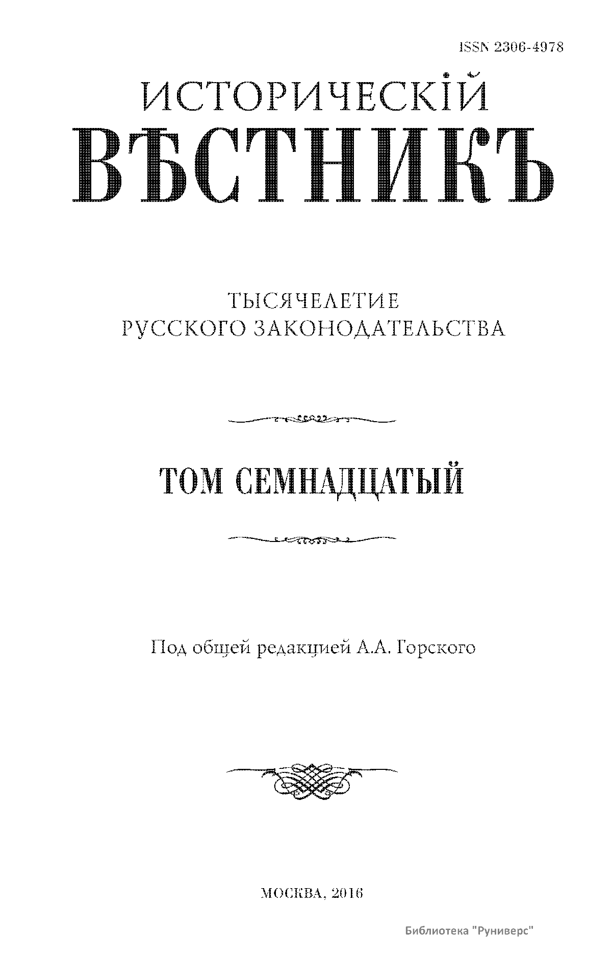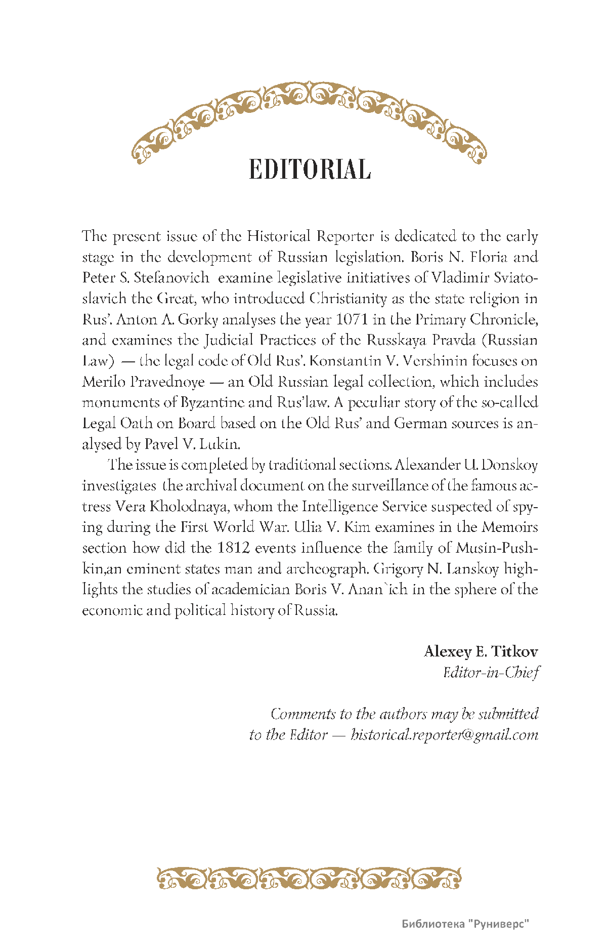 Дорогие коллеги, мы представляем вам первый номер «Исторического вестника», который одновременно обозначается 148-м томом, тем самым продолжая дореволюционное издание. Однако, перешагивая почти сто лет, мы понимаем, что реалии XXI века определяют и новое содержание журнала. История сегодня во многом актуализирована политикой. Именно геополитическая ситуация в мире, возвращающая нас к вопросам сохранения существующих границ, национальных и культурных ценностей, моральных и религиозных принципов, формирует еще одно измерение — проблему аутентичного исторического бытования народов и государств. С одной стороны, это вопрос географических ареалов государственных образований, с другой — тема, связанная с соприкосновением, взаимодействием процессов, культур и традиций. Во многом мы стоим и перед важнейшей этической проблемой. Мы должны не только вежливо и настойчиво указывать нашим уважаемым соседям на свои исторические права, но и сами уходить от искушения искусственного удревнения собственной истории или присвоения чужой. И здесь на сцену выходит его величество Исторический Научный Факт. Он и есть главный цензор и законодатель. На этом незыблемом основании будет строиться редакционная и научная работа «Исторического вестника».