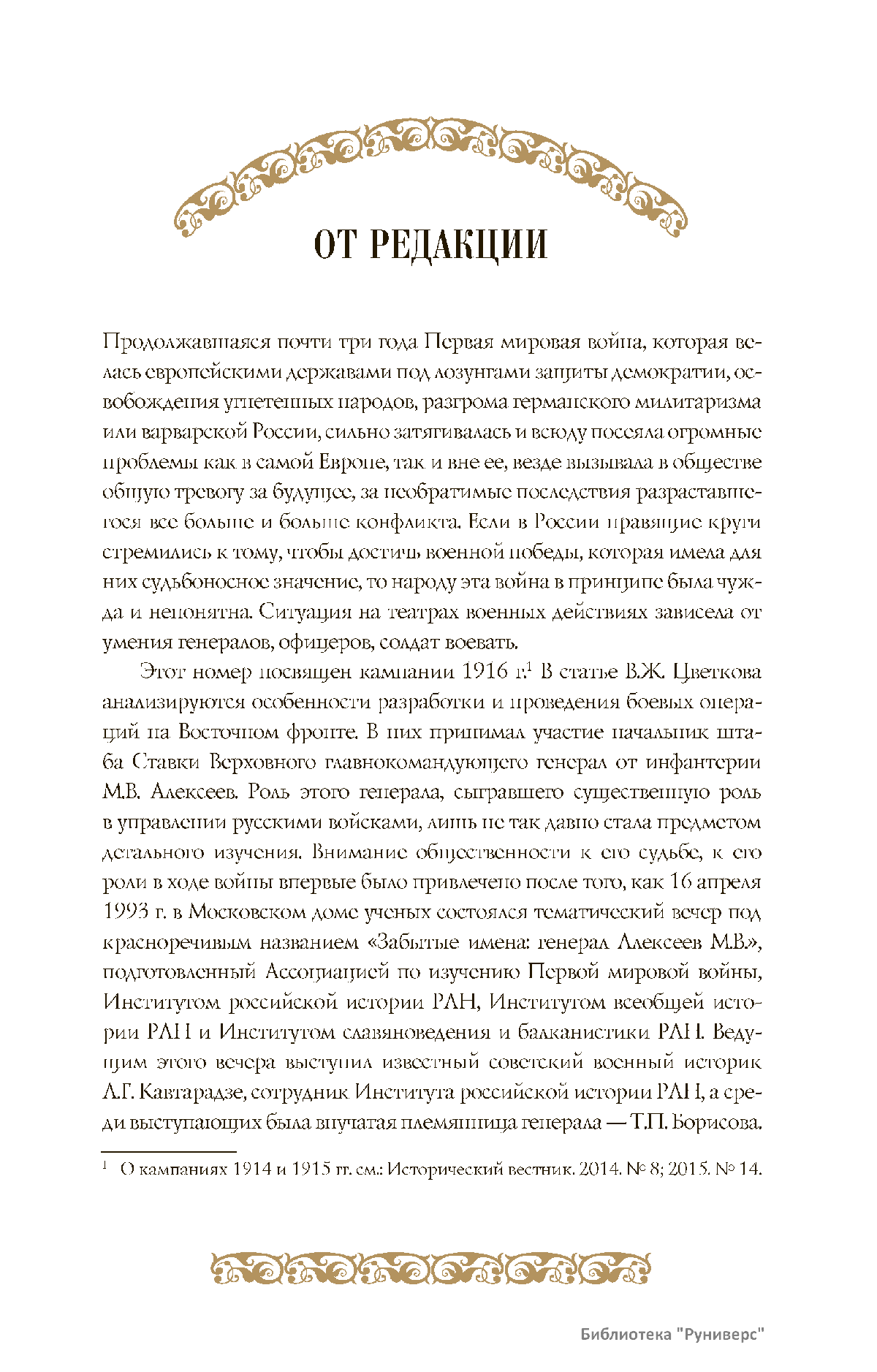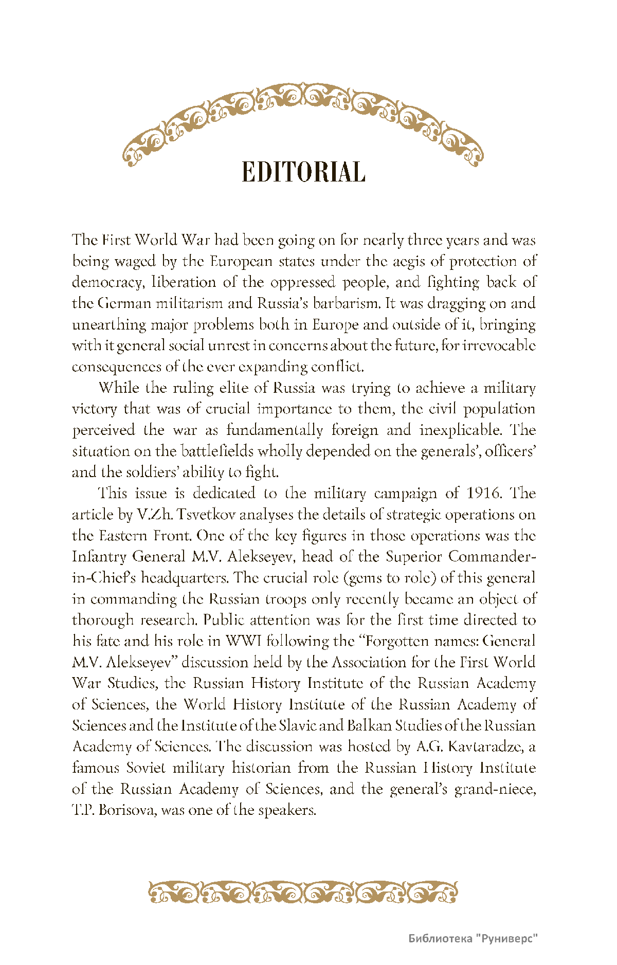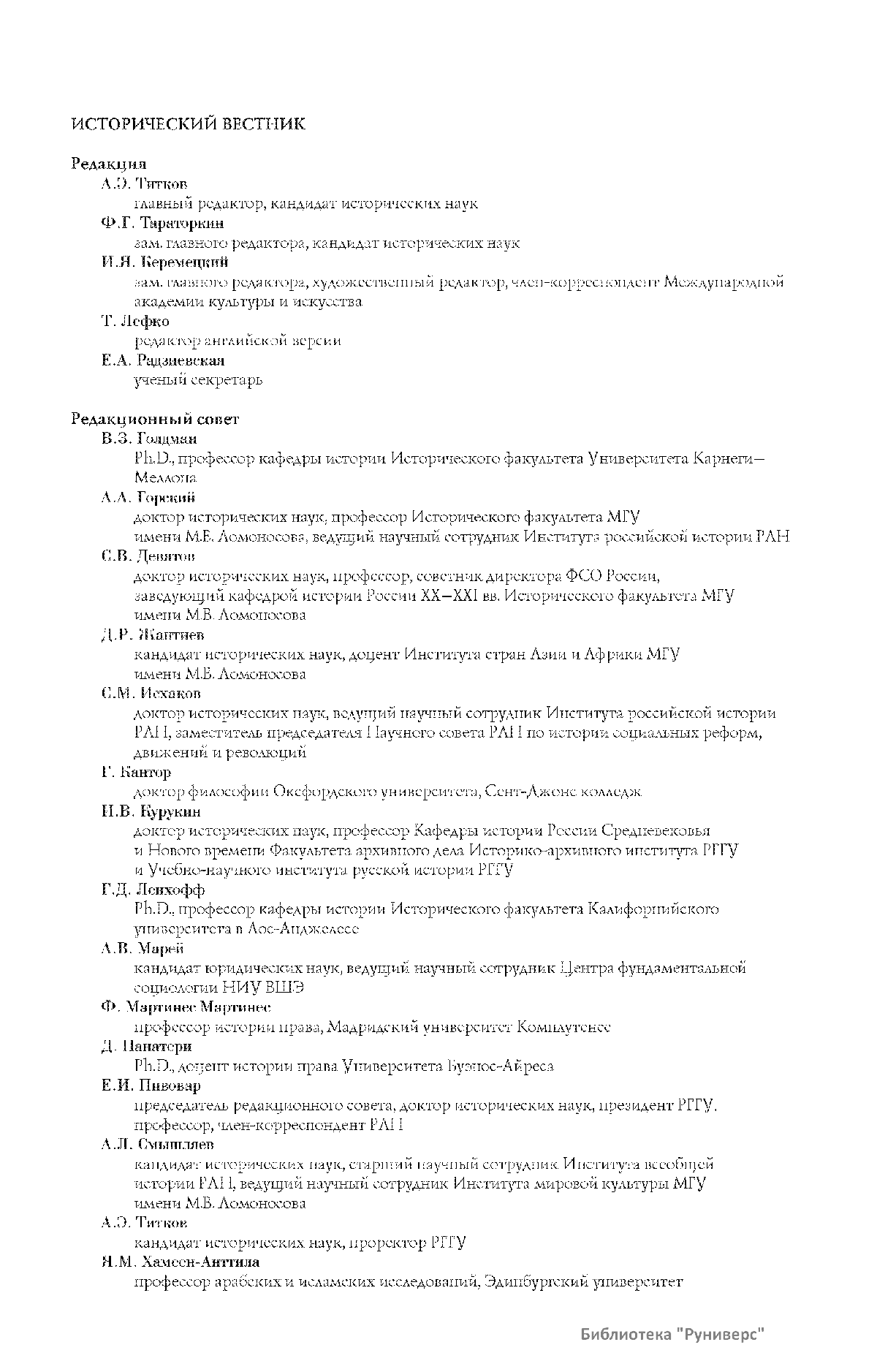 Дорогие коллеги, мы представляем вам первый номер «Исторического вестника», который одновременно обозначается 148-м томом, тем самым продолжая дореволюционное издание. Однако, перешагивая почти сто лет, мы понимаем, что реалии XXI века определяют и новое содержание журнала. История сегодня во многом актуализирована политикой. Именно геополитическая ситуация в мире, возвращающая нас к вопросам сохранения существующих границ, национальных и культурных ценностей, моральных и религиозных принципов, формирует еще одно измерение — проблему аутентичного исторического бытования народов и государств. С одной стороны, это вопрос географических ареалов государственных образований, с другой — тема, связанная с соприкосновением, взаимодействием процессов, культур и традиций. Во многом мы стоим и перед важнейшей этической проблемой. Мы должны не только вежливо и настойчиво указывать нашим уважаемым соседям на свои исторические права, но и сами уходить от искушения искусственного удревнения собственной истории или присвоения чужой. И здесь на сцену выходит его величество Исторический Научный Факт. Он и есть главный цензор и законодатель. На этом незыблемом основании будет строиться редакционная и научная работа «Исторического вестника».