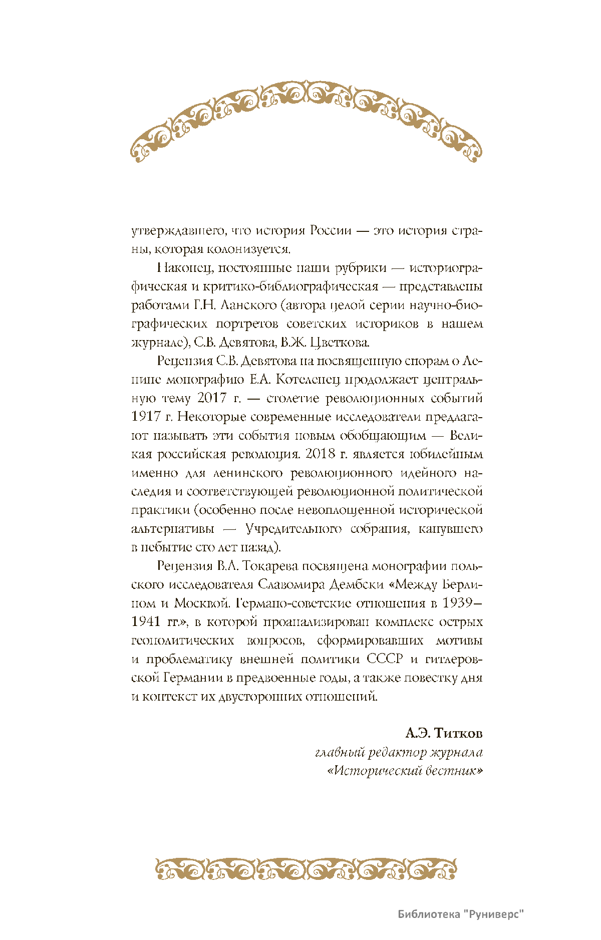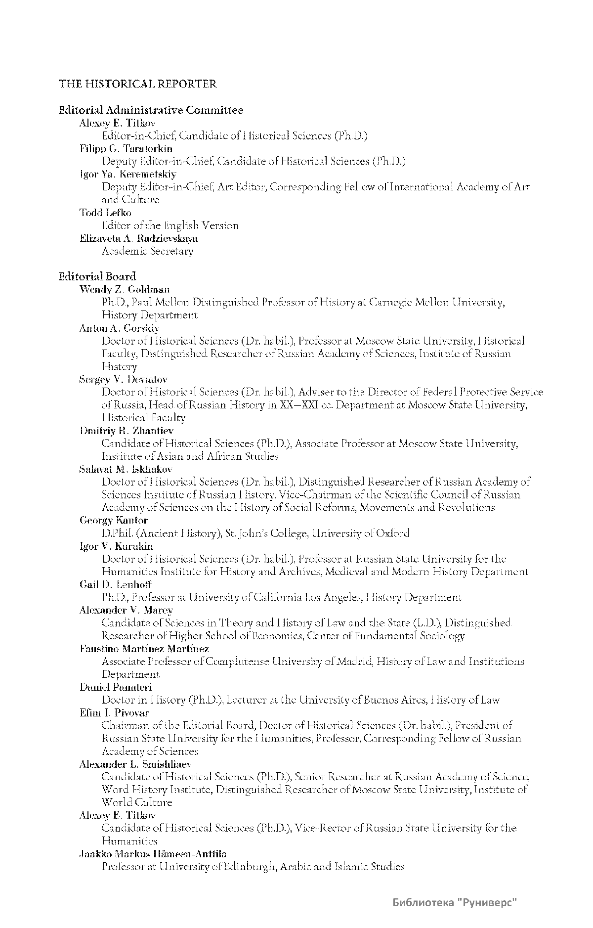 Дорогие коллеги, мы представляем вам первый номер «Исторического вестника», который одновременно обозначается 148-м томом, тем самым продолжая дореволюционное издание. Однако, перешагивая почти сто лет, мы понимаем, что реалии XXI века определяют и новое содержание журнала. История сегодня во многом актуализирована политикой. Именно геополитическая ситуация в мире, возвращающая нас к вопросам сохранения существующих границ, национальных и культурных ценностей, моральных и религиозных принципов, формирует еще одно измерение — проблему аутентичного исторического бытования народов и государств. С одной стороны, это вопрос географических ареалов государственных образований, с другой — тема, связанная с соприкосновением, взаимодействием процессов, культур и традиций. Во многом мы стоим и перед важнейшей этической проблемой. Мы должны не только вежливо и настойчиво указывать нашим уважаемым соседям на свои исторические права, но и сами уходить от искушения искусственного удревнения собственной истории или присвоения чужой. И здесь на сцену выходит его величество Исторический Научный Факт. Он и есть главный цензор и законодатель. На этом незыблемом основании будет строиться редакционная и научная работа «Исторического вестника».