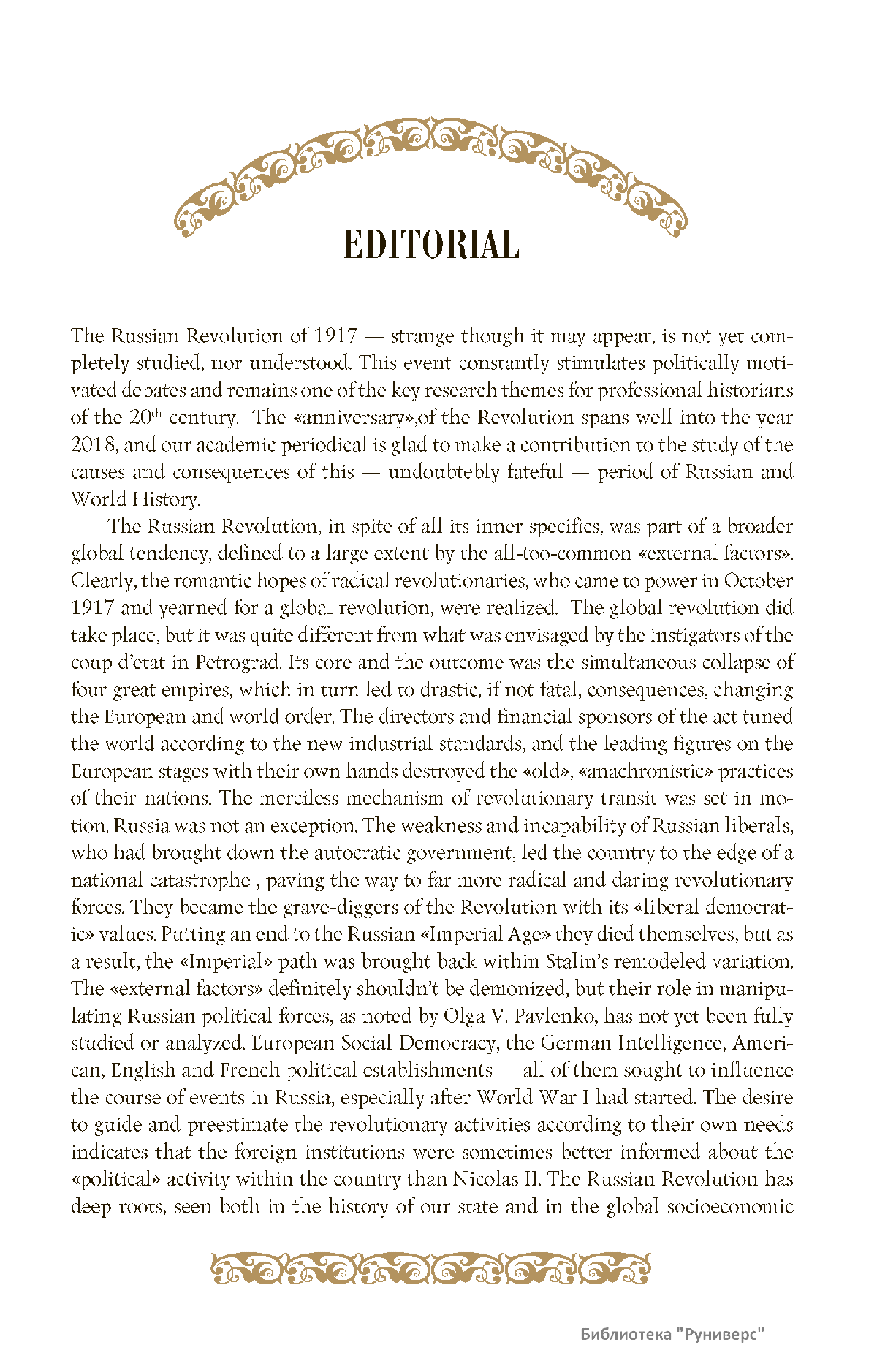 Дорогие коллеги, мы представляем вам первый номер «Исторического вестника», который одновременно обозначается 148-м томом, тем самым продолжая дореволюционное издание. Однако, перешагивая почти сто лет, мы понимаем, что реалии XXI века определяют и новое содержание журнала. История сегодня во многом актуализирована политикой. Именно геополитическая ситуация в мире, возвращающая нас к вопросам сохранения существующих границ, национальных и культурных ценностей, моральных и религиозных принципов, формирует еще одно измерение — проблему аутентичного исторического бытования народов и государств. С одной стороны, это вопрос географических ареалов государственных образований, с другой — тема, связанная с соприкосновением, взаимодействием процессов, культур и традиций. Во многом мы стоим и перед важнейшей этической проблемой. Мы должны не только вежливо и настойчиво указывать нашим уважаемым соседям на свои исторические права, но и сами уходить от искушения искусственного удревнения собственной истории или присвоения чужой. И здесь на сцену выходит его величество Исторический Научный Факт. Он и есть главный цензор и законодатель. На этом незыблемом основании будет строиться редакционная и научная работа «Исторического вестника».