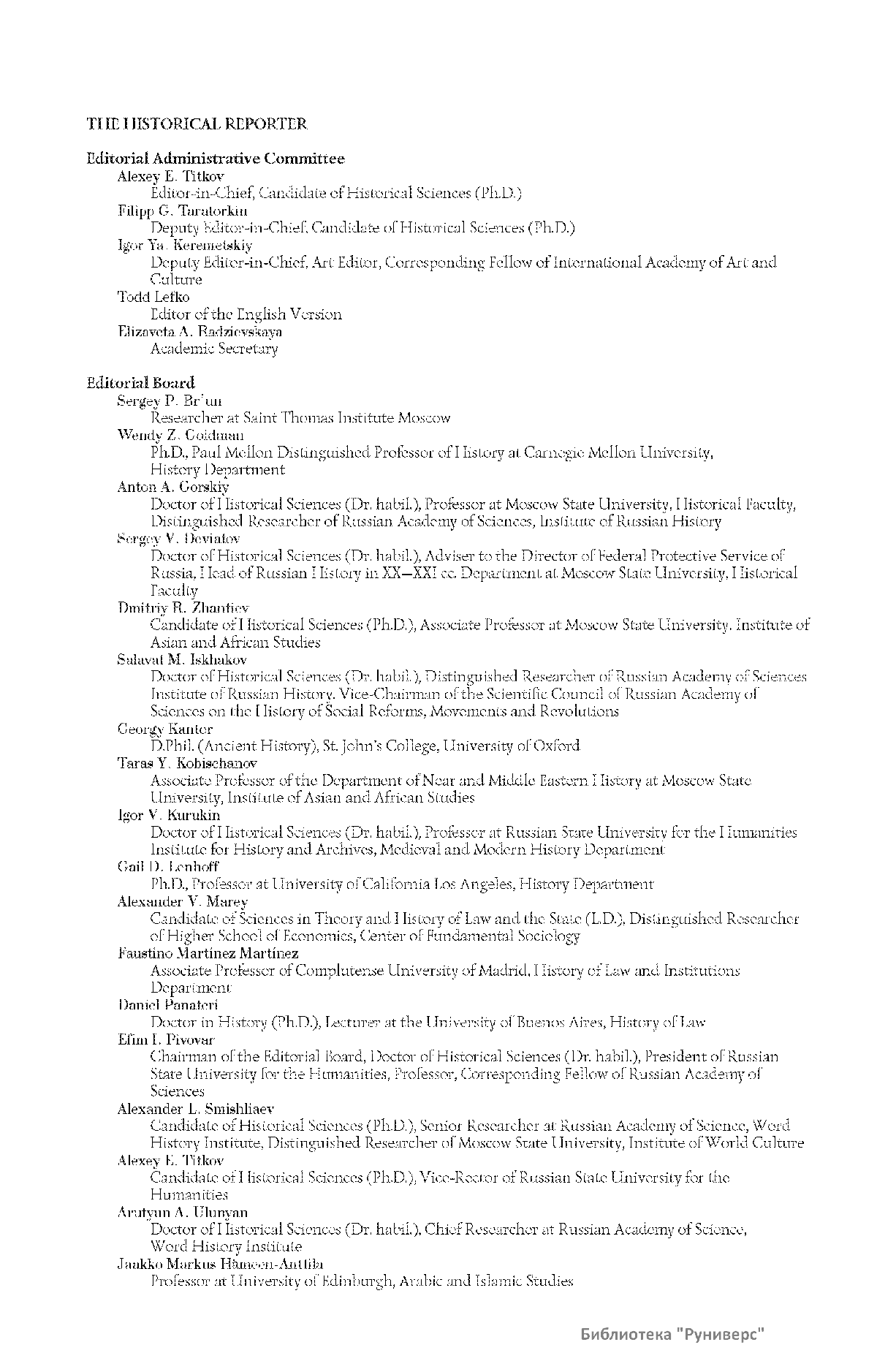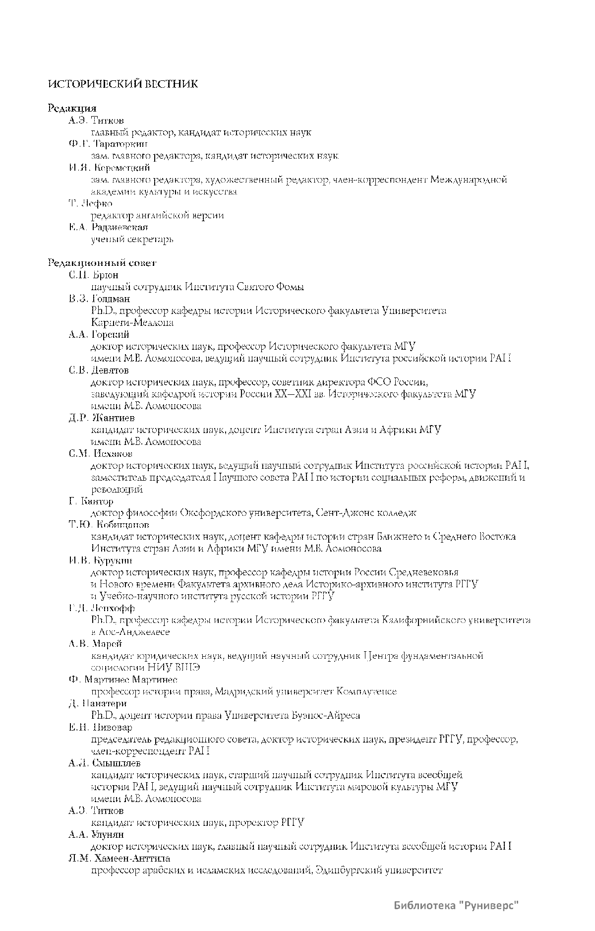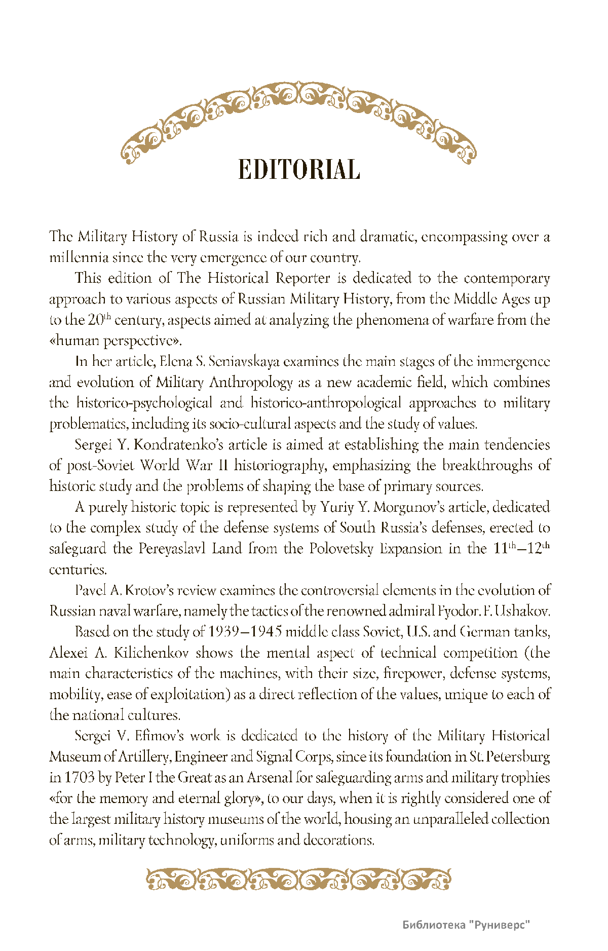 Дорогие коллеги, мы представляем вам первый номер «Исторического вестника», который одновременно обозначается 148-м томом, тем самым продолжая дореволюционное издание. Однако, перешагивая почти сто лет, мы понимаем, что реалии XXI века определяют и новое содержание журнала. История сегодня во многом актуализирована политикой. Именно геополитическая ситуация в мире, возвращающая нас к вопросам сохранения существующих границ, национальных и культурных ценностей, моральных и религиозных принципов, формирует еще одно измерение — проблему аутентичного исторического бытования народов и государств. С одной стороны, это вопрос географических ареалов государственных образований, с другой — тема, связанная с соприкосновением, взаимодействием процессов, культур и традиций. Во многом мы стоим и перед важнейшей этической проблемой. Мы должны не только вежливо и настойчиво указывать нашим уважаемым соседям на свои исторические права, но и сами уходить от искушения искусственного удревнения собственной истории или присвоения чужой. И здесь на сцену выходит его величество Исторический Научный Факт. Он и есть главный цензор и законодатель. На этом незыблемом основании будет строиться редакционная и научная работа «Исторического вестника».