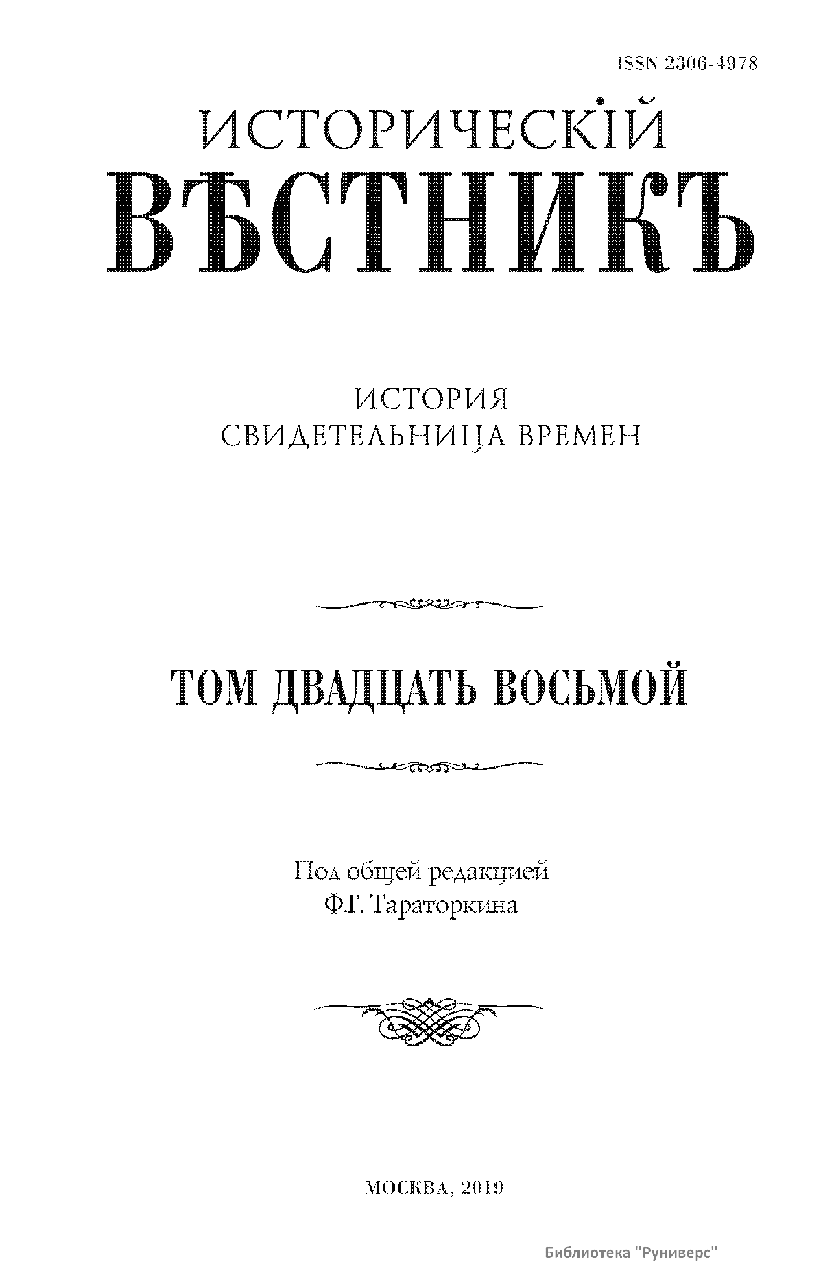 Дорогие коллеги, мы представляем вам первый номер «Исторического вестника», который одновременно обозначается 148-м томом, тем самым продолжая дореволюционное издание. Однако, перешагивая почти сто лет, мы понимаем, что реалии XXI века определяют и новое содержание журнала. История сегодня во многом актуализирована политикой. Именно геополитическая ситуация в мире, возвращающая нас к вопросам сохранения существующих границ, национальных и культурных ценностей, моральных и религиозных принципов, формирует еще одно измерение — проблему аутентичного исторического бытования народов и государств. С одной стороны, это вопрос географических ареалов государственных образований, с другой — тема, связанная с соприкосновением, взаимодействием процессов, культур и традиций. Во многом мы стоим и перед важнейшей этической проблемой. Мы должны не только вежливо и настойчиво указывать нашим уважаемым соседям на свои исторические права, но и сами уходить от искушения искусственного удревнения собственной истории или присвоения чужой. И здесь на сцену выходит его величество Исторический Научный Факт. Он и есть главный цензор и законодатель. На этом незыблемом основании будет строиться редакционная и научная работа «Исторического вестника».