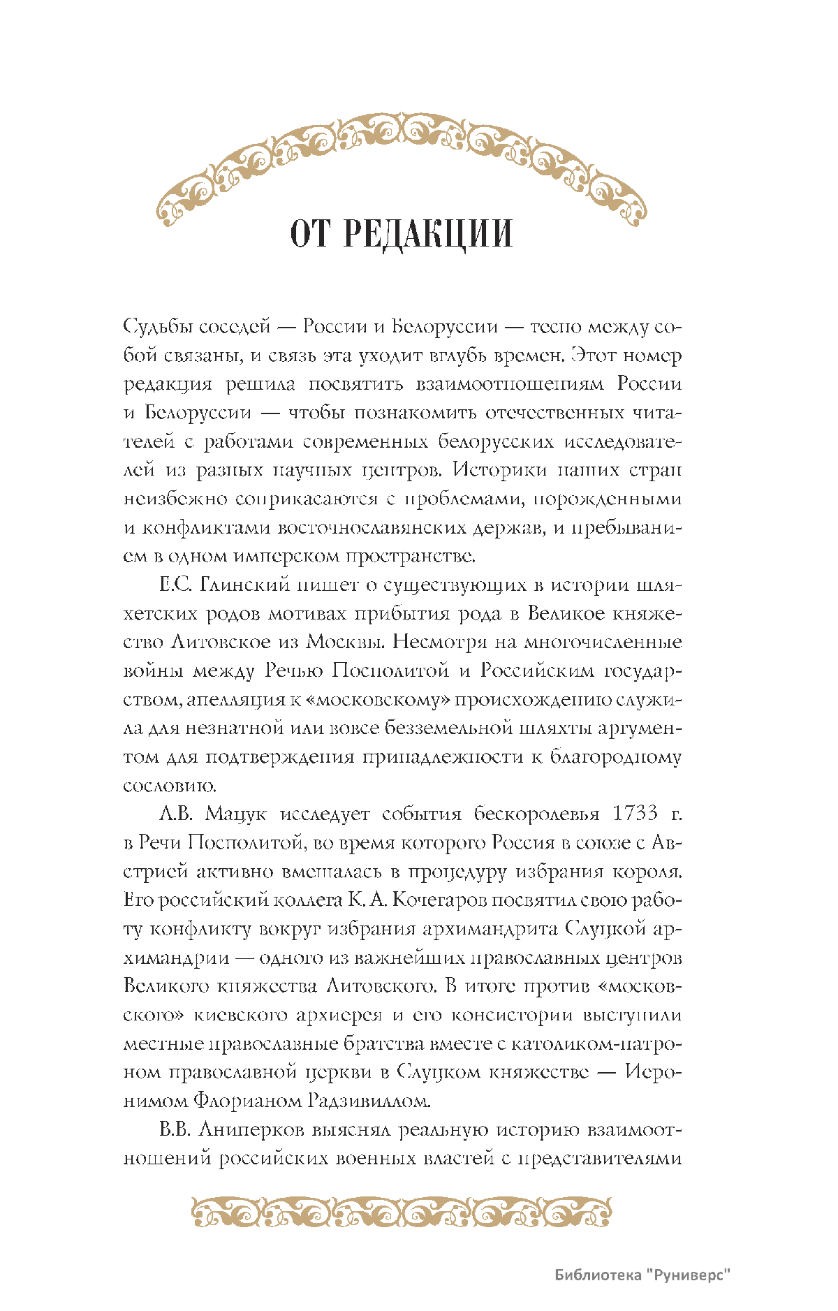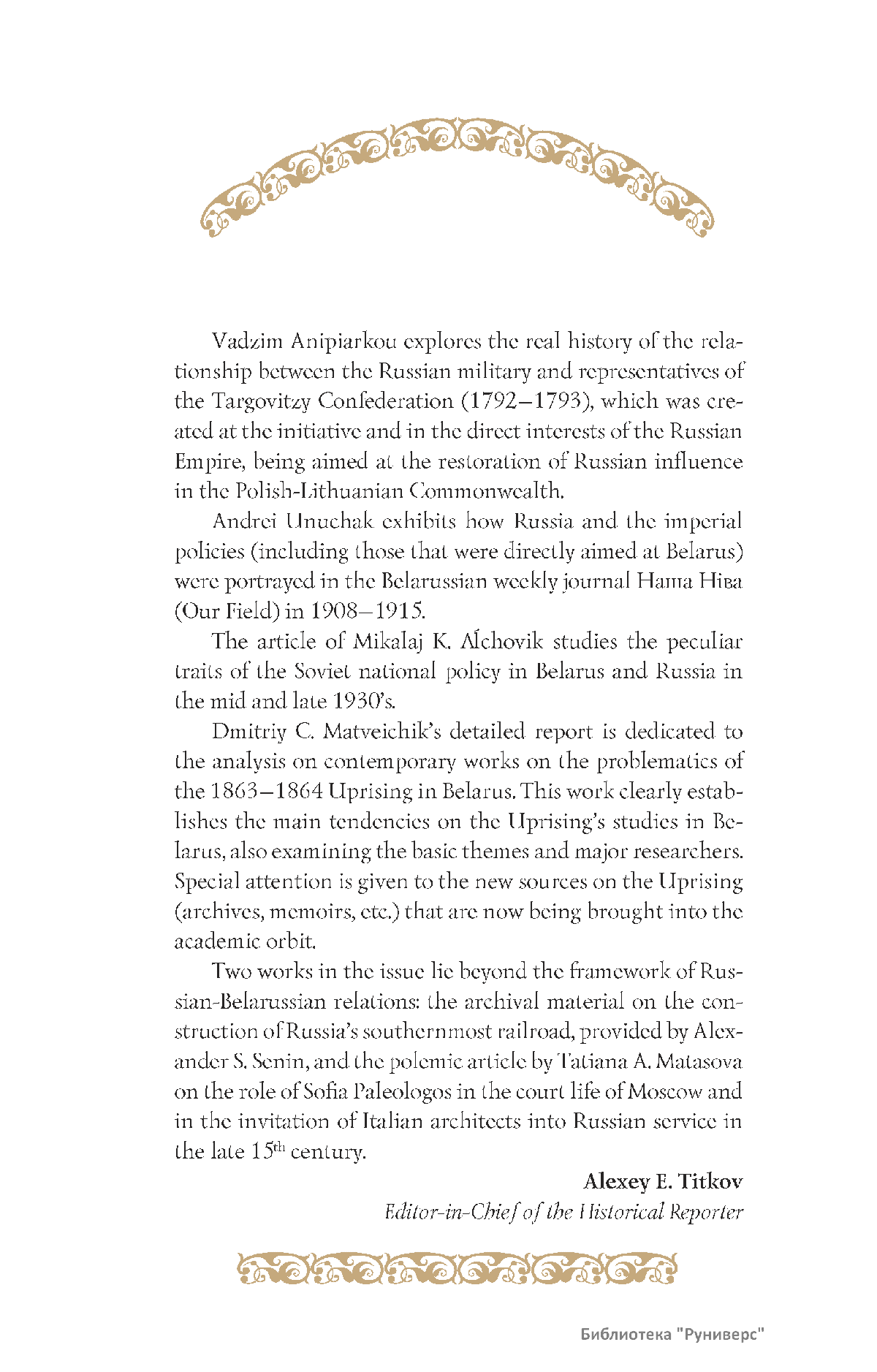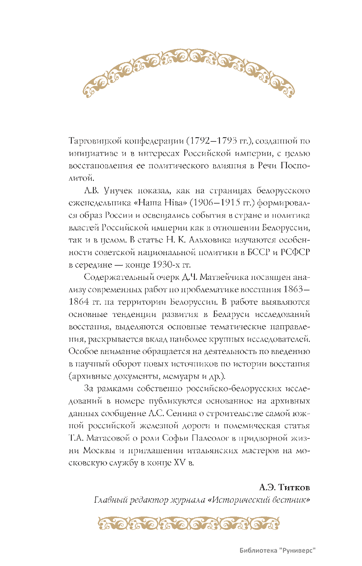 Дорогие коллеги, мы представляем вам первый номер «Исторического вестника», который одновременно обозначается 148-м томом, тем самым продолжая дореволюционное издание. Однако, перешагивая почти сто лет, мы понимаем, что реалии XXI века определяют и новое содержание журнала. История сегодня во многом актуализирована политикой. Именно геополитическая ситуация в мире, возвращающая нас к вопросам сохранения существующих границ, национальных и культурных ценностей, моральных и религиозных принципов, формирует еще одно измерение — проблему аутентичного исторического бытования народов и государств. С одной стороны, это вопрос географических ареалов государственных образований, с другой — тема, связанная с соприкосновением, взаимодействием процессов, культур и традиций. Во многом мы стоим и перед важнейшей этической проблемой. Мы должны не только вежливо и настойчиво указывать нашим уважаемым соседям на свои исторические права, но и сами уходить от искушения искусственного удревнения собственной истории или присвоения чужой. И здесь на сцену выходит его величество Исторический Научный Факт. Он и есть главный цензор и законодатель. На этом незыблемом основании будет строиться редакционная и научная работа «Исторического вестника».