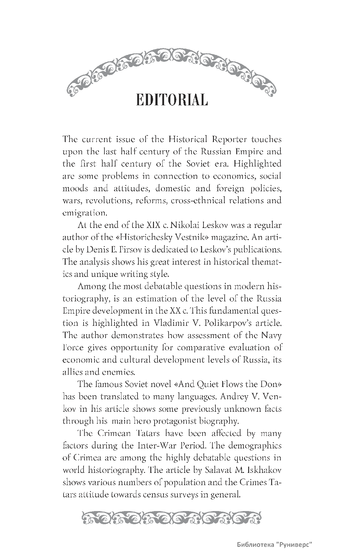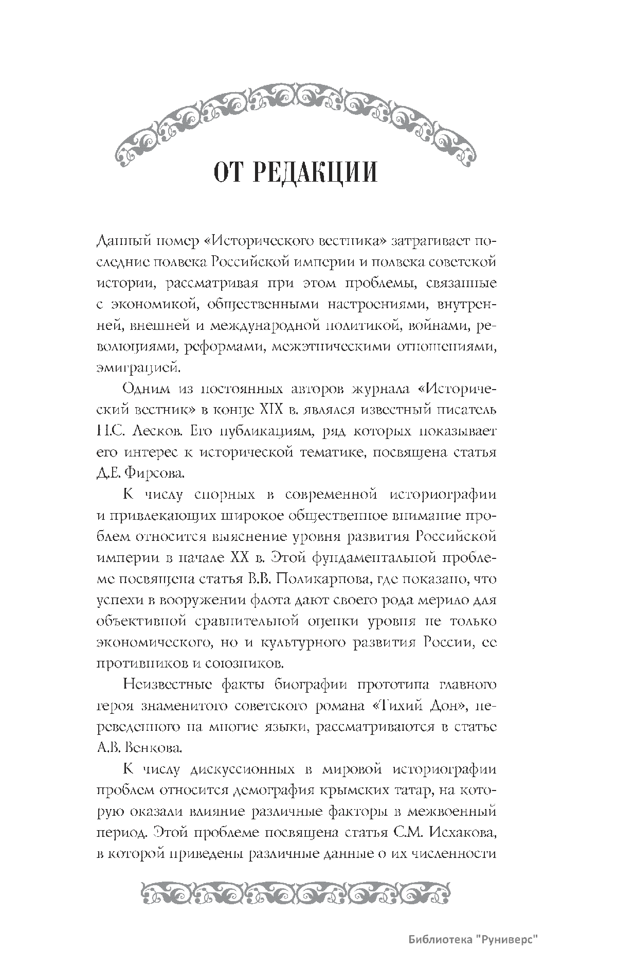Дорогие коллеги, мы представляем вам первый номер «Исторического вестника», который одновременно обозначается 148-м томом, тем самым продолжая дореволюционное издание. Однако, перешагивая почти сто лет, мы понимаем, что реалии XXI века определяют и новое содержание журнала. История сегодня во многом актуализирована политикой. Именно геополитическая ситуация в мире, возвращающая нас к вопросам сохранения существующих границ, национальных и культурных ценностей, моральных и религиозных принципов, формирует еще одно измерение — проблему аутентичного исторического бытования народов и государств. С одной стороны, это вопрос географических ареалов государственных образований, с другой — тема, связанная с соприкосновением, взаимодействием процессов, культур и традиций. Во многом мы стоим и перед важнейшей этической проблемой. Мы должны не только вежливо и настойчиво указывать нашим уважаемым соседям на свои исторические права, но и сами уходить от искушения искусственного удревнения собственной истории или присвоения чужой. И здесь на сцену выходит его величество Исторический Научный Факт. Он и есть главный цензор и законодатель. На этом незыблемом основании будет строиться редакционная и научная работа «Исторического вестника».