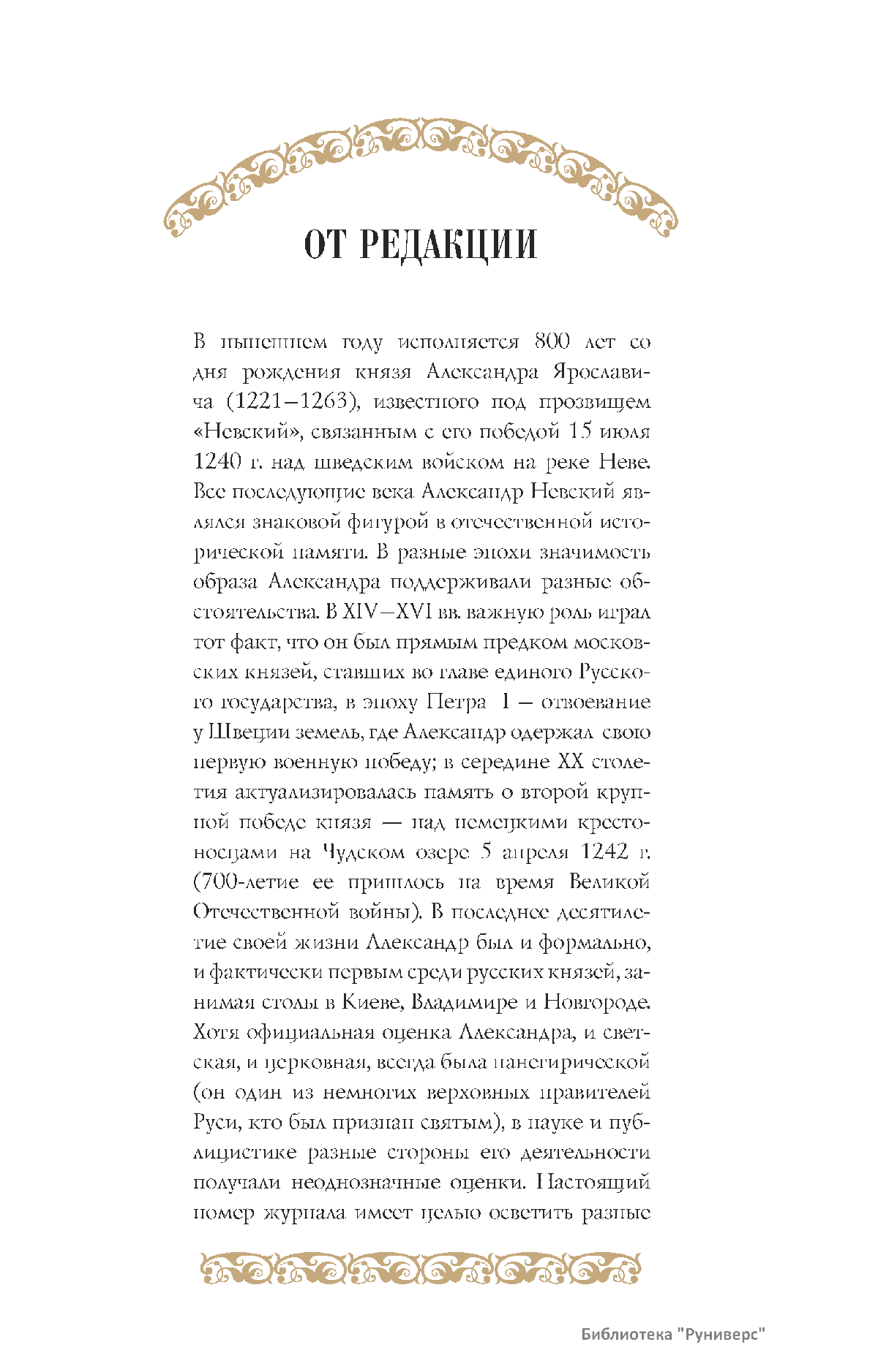 Дорогие коллеги, мы представляем вам первый номер «Исторического вестника», который одновременно обозначается 148-м томом, тем самым продолжая дореволюционное издание. Однако, перешагивая почти сто лет, мы понимаем, что реалии XXI века определяют и новое содержание журнала. История сегодня во многом актуализирована политикой. Именно геополитическая ситуация в мире, возвращающая нас к вопросам сохранения существующих границ, национальных и культурных ценностей, моральных и религиозных принципов, формирует еще одно измерение — проблему аутентичного исторического бытования народов и государств. С одной стороны, это вопрос географических ареалов государственных образований, с другой — тема, связанная с соприкосновением, взаимодействием процессов, культур и традиций. Во многом мы стоим и перед важнейшей этической проблемой. Мы должны не только вежливо и настойчиво указывать нашим уважаемым соседям на свои исторические права, но и сами уходить от искушения искусственного удревнения собственной истории или присвоения чужой. И здесь на сцену выходит его величество Исторический Научный Факт. Он и есть главный цензор и законодатель. На этом незыблемом основании будет строиться редакционная и научная работа «Исторического вестника».