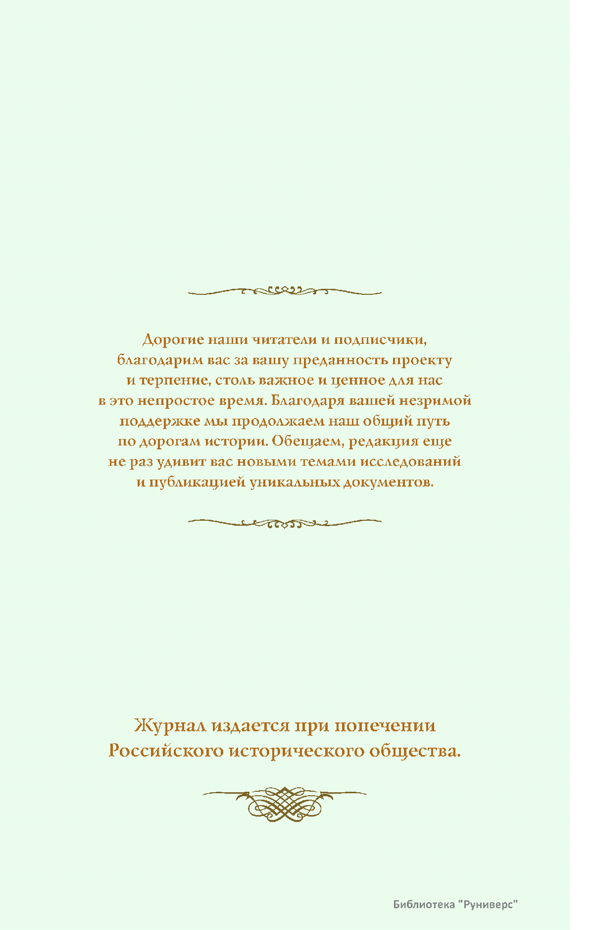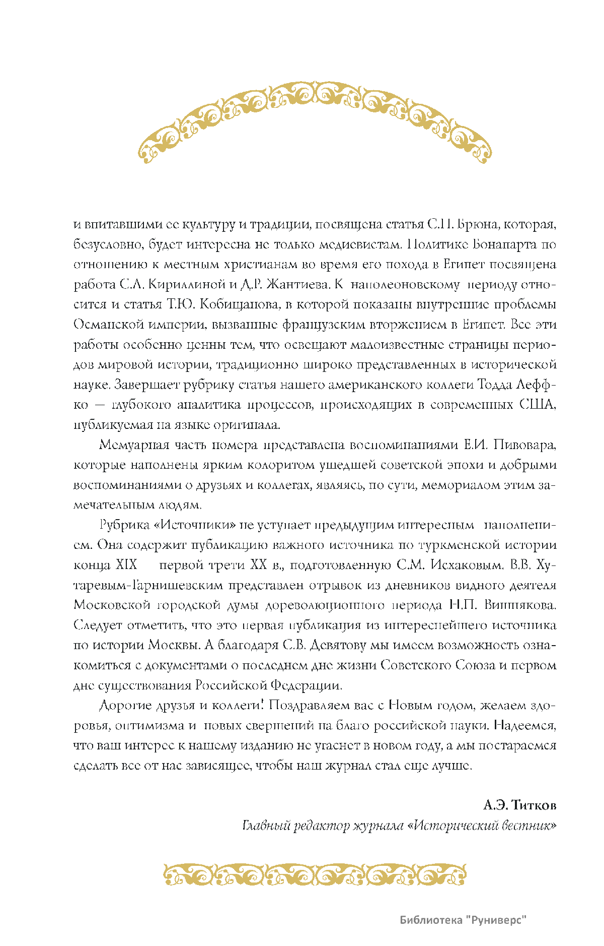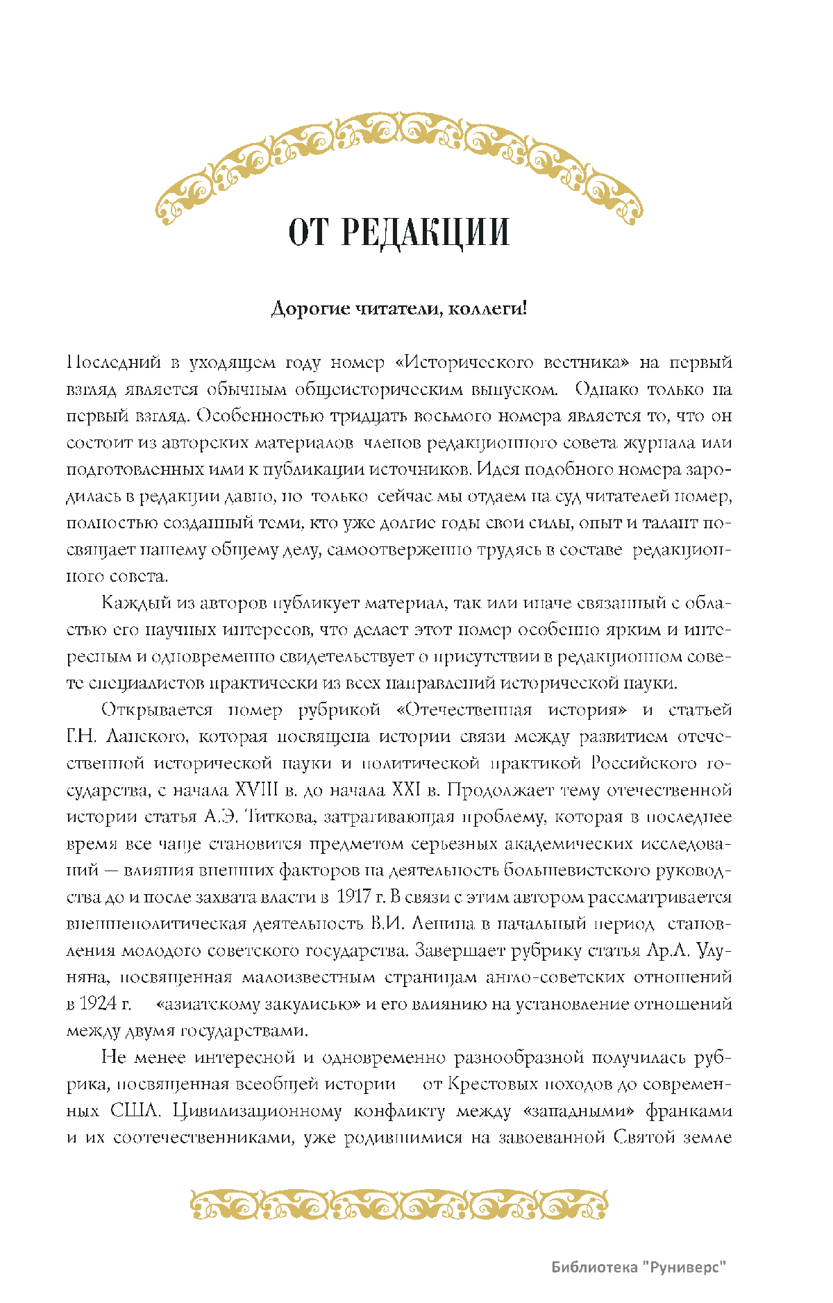 Дорогие коллеги, мы представляем вам первый номер «Исторического вестника», который одновременно обозначается 148-м томом, тем самым продолжая дореволюционное издание. Однако, перешагивая почти сто лет, мы понимаем, что реалии XXI века определяют и новое содержание журнала. История сегодня во многом актуализирована политикой. Именно геополитическая ситуация в мире, возвращающая нас к вопросам сохранения существующих границ, национальных и культурных ценностей, моральных и религиозных принципов, формирует еще одно измерение — проблему аутентичного исторического бытования народов и государств. С одной стороны, это вопрос географических ареалов государственных образований, с другой — тема, связанная с соприкосновением, взаимодействием процессов, культур и традиций. Во многом мы стоим и перед важнейшей этической проблемой. Мы должны не только вежливо и настойчиво указывать нашим уважаемым соседям на свои исторические права, но и сами уходить от искушения искусственного удревнения собственной истории или присвоения чужой. И здесь на сцену выходит его величество Исторический Научный Факт. Он и есть главный цензор и законодатель. На этом незыблемом основании будет строиться редакционная и научная работа «Исторического вестника».