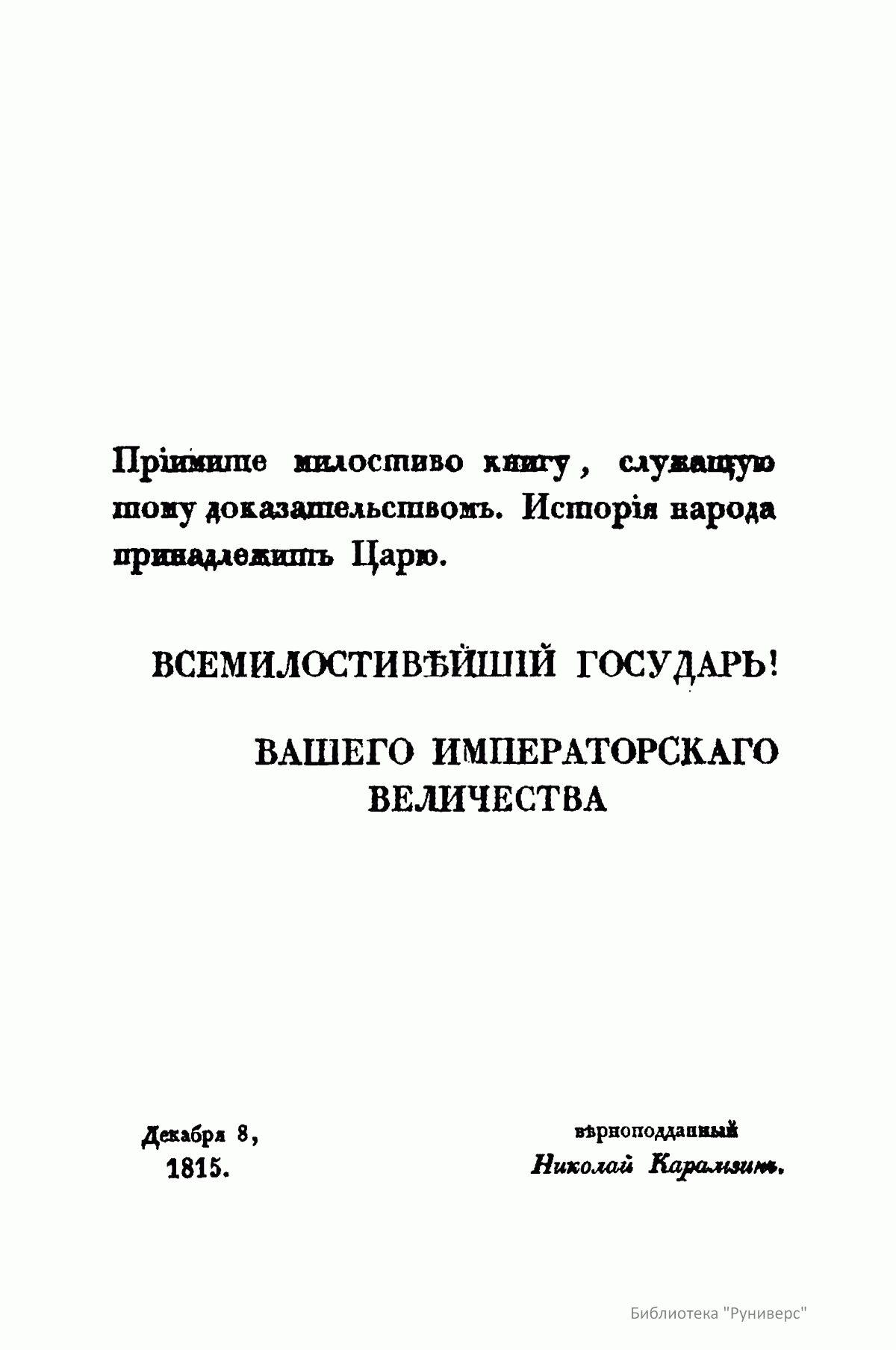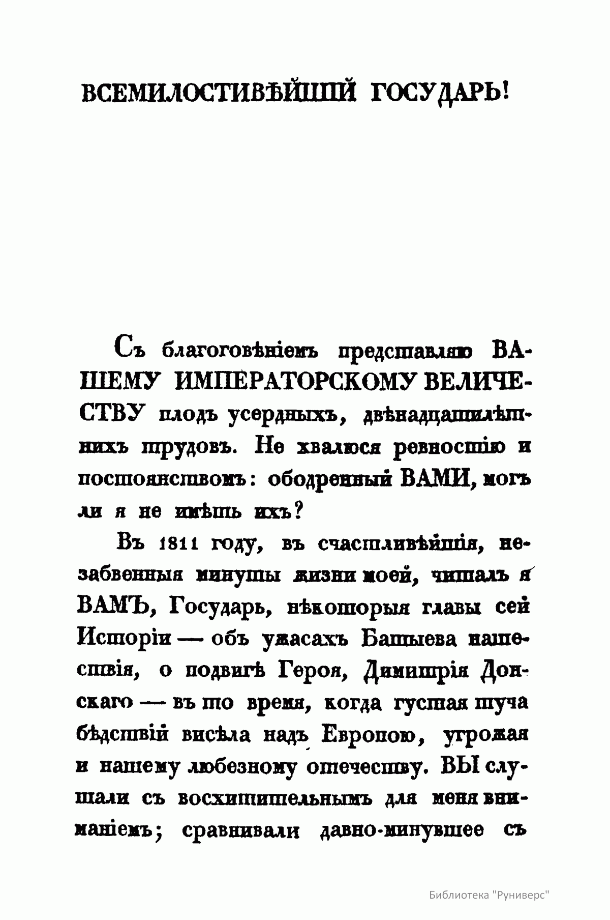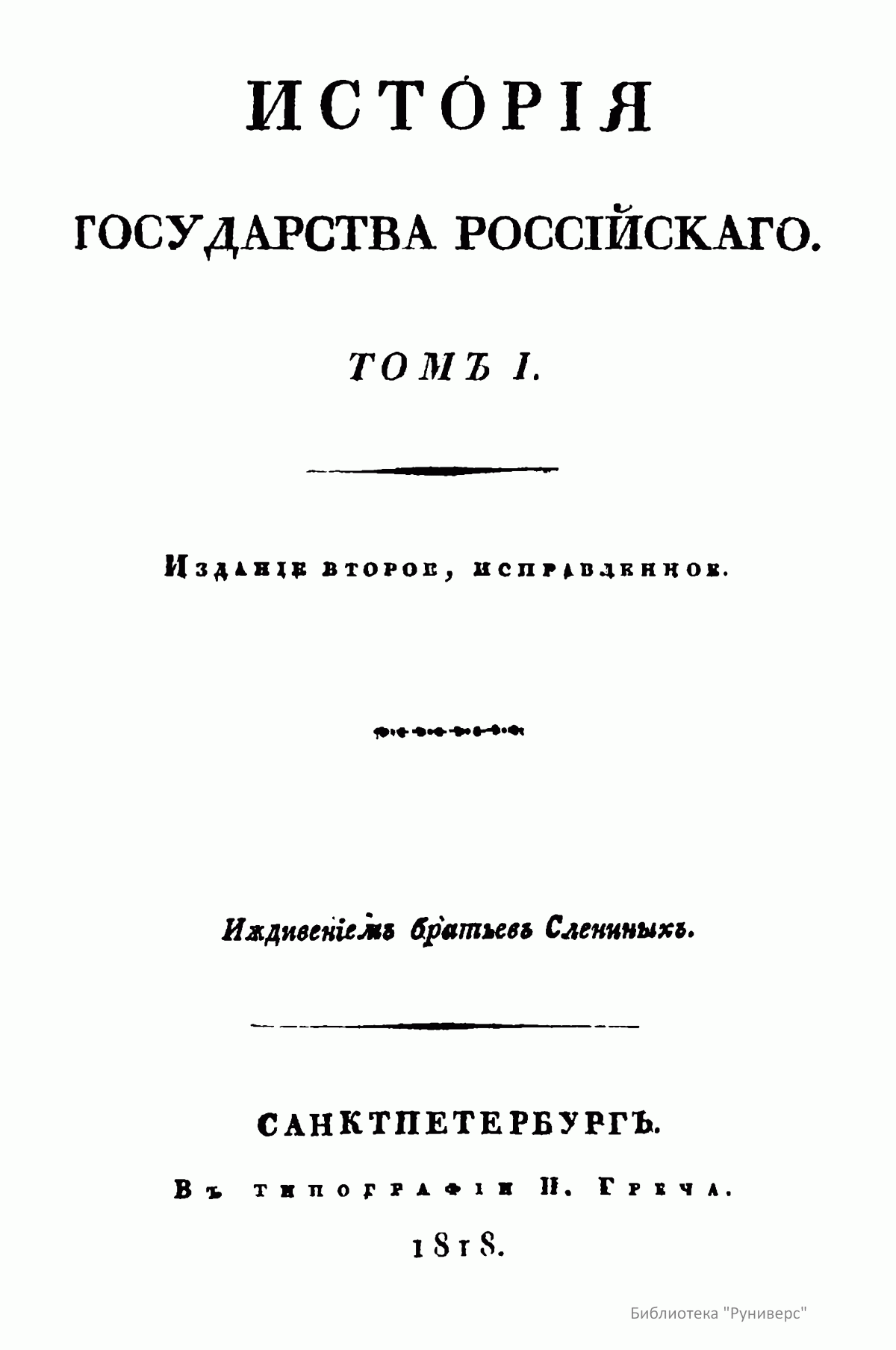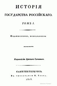 В 1816 году он выпустил первые восемь томов «Истории государства Российского», трёхтысячный тираж которых разошелся в течение месяца. В последующие годы вышли еще три тома «Истории», появился ряд переводов её на главнейшие европейские языки. Тенденциозно-монархическое освещение русского исторического процесса сблизило Карамзина с двором и царем, поселившим его подле себя в Царском Селе. Незаконченный XII том был издан уже после его смерти.