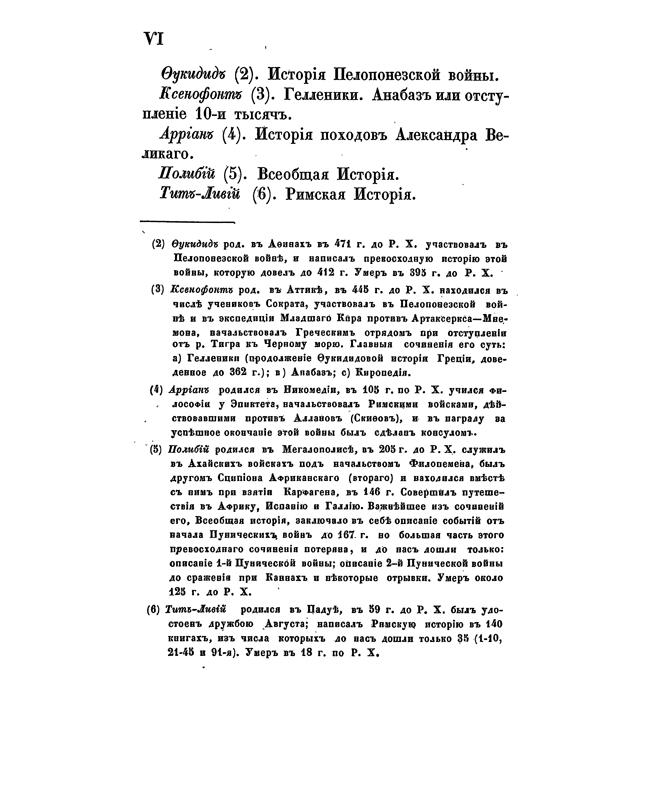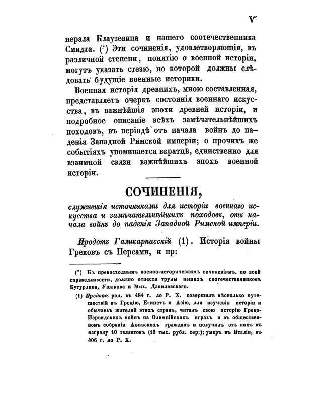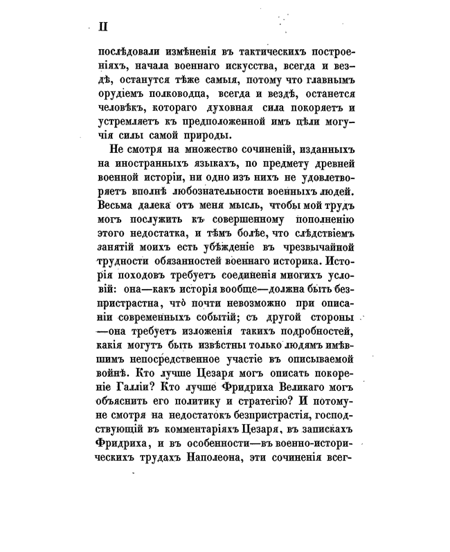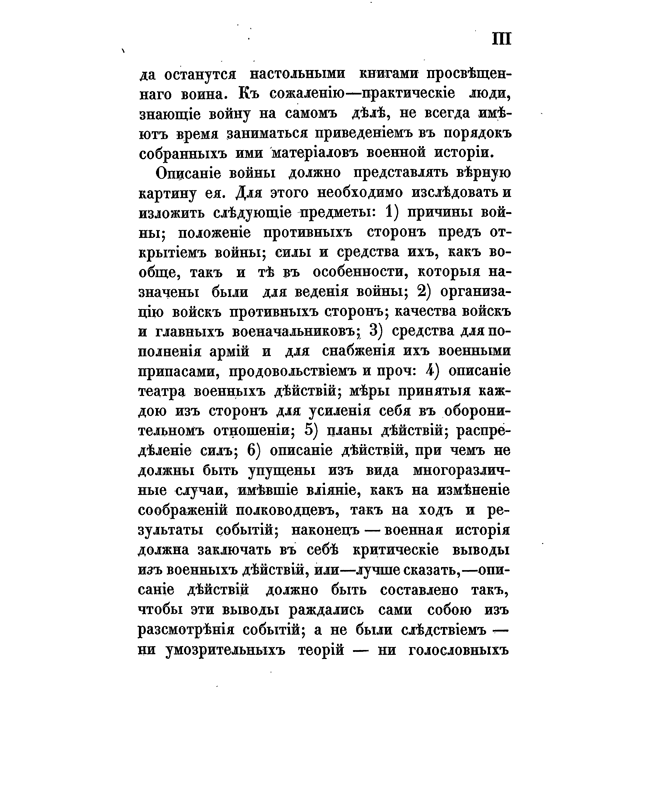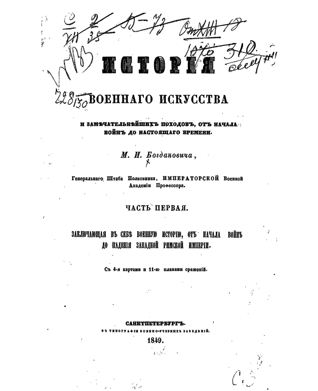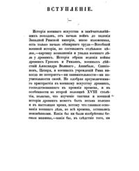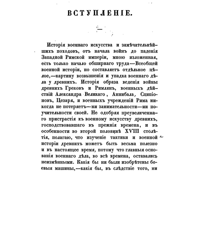 Автор рассматривает только те военные события, которые имели влияние на судьбу народов исторического мира или развитие военного искусства. В истории военного искусства он выделяет следующие периоды: Греческий – от Троянской войны (1194 – 1184 до Р. Х.) до покорения Римлянами Греции (146 г. до Р. Х.); Римский – от основания Рима (754 г. до Р. Х.) до падения Западной Римской империи (476 г. по Р. Х.); период постепенного возрождения военного искусства – от падения Западной Римской империи до Густава Адольфа или начала 30-летней войны (1618 г.); период новейшей военной истории – от начала 30-летней войны до настоящего времени. Период новейшей военной истории в издание не вошел.