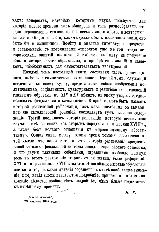 Первые тома вышли в начале девяностых годов 19 века и, посвященные- один «переходу от средних веков к новому времени», другой — «реформации и политической жизни в XVI и XVII вв.», третий — «XVIII веку и революции», — возникли из читанных им общих курсов новой истории, имевших своей целью выяснить значение двух главных переворотов в жизни европейского Запада за последние четыре века, т.е., реформации и революции — в связи с общим характером новой истории с её отличием от средневековой. Однако, позднее, Кареев решился раздвинуть границы первых задач и довести повествание до современнго ему положения дел.