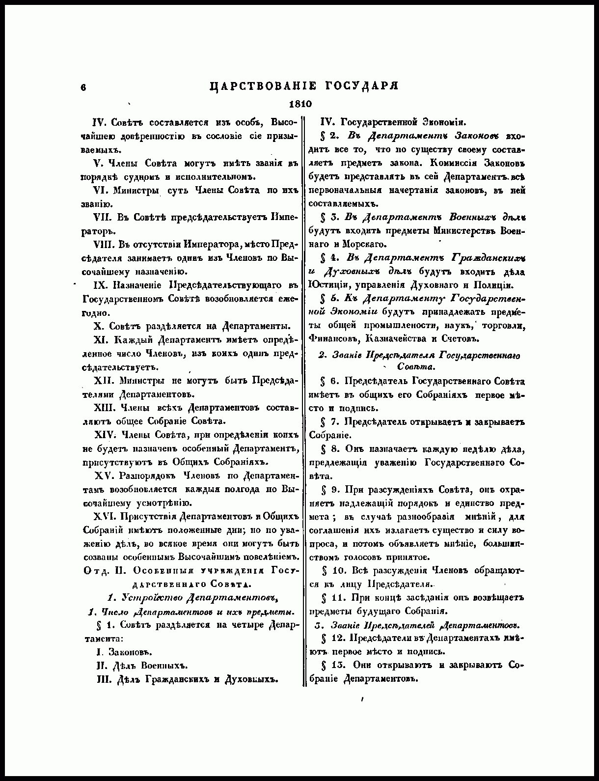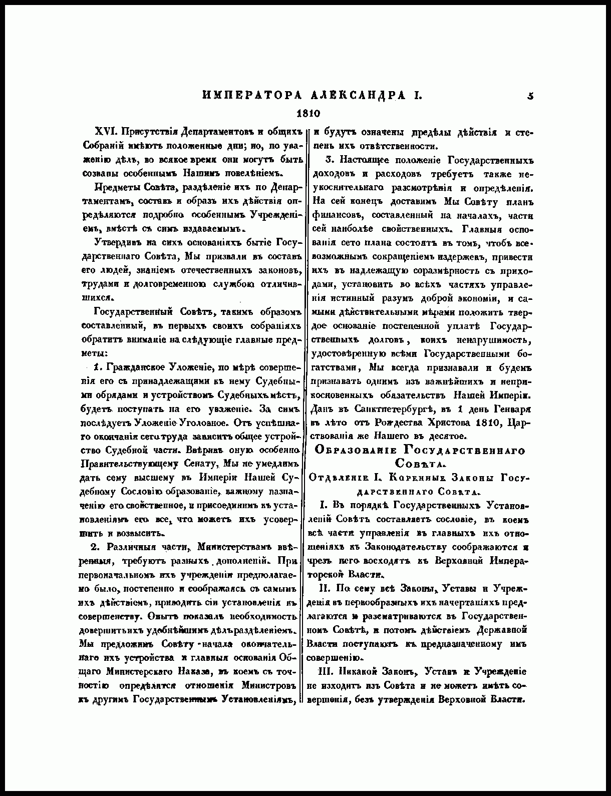 Первое издание 1830 г., составленное под руководством М. М. Сперанского, включает более 30 тысяч законодательных актов с 1649 по 1825 г (45 томов) — время правления Алексея Михайловича — Александра I (33 тома).